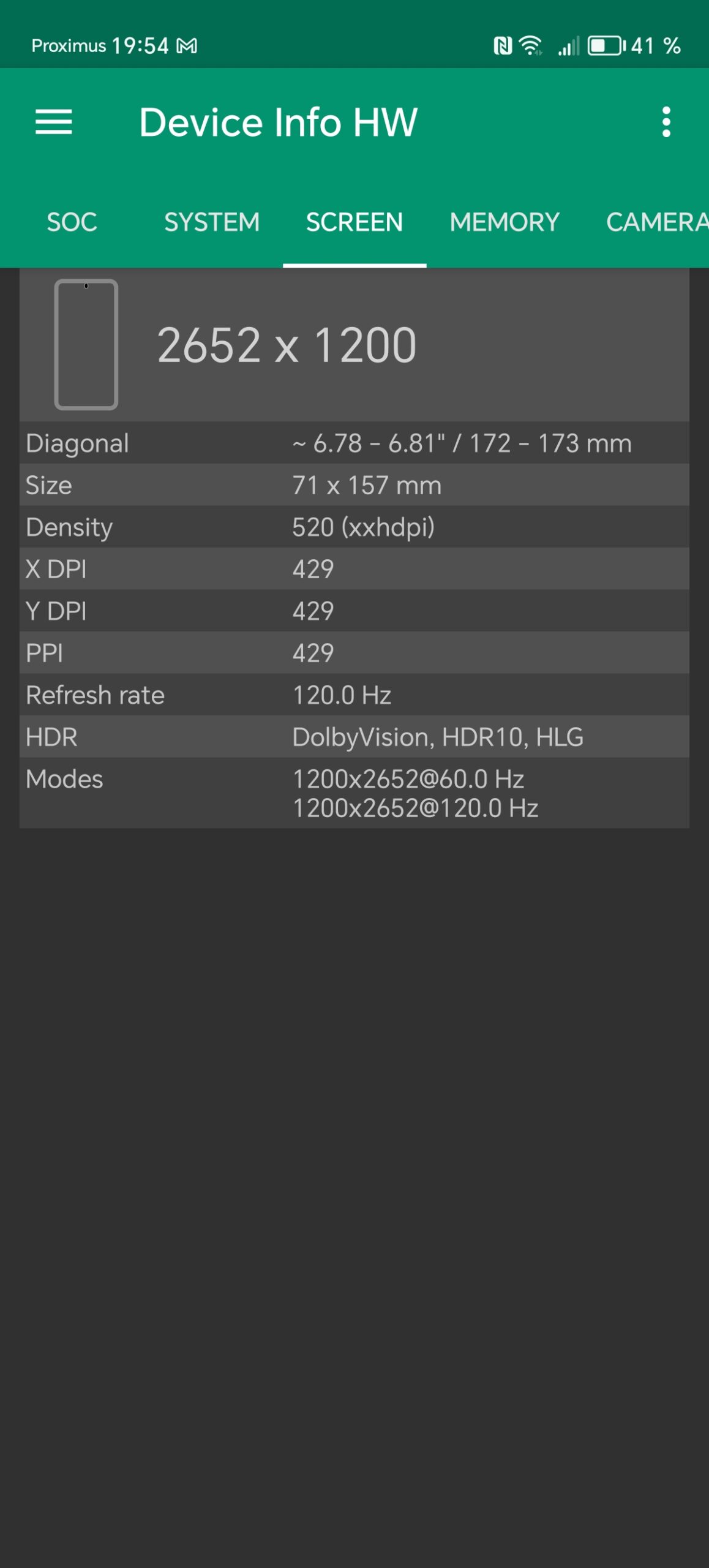 - résolution atypique de l'écran avec 1080x2652 avec un taux de rafraichissement de 120 Mhz