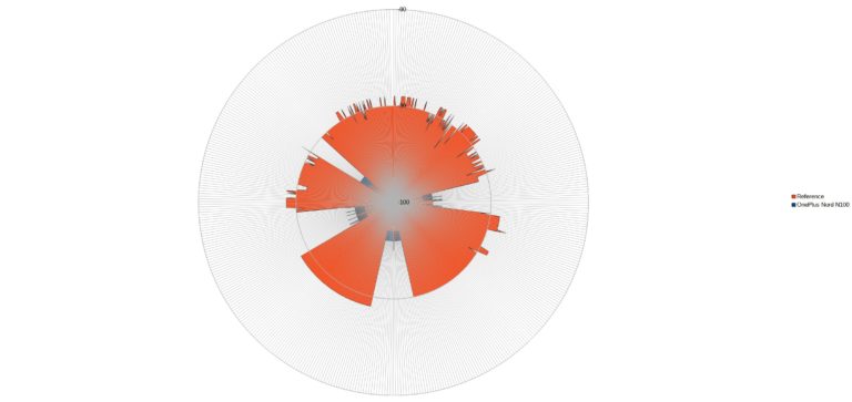 J'ai effectué 896 mesures de signal 4G avec le OnePlus Nord N100 et j'ai obtenu un signal moyen de -96.005 dBm alors que mon appareil de mesure a obtenu un signal moyen de -91.23 dBm sur la même période. La différence est importante et cela classe le OnePlus Nord dans la moyenne basse du classement. Cela veut dire que si vous vivez dans une zone où la couverture réseau n'est pas très bonne, ce téléphone risque de présenter des problèmes de qualité. J'ai constaté des fluctuations importantes avec mon appareil de mesure (surtout la nuit), je suppose que l'opérateur du réseau a fait quelques modifications qui ont affecté la performance du signal.