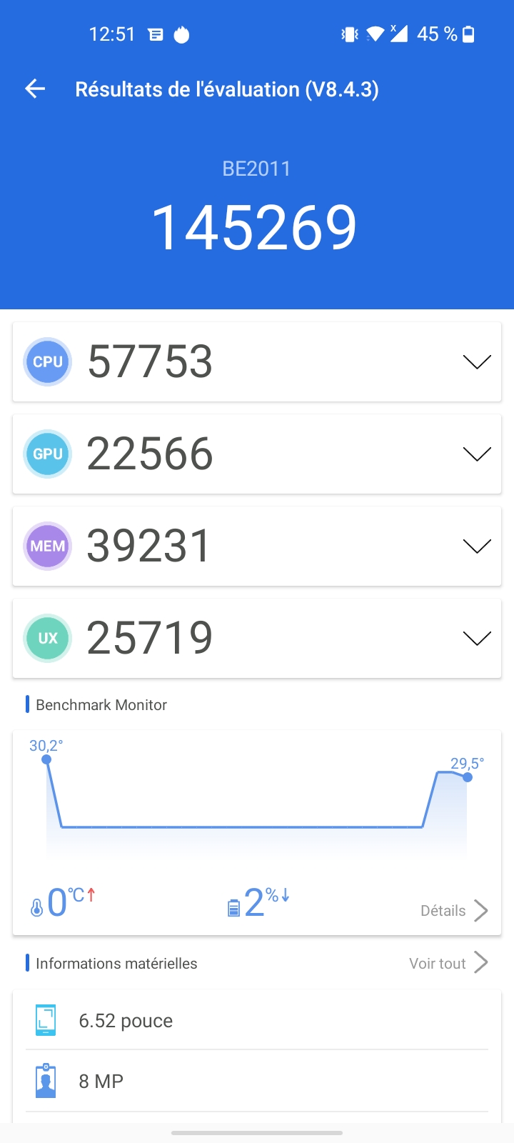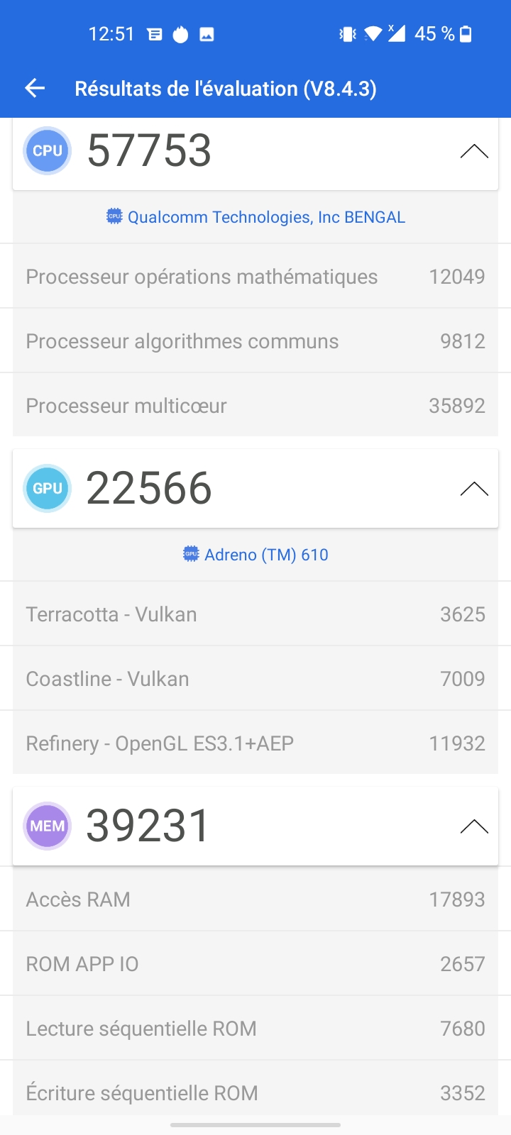 J'ai obtenu un peu plus de 145 000 points avec Antutu, ceci classe le OnePlus Nord n100 assez bas dans le classement et face aux autres téléphones du même prix, le OnePlus Nord N100 est un peu à la traine. Si vous êtes habitués à ce genre de téléphone, vous ne ressentirez aucun problème au quotidien. J'ai par contre l'habitude de changer souvent de téléphone et je sens que ce OnePlus Nord N100 est un peu lent lorsqu'il faut changer d'écran ou quand par exemple il faut faire appel au clavier, il y a une latence perceptible entre votre demande et la réponse du téléphone.Gaming