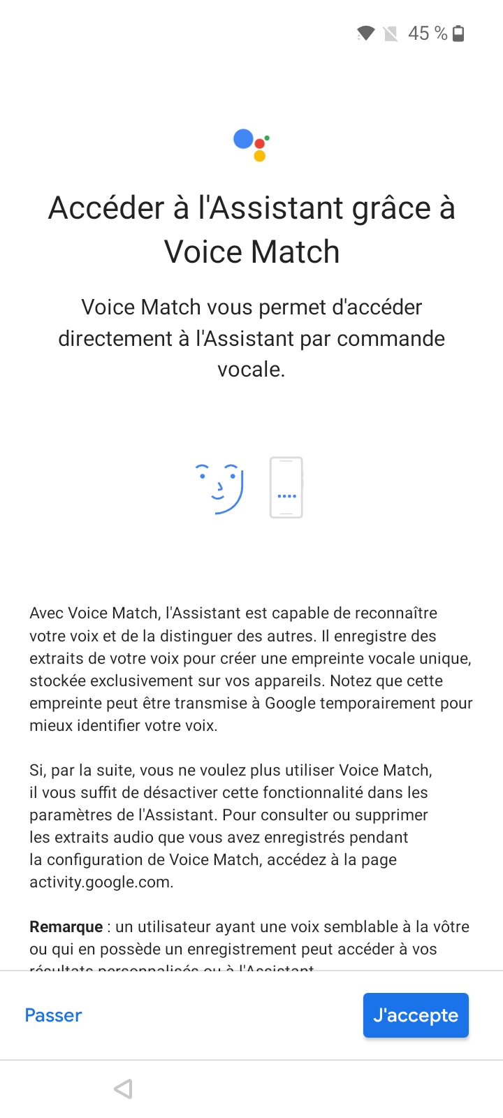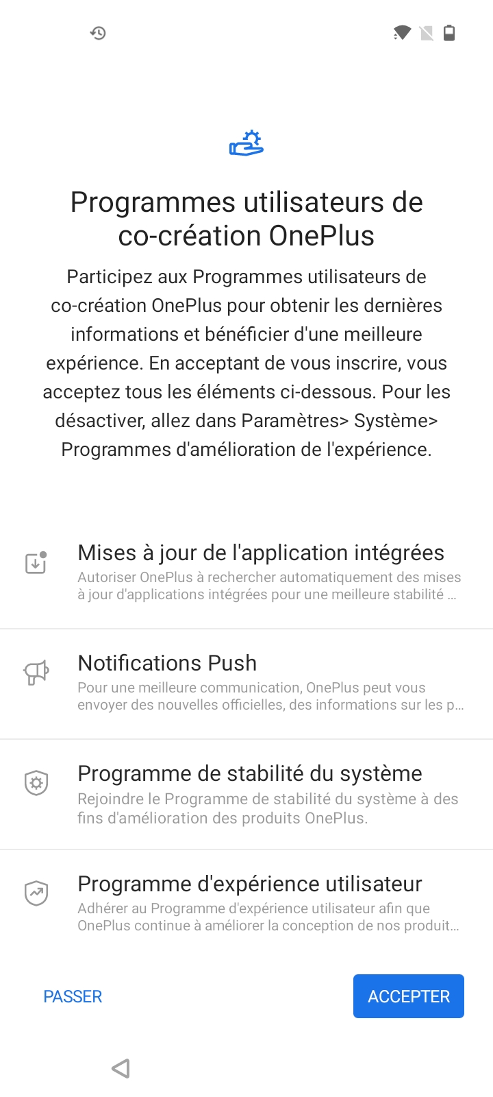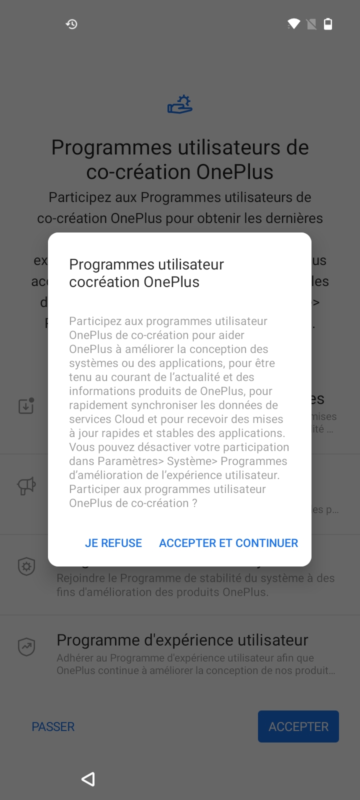 La configuration du OnePlus Nord N100 est légèrement différente de ce que j'ai pu voir sur d'autres téléphones Android, il faut d'abord accepter les conditions générales de OnePlus avant de récupérer vos fichiers d'un précédent téléphone (Android ou iOS) et passer les étapes habituelles. OnePlus a inséré un écran pour vous inciter à vous inscrire au programme à son programme d'amélioration, c'est la première fois que je vois ça à un niveau aussi haut dans la configuration d'un téléphone. En dehors de cet écran, il n'y a pas d'autres services forcés comme un cloud ou ce genre de choses que l'on retrouve chez Samsung ou Xiaomi.Finition