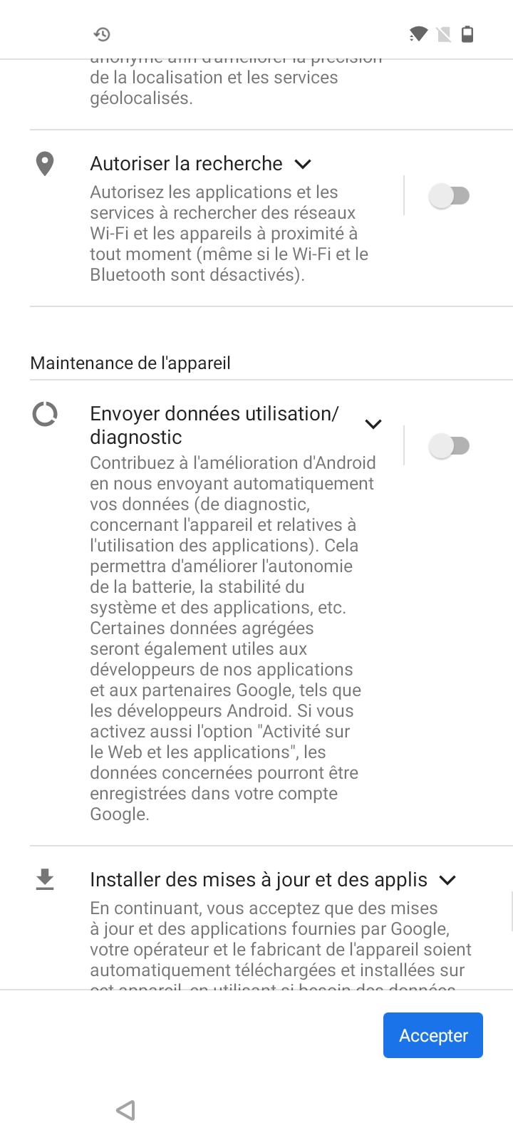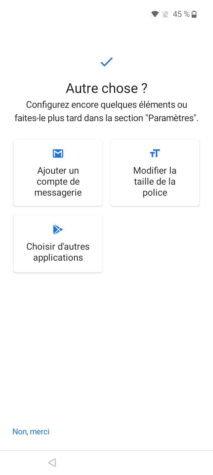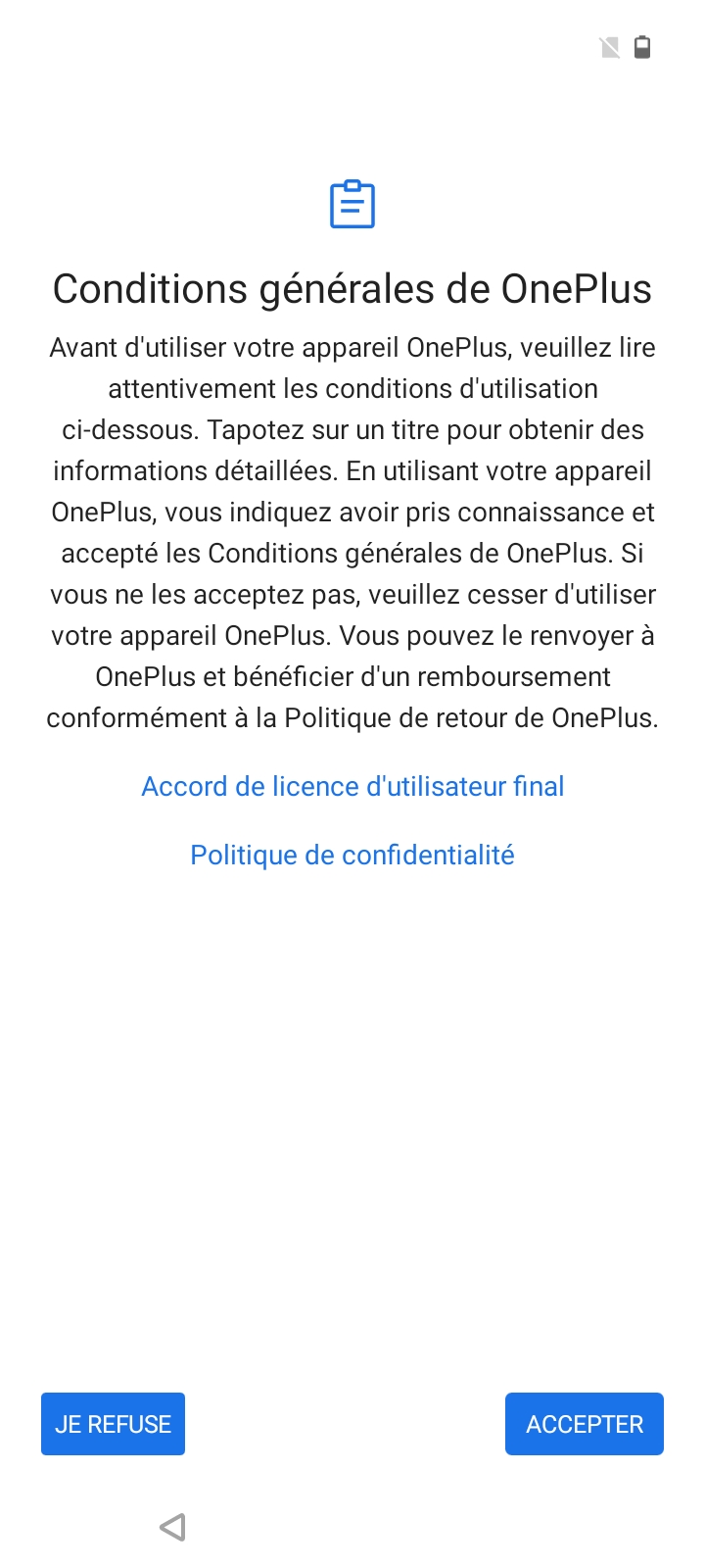 La configuration du OnePlus Nord N100 est légèrement différente de ce que j'ai pu voir sur d'autres téléphones Android, il faut d'abord accepter les conditions générales de OnePlus avant de récupérer vos fichiers d'un précédent téléphone (Android ou iOS) et passer les étapes habituelles. OnePlus a inséré un écran pour vous inciter à vous inscrire au programme à son programme d'amélioration, c'est la première fois que je vois ça à un niveau aussi haut dans la configuration d'un téléphone. En dehors de cet écran, il n'y a pas d'autres services forcés comme un cloud ou ce genre de choses que l'on retrouve chez Samsung ou Xiaomi.Finition