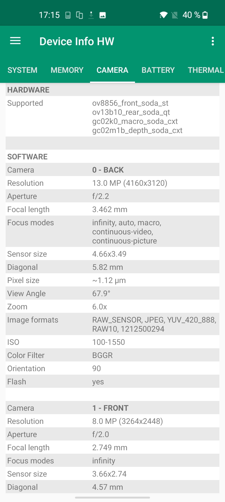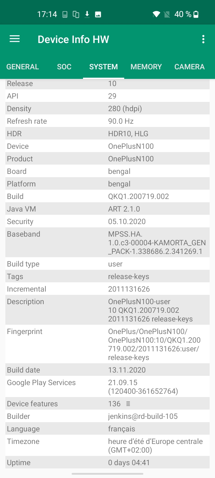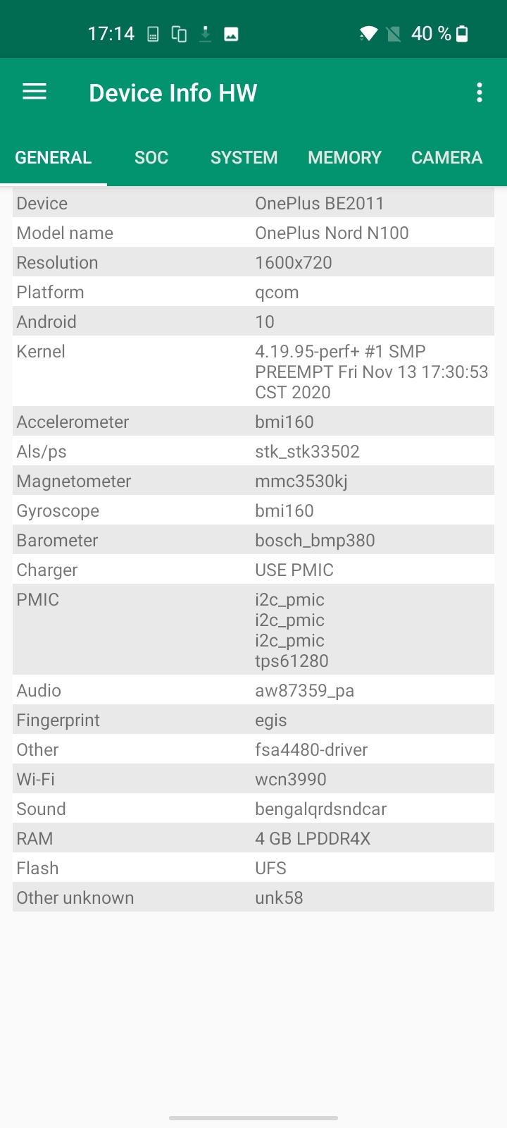 Les informations ci-dessous proviennent de l'application Device Info HW. L'application fournit des informations techniques détaillées sur le téléphone testé.J'ai acheté la version 4Gb / 64 Gb du OnePlus Nord N100, il n'existait d'ailleurs pas d'autres versions au même d'écrire ce test. J'ai fait une capture d'écran des spécifications techniques ci-dessous. Le chipset wifi est le même que sur la gamme Redmi Note 10. Au niveau son, c'est un chipset que je n'ai pas encore testé. Je n'ai pas trouvé d'informations supplémentaires sur l'appareil photo non plus.