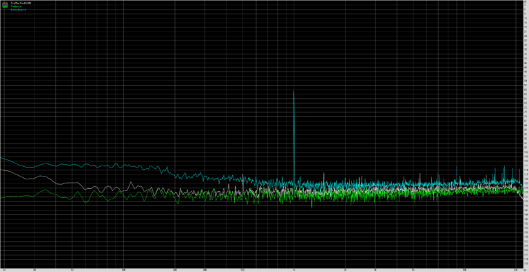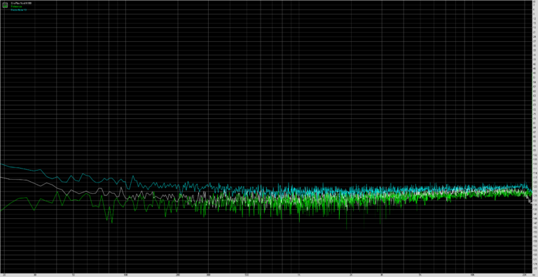 Ce test vise à tester la capacité de l’appareil à reproduire correctement toutes les fréquences. La ligne blanche au milieu du graphique est la situation idéale et les autres couleurs proviennent des tests sur différents téléphones. Une déviation de la ligne de référence indique un écart par rapport à la situation idéale. Pour voir un bon son sur toutes les fréquences il faut donc s’approcher le plus possible de la ligne de référence.
