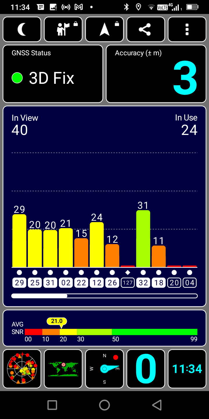 Pour tester la précision du signal GPS, j'utilise deux applications de positionnement pour évaluer la différence entre la position réelle et la position indiquée par le téléphone. Ce test est fait en extérieur sans rien pour obstruer le signal. Un niveau de précision jusqu'à 3 mètres peut facilement être corrigé par une application (ex: Google Maps).