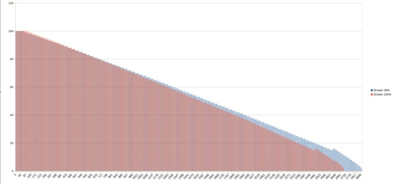 Pour tester l'autonomie des batteries j'ai développé une application qui mesure le niveau de batterie minute par minute jusqu'à ce que la batterie soit vide. Cette application consomme environ une dizaine de pourcent des ressources du téléphone et je fais un test avec une luminosité d'écran à 100% et un autre avec une luminosité à 50%. Ce test vise à reproduire une utilisation contemplative d'un téléphone (ex: surfer sur internet, lire des articles, passer du temps sur les réseaux sociaux). Ces résultats ne sont pas valables pour une utilisation intensive type gaming/streaming. [battery] Le gros point fort de ce téléphone c'est la batterie car avec une capacité de 12500 mAh, il faut s'attendre à atteindre une autonomie hors norme. C'est effectivement le cas car j'ai obtenu une autonomie de 2859 minutes (47 heures!) avec l'écran allumé à 50%. J'ai obtenu un score très similaire avec l'écran à 100% mais je suspecte que la luminosité automatique était enclenchée et vu le temps que prend ce genre de test, je ne m'en suis pas rendu compte tout de suite.