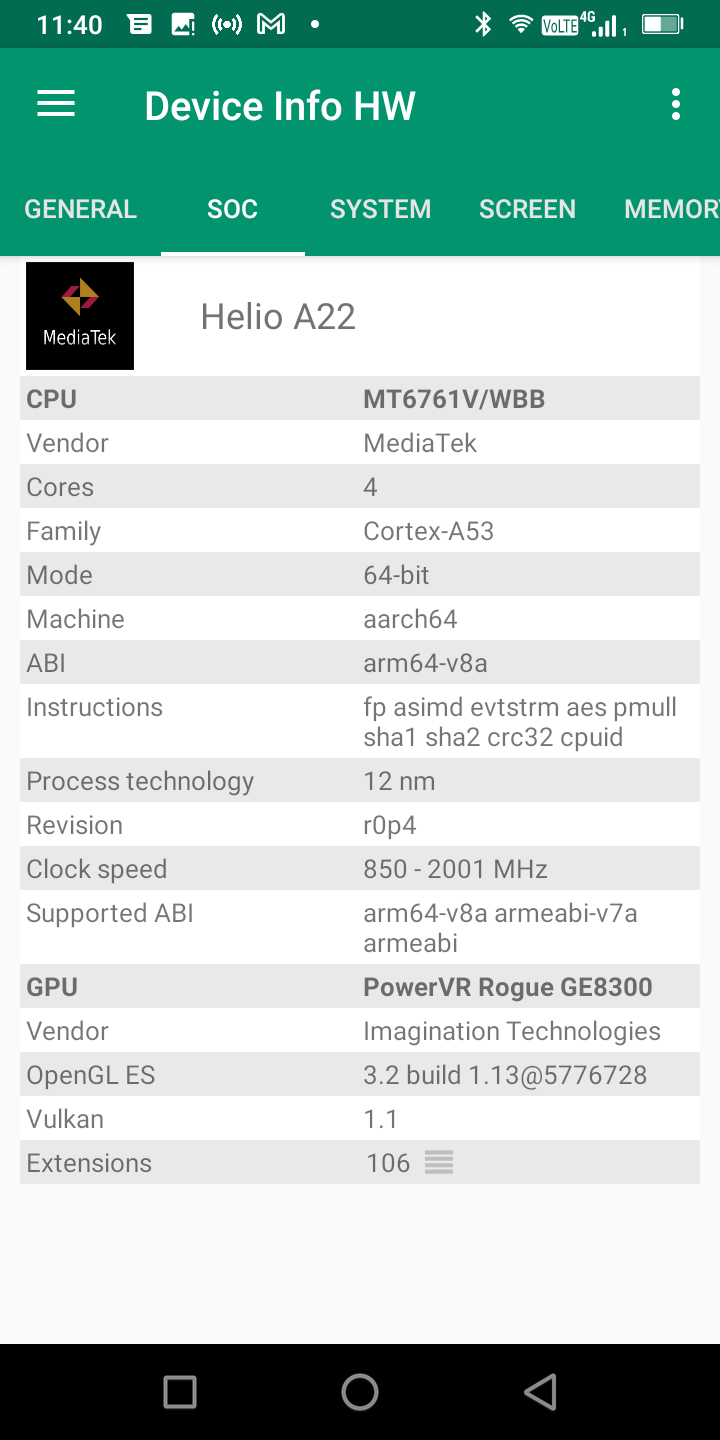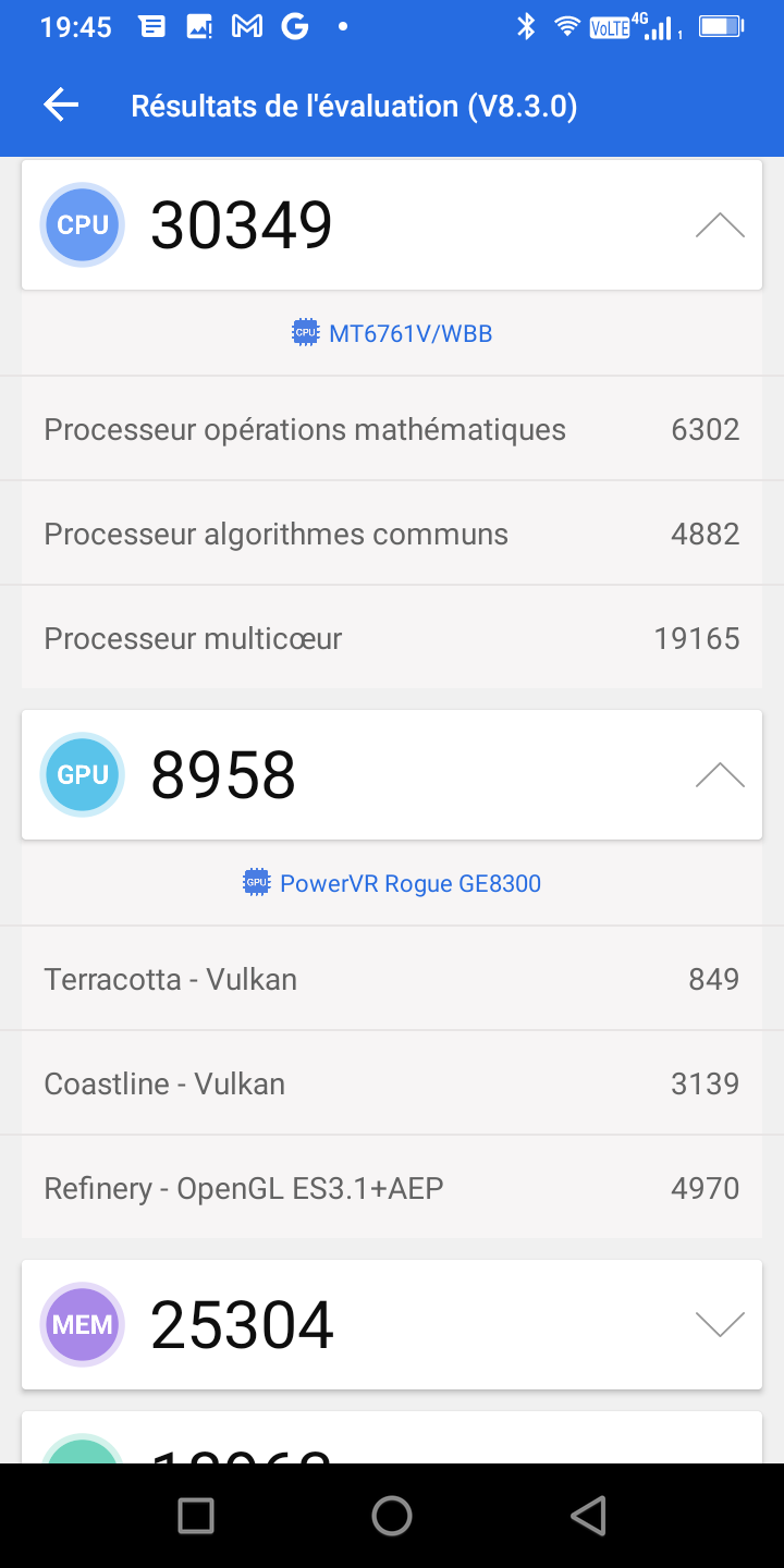 Le CPU est un Mediatek MT6761V/WBB, c'est un CPU d'entrée de gamme qui ne va donc pas délivrer une performance très élevée, ce téléphone n'est clairement pas conçu pour s'occuper d'opération complexe. Il sera donc lent dans les applications lourdes même si l'usage des fonctions de base ne sera pas vraiment affecté.