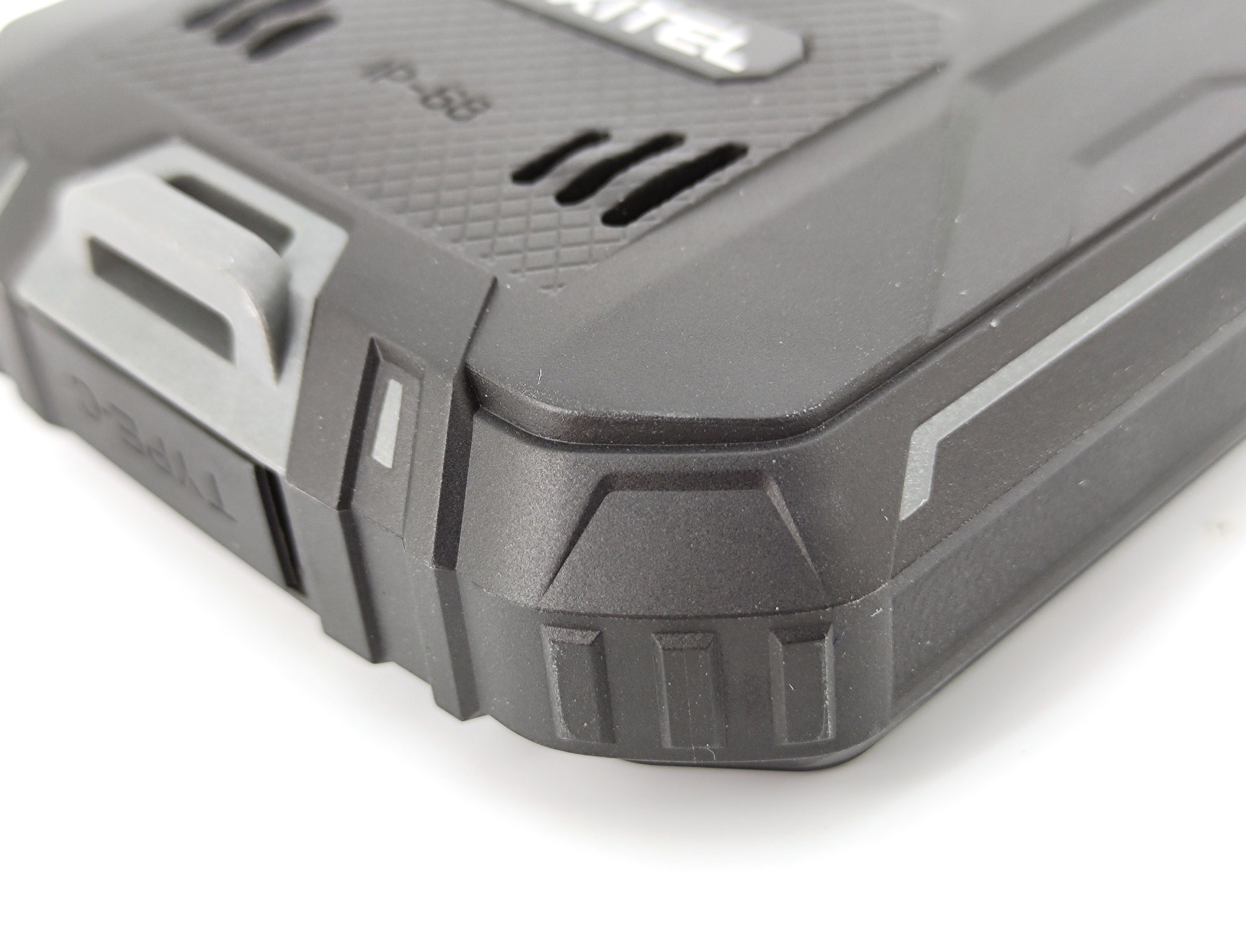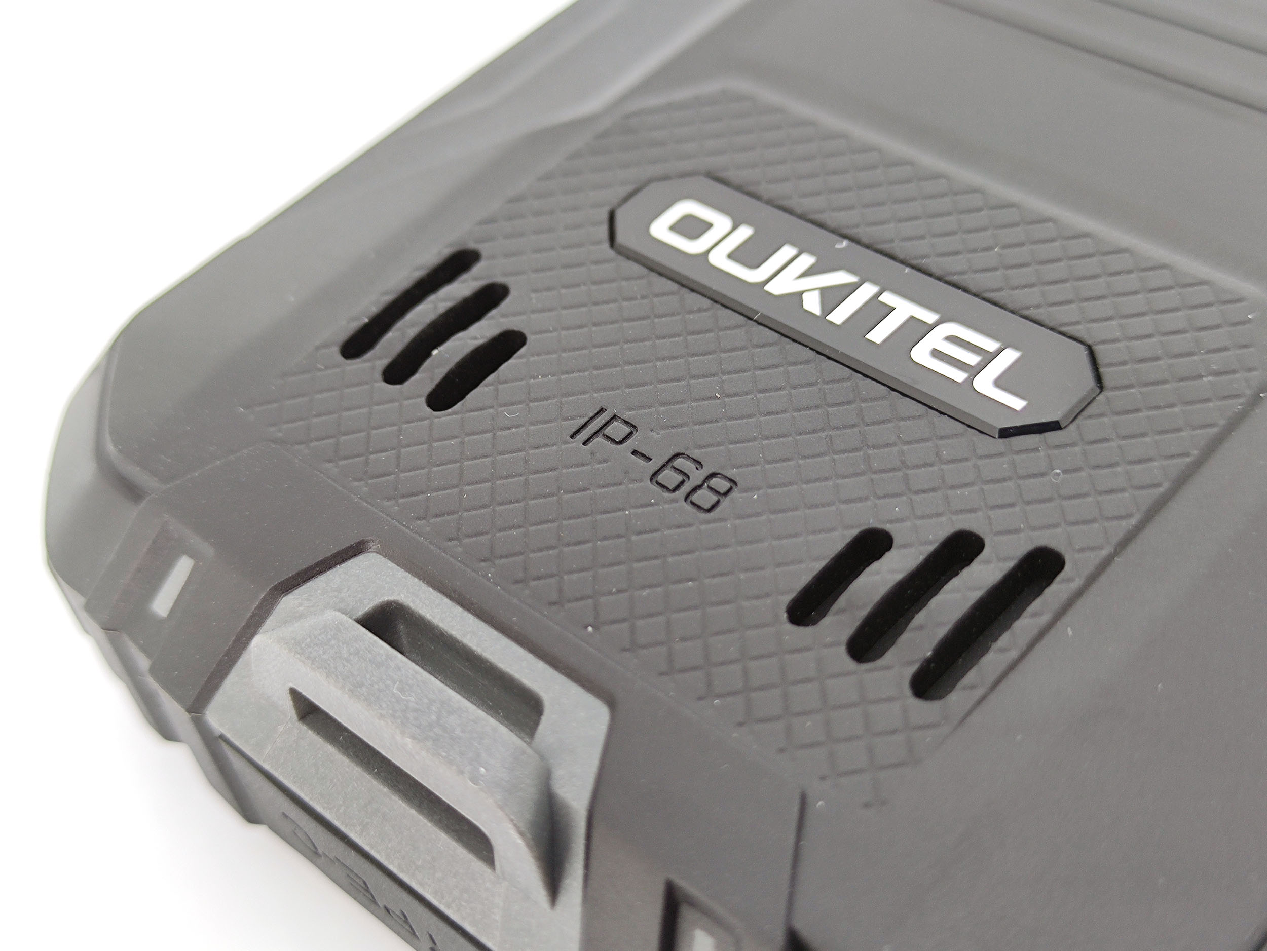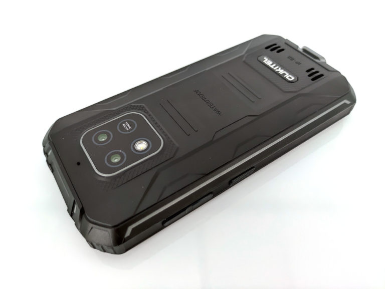 L'arrière du téléphone est complètement enveloppé dans son armure de protection, cela donne un aspect presque militaire avec ses formes très angulaires. Le son du haut-parleur sort par l'arrière et comme il s'agit d'une construction étanche il est fort probable que ce son ne soit pas d'une très bonne qualité mais je testerai le son plus loin dans cet article. Le bloc photo est parfaitement intégré dans le téléphone, celui-ci ne dépasse pas pour éviter tout accrochage avec quelque chose qui pourrait l'abimer. Le bloc photo est également protégé par une couche de verre/plastique supplémentaire pour résister aux chocs. En bas on retrouve une encoche pour attacher une dragonne.