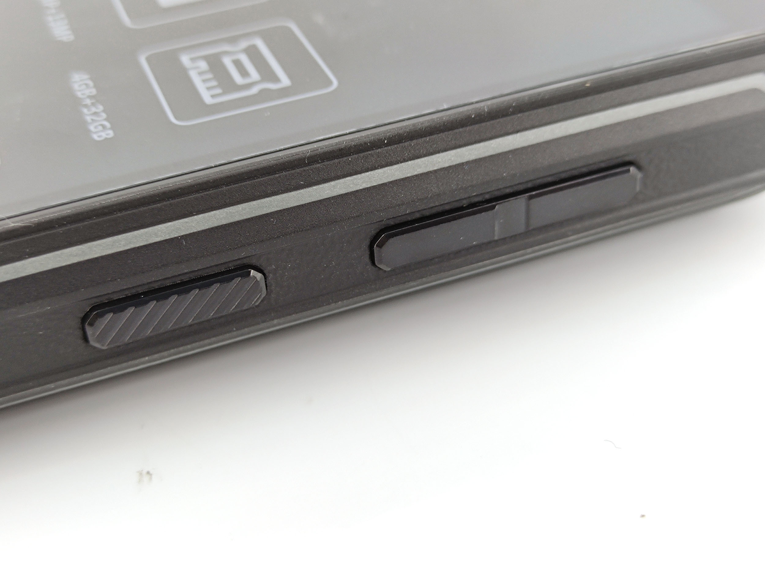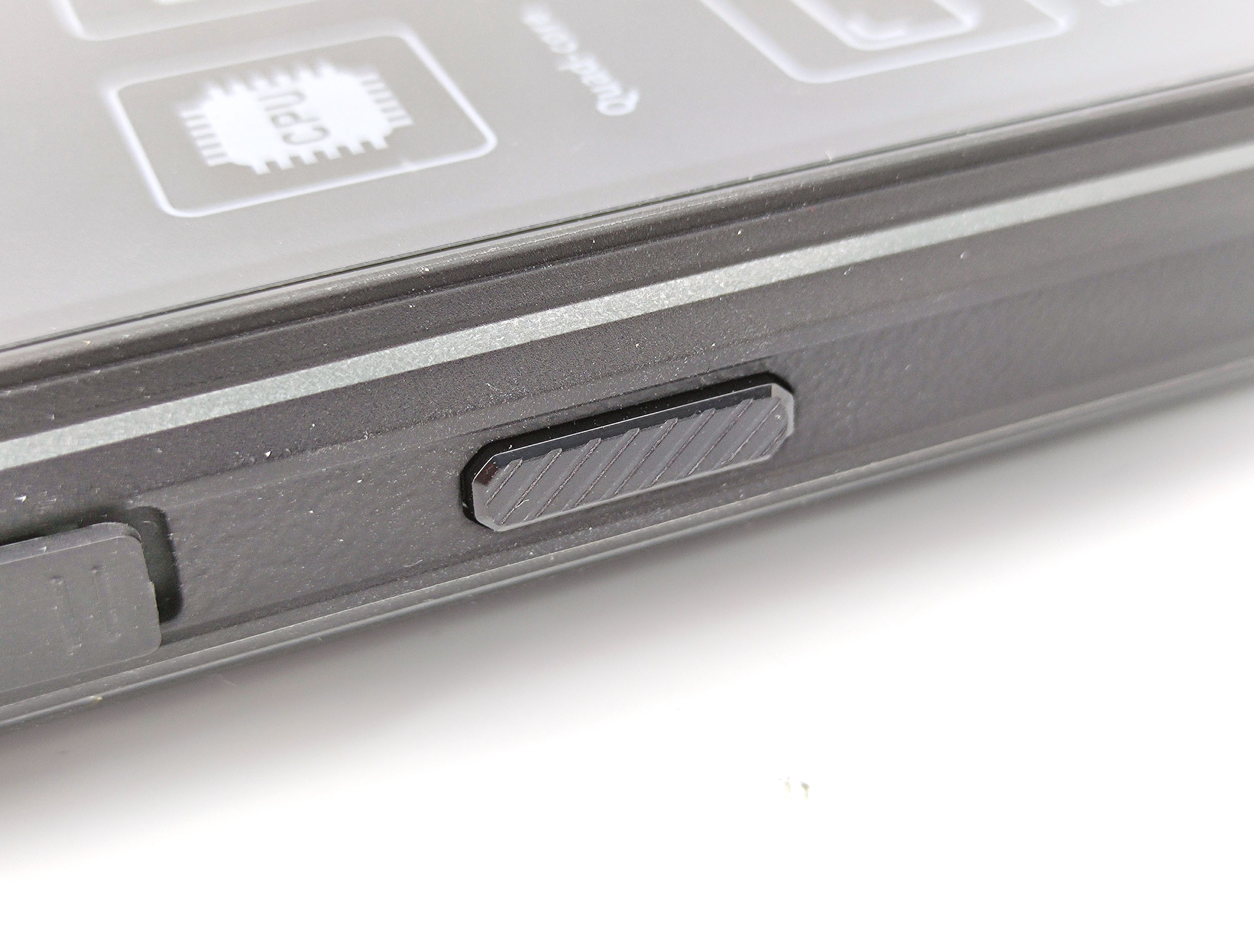 Les boutons d'allumage et volume sont présents aux endroits habituels, ces boutons ont également été renforcés pour résister aux chocs. Contrairement à leur apparence, j'ai trouvé ces boutons un peu mous. Pour prendre des captures d'écran (combinaison volume + allumage), j'ai donc enfoncer les boutons assez profondément pour pouvoir effectuer mes captures d'écran.