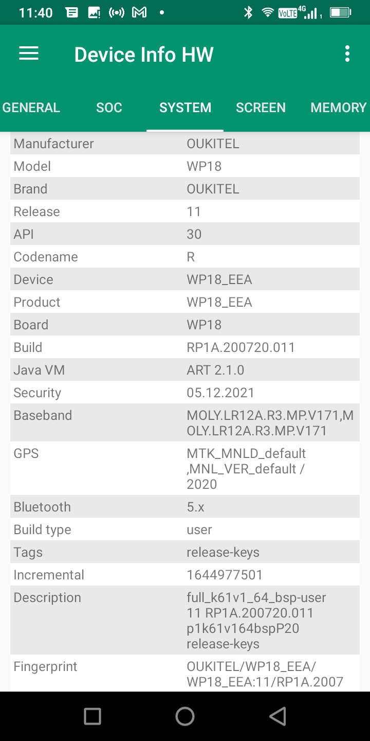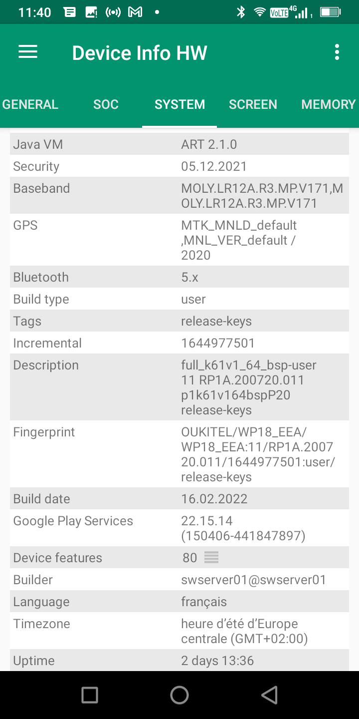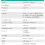 Les informations ci-dessous proviennent de l'application Device Info HW. L'application fournit des informations techniques détaillées sur le téléphone testé.Le Oukitel WP18 est un téléphone d'entrée de gamme, je ne m'attendais donc pas à trouver des choses extraordinaires sur la partie technique, j'ai testé la version 4 Gb / 32 Gb et 32Gb c'est très peu. Après avoir transféré mon profil du cloud Google pour tester le téléphone avec toutes mes applications habituelles, il ne me restait plus que 18 Gb de mémoire de stockage.