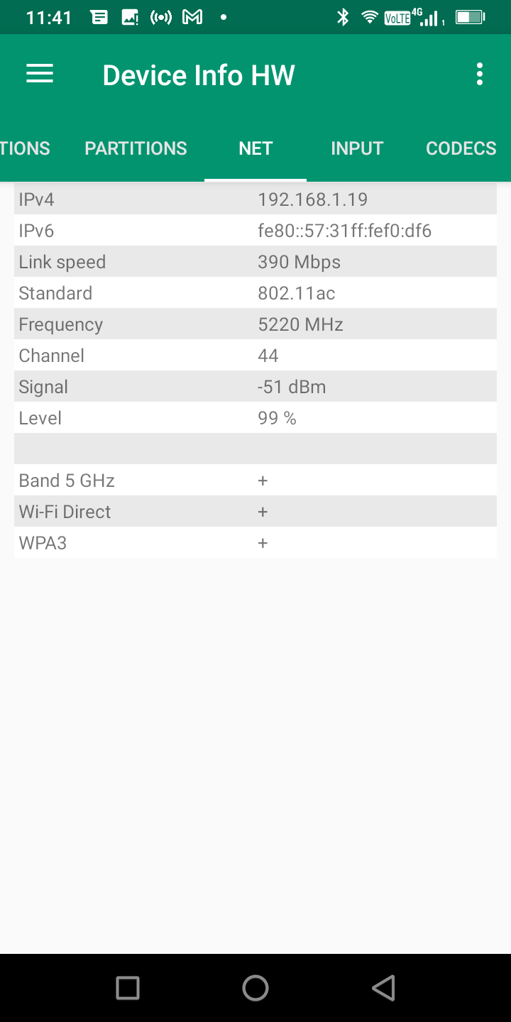 Pour tester la capacité d'un téléphone à bien capter le réseau j'effectue des mesures à proximité de mon routeur et ensuite à distance (et toujours dans les mêmes conditions). J'obtiens ainsi une moyenne en dBm où une valeur de -90 dBm indique une moins bonne performance qu'une valeur à -30 dBm.Signal Wifi: