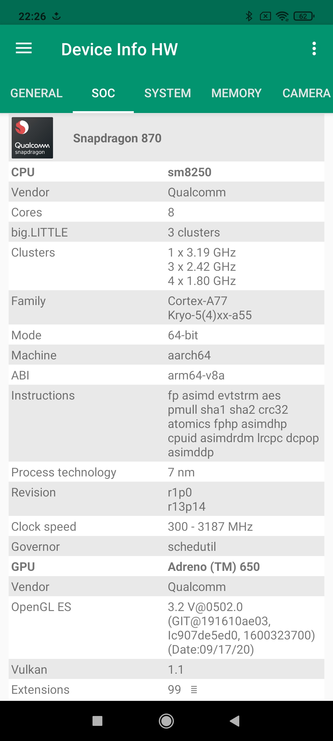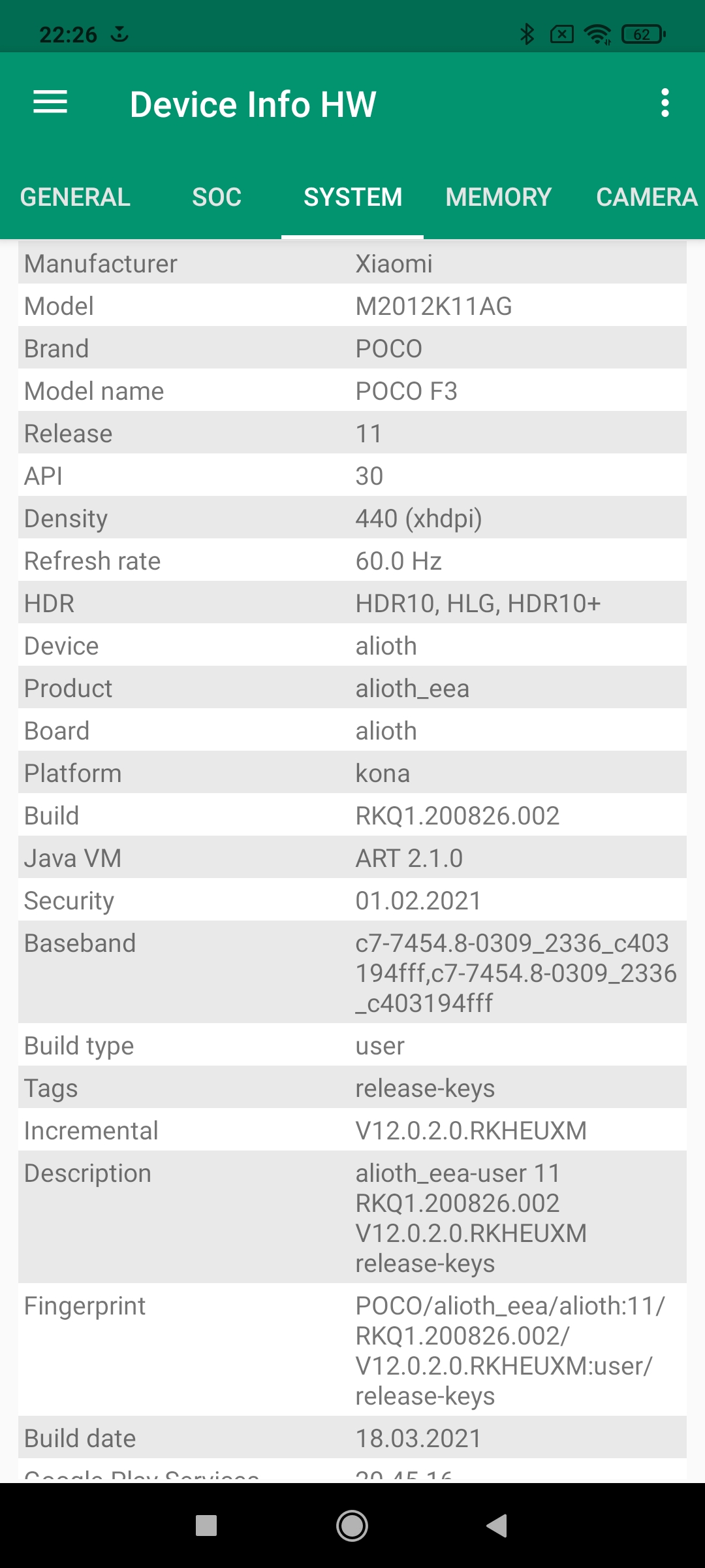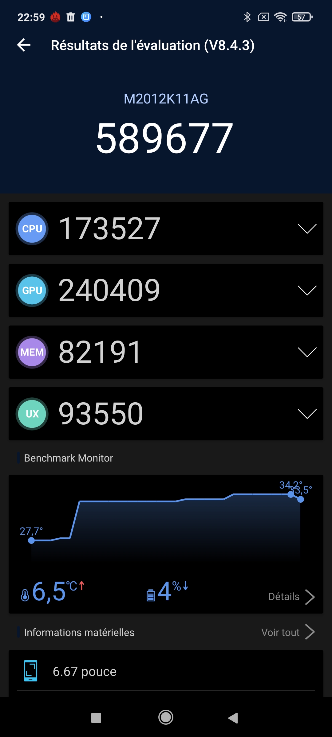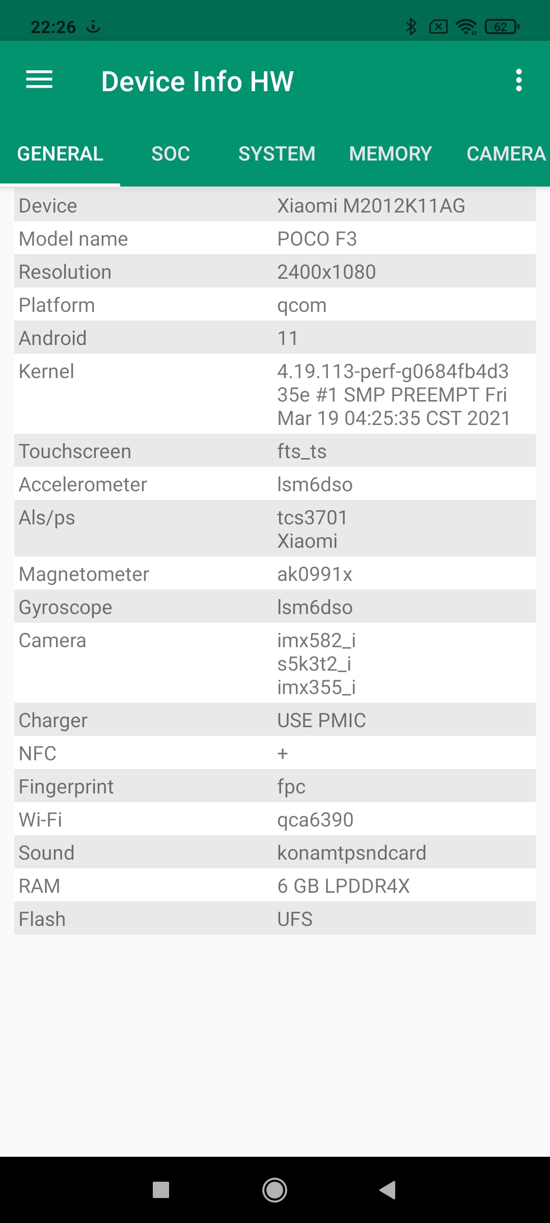 Les informations ci-dessous proviennent de l'application Device Info HW. L'application fournit des informations techniques détaillées sur le téléphone testé.Le Poco F3 est une machine de guerre, il est équipé d'un processeur puissant, de mémoire rapide, d'un écran Amoled, il est 5G,...bref, si il fallait cocher des cases pour lister ce qu'on peut retrouver de mieux dans un téléphone, je pourrais cocher la plupart des cases pour ce Poco.