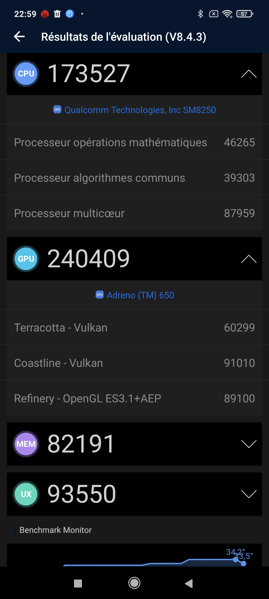 Pour la partie graphique, le Poco F3 utiliser un GPU Qualcomm Adreno 650 et ici aussi, il délivre des performances de très haut niveau et la combinaison avec le CPU place ce Poco F3 parmi les téléphones les plus puissants du moment. L'argument prix/performance est d'ailleurs devenu l'argument principal d'achat de ce Poco, vous ne trouverez probablement pas un téléphone aussi performant pour ce prix là.
