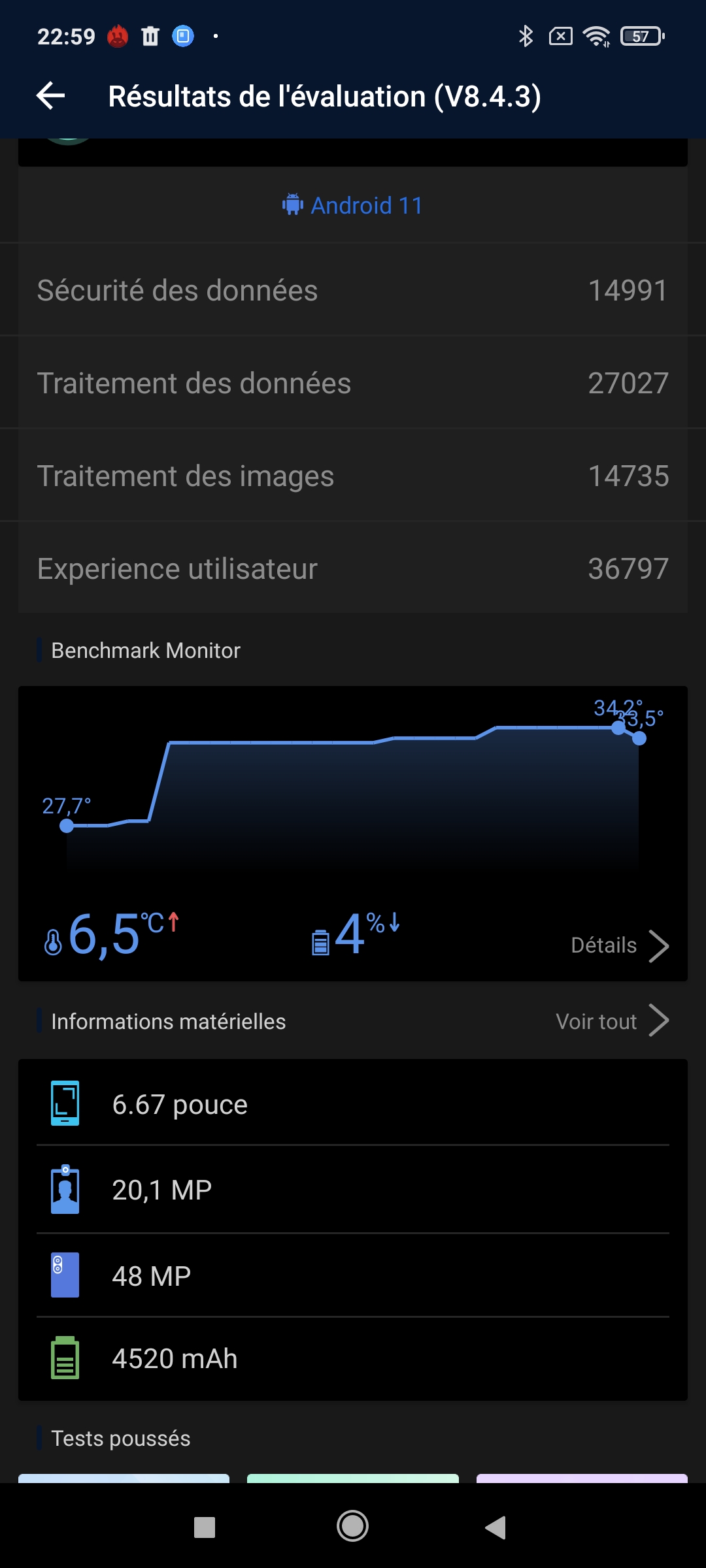 Pour contenir ces composants ultra performants, Poco a équipé le F3 d'un système de refroidissement liquide pour mieux dissiper la chaleur et ça fonctionne plutôt bien car après avoir fait passer le test de performance Antutu, la température n'était pas monté de plus de 7°C et je n'ai jamais eu une sensation désagréable de chaleur comme c'est le cas avec le Samsung Galaxy S20.