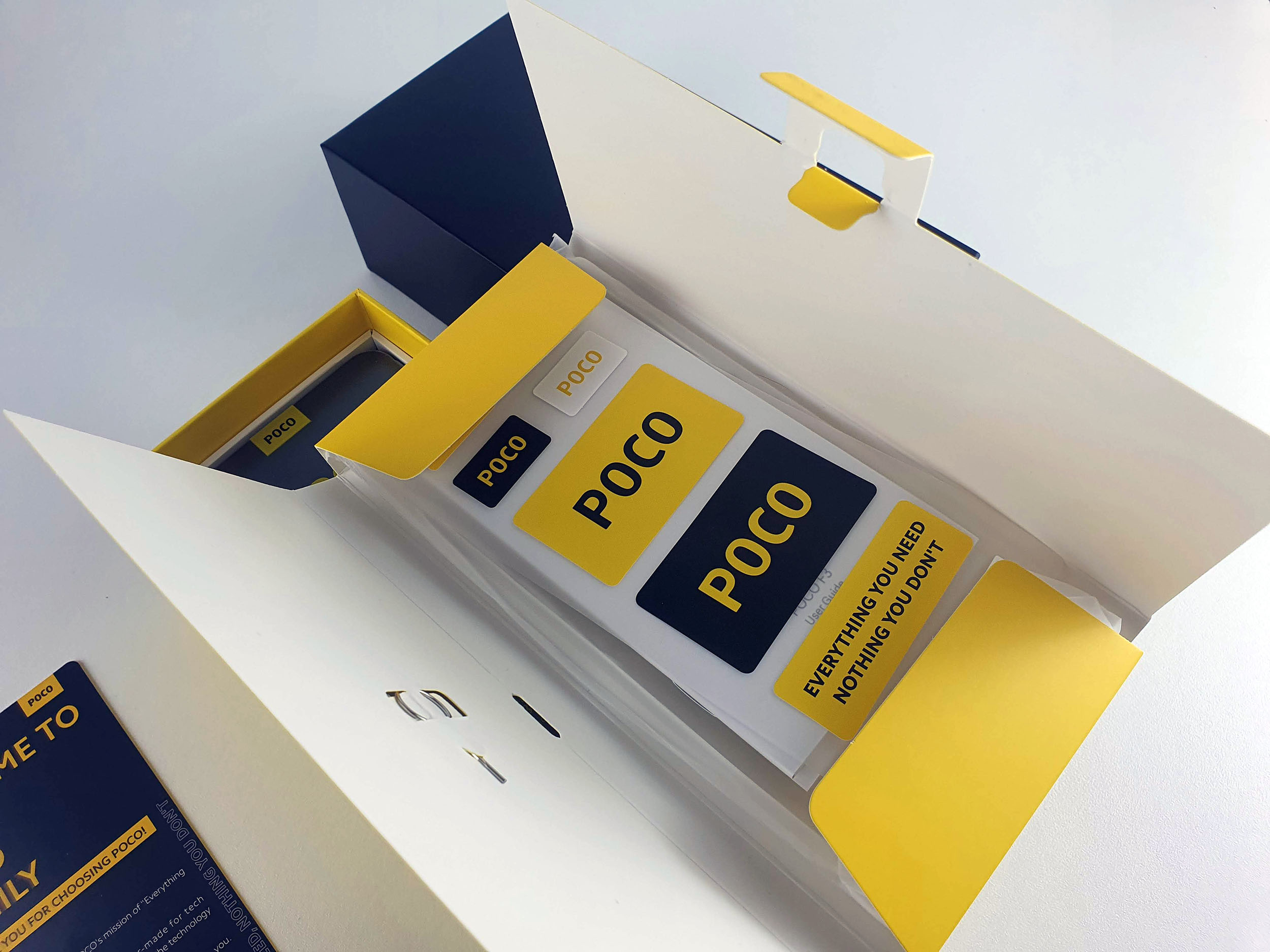 Entrée de gamme, milieu de gamme ou haut de gamme, Poco/Xiaomi ne fait pas de différence dans son packaging. Pour Poco on retrouve la boite noire avec les lettre jaune et cette boite contient le strict minimum: le téléphone, un manuel, des autocollants Poco, une protection en silicone, un chargeur et un cable USB-C.
