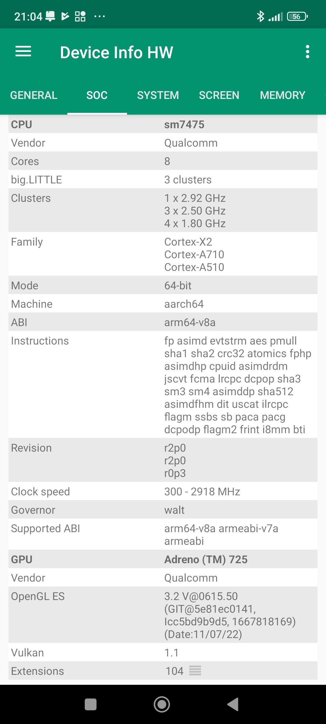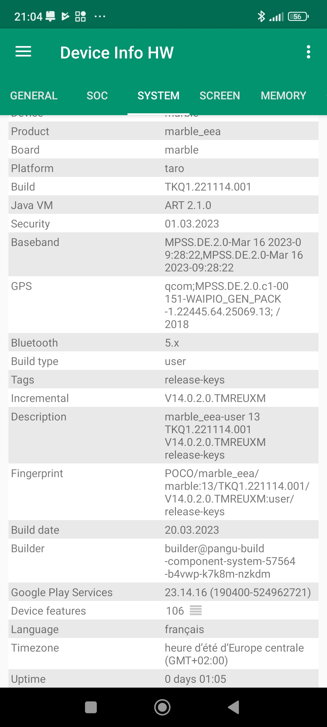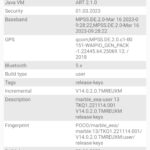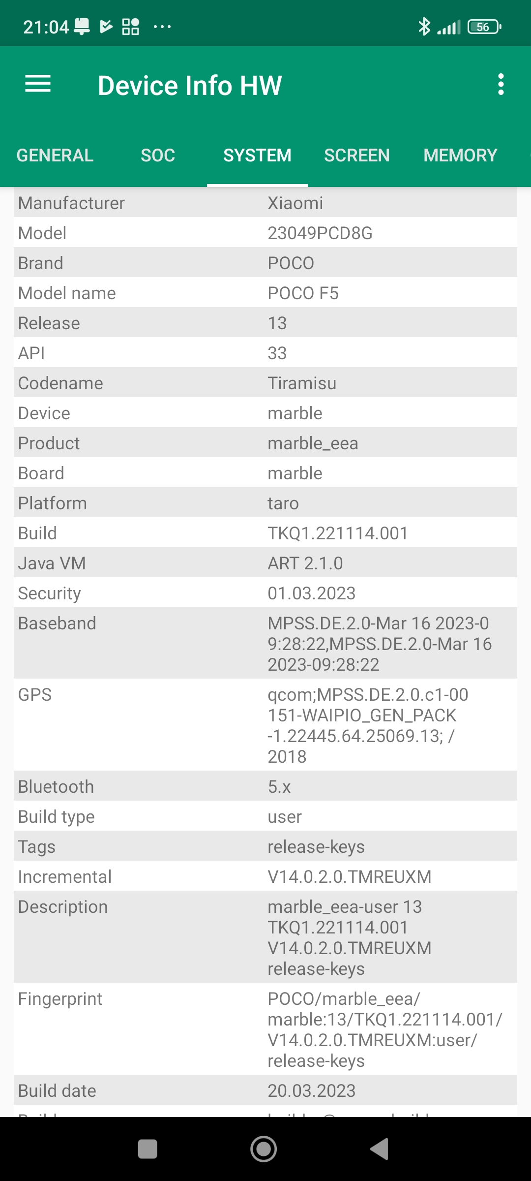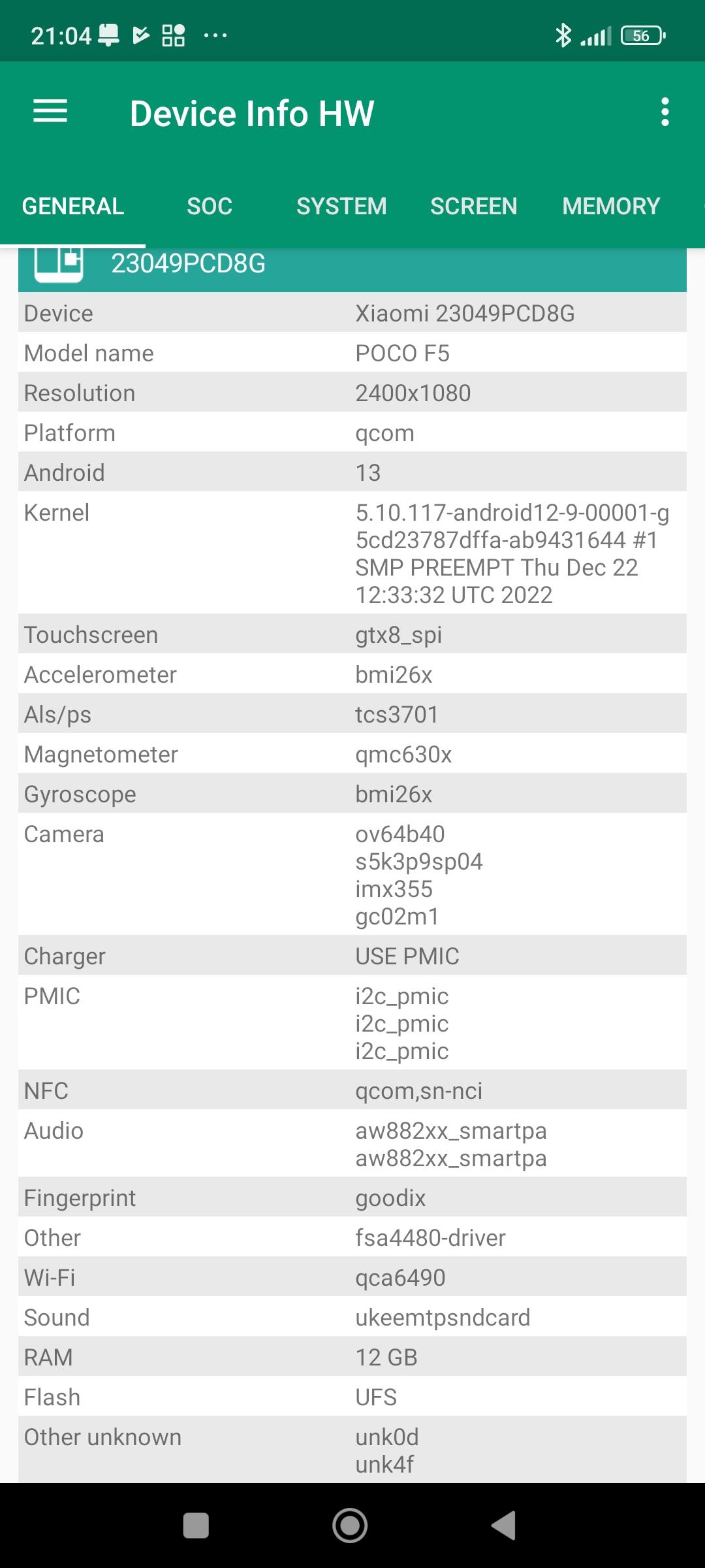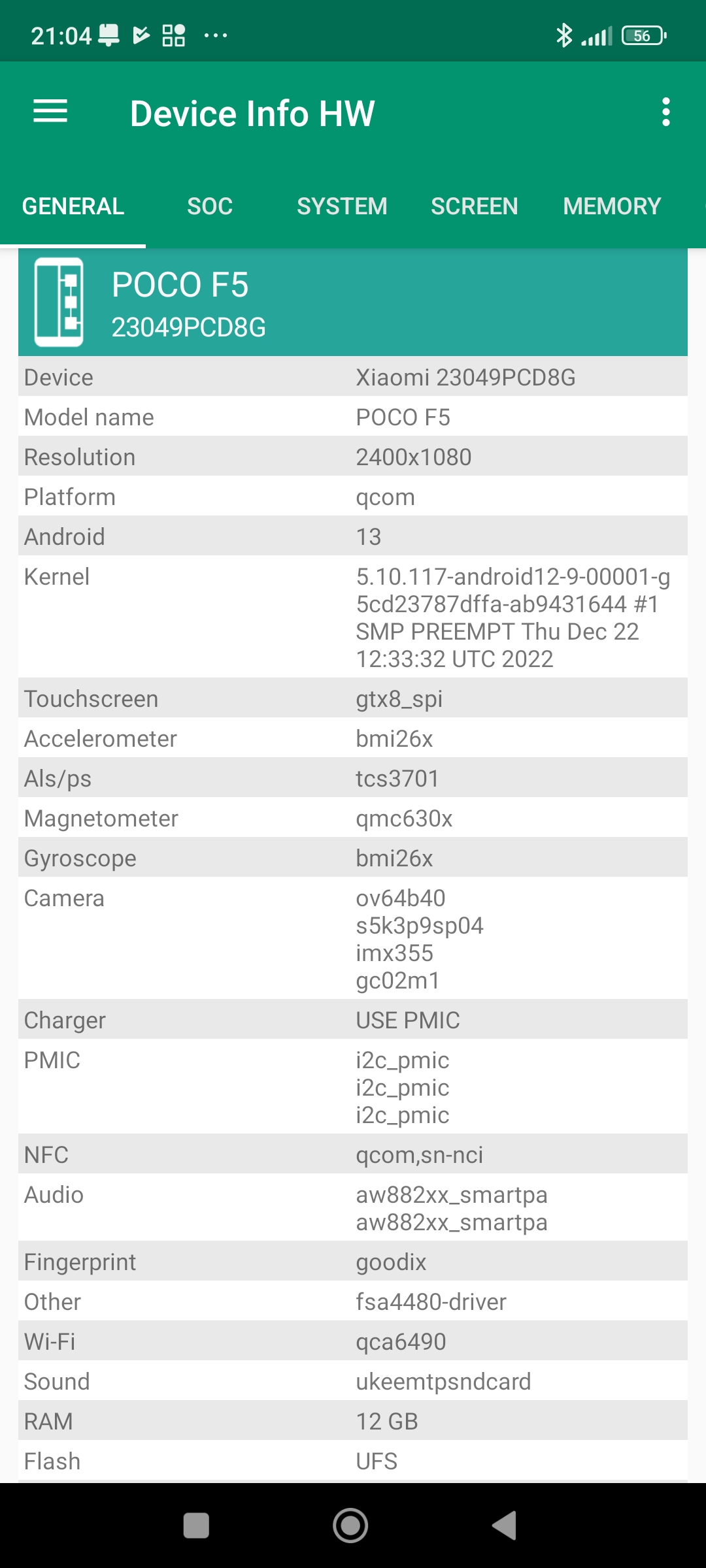 Les informations ci-dessous proviennent de l'application Device Info HW. L'application fournit des informations techniques détaillées sur le téléphone testé.J'ai testé le POCO F5 dans sa version 12 Gb / 256 Gb, vous retrouverez toutes les caractéristiques techniques dans les captures d'écrans suivantes. Il existe plusieurs versions avec une quantité de mémoire différente mais cela n'affecte en rien les performances du téléphone.