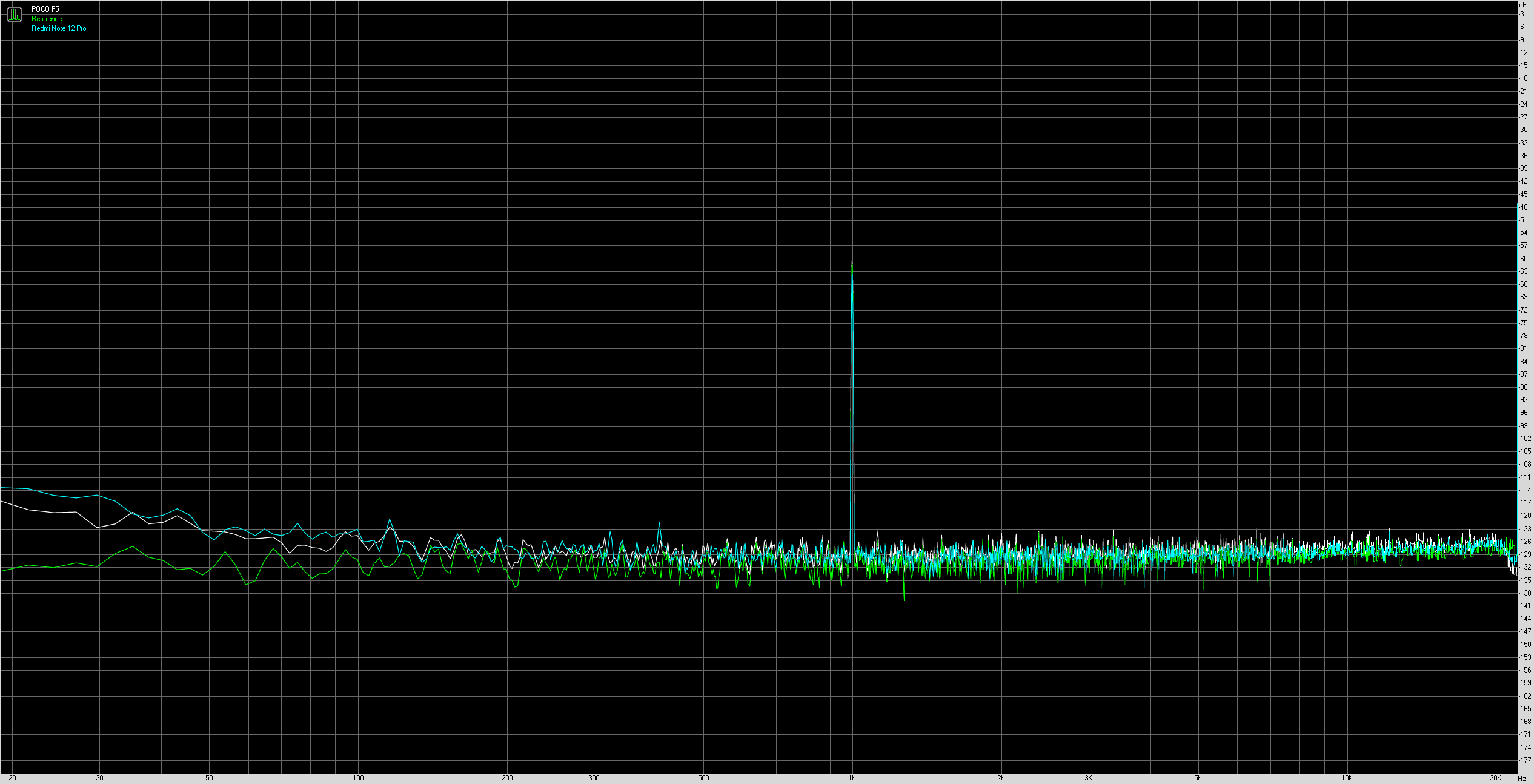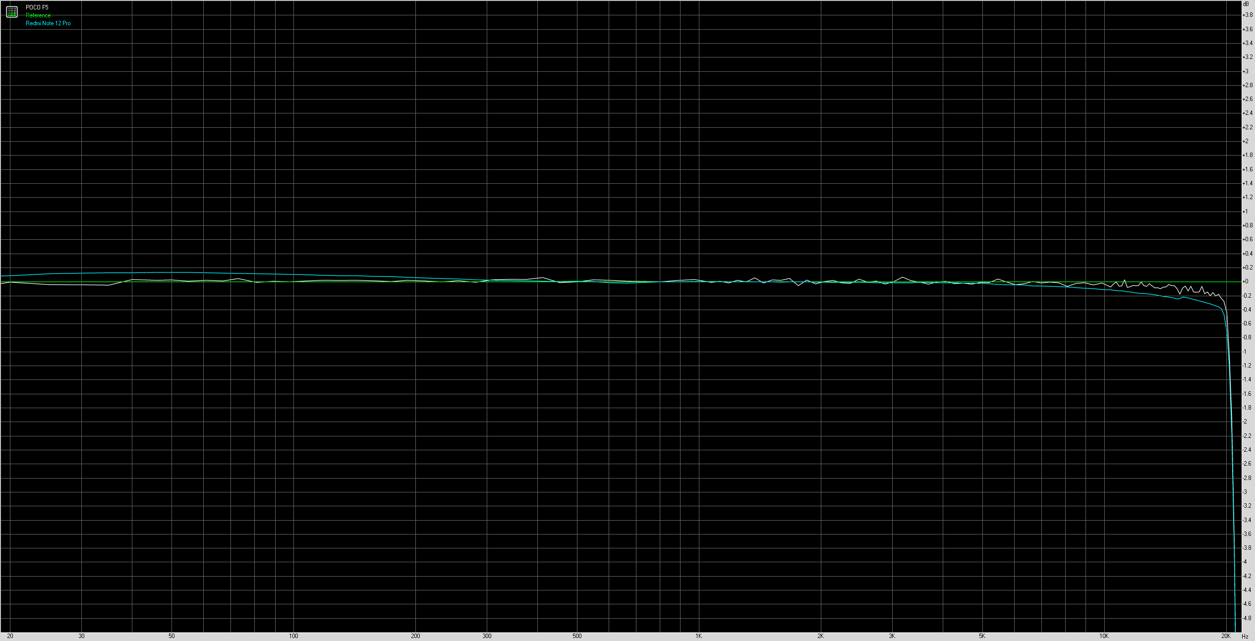 Le POCO F5 est capable de reproduire toutes les fréquences assez fidèlement, il parvient même à légèrement dépasser le Redmi Note 12 Pro qui avait obtenu de bons résultats sur ce test. On voit que la ligne du POCO n'est pas très stable mais les variations en décibels sont très faibles. Le son est de très bonne qualité à condition de ne pas mettre le volume au maximum car lorsqu'il est poussé au maximum, le son présente une distorsion importante.