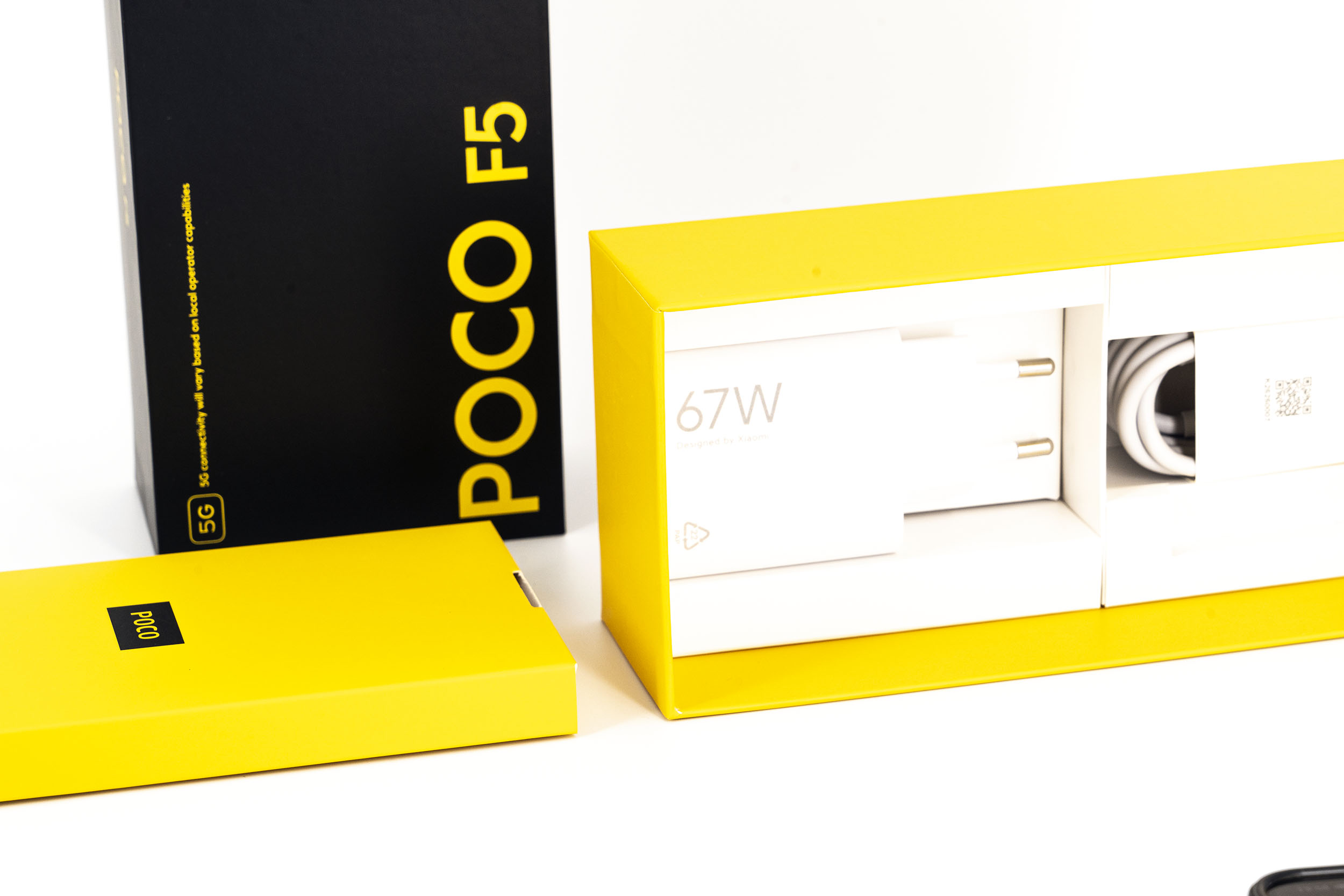 La boîte du POCO F5 reprend dans les grandes lignes l’identité de toutes les boîtes POCO de l’entrée de gamme jusqu’aux modèles premium. La boite contient le téléphone, une pochette avec le manuel, une coque de protection transparente, une aiguille pour le tiroir sim. Il y a également un chargeur 67W et un câble USB.