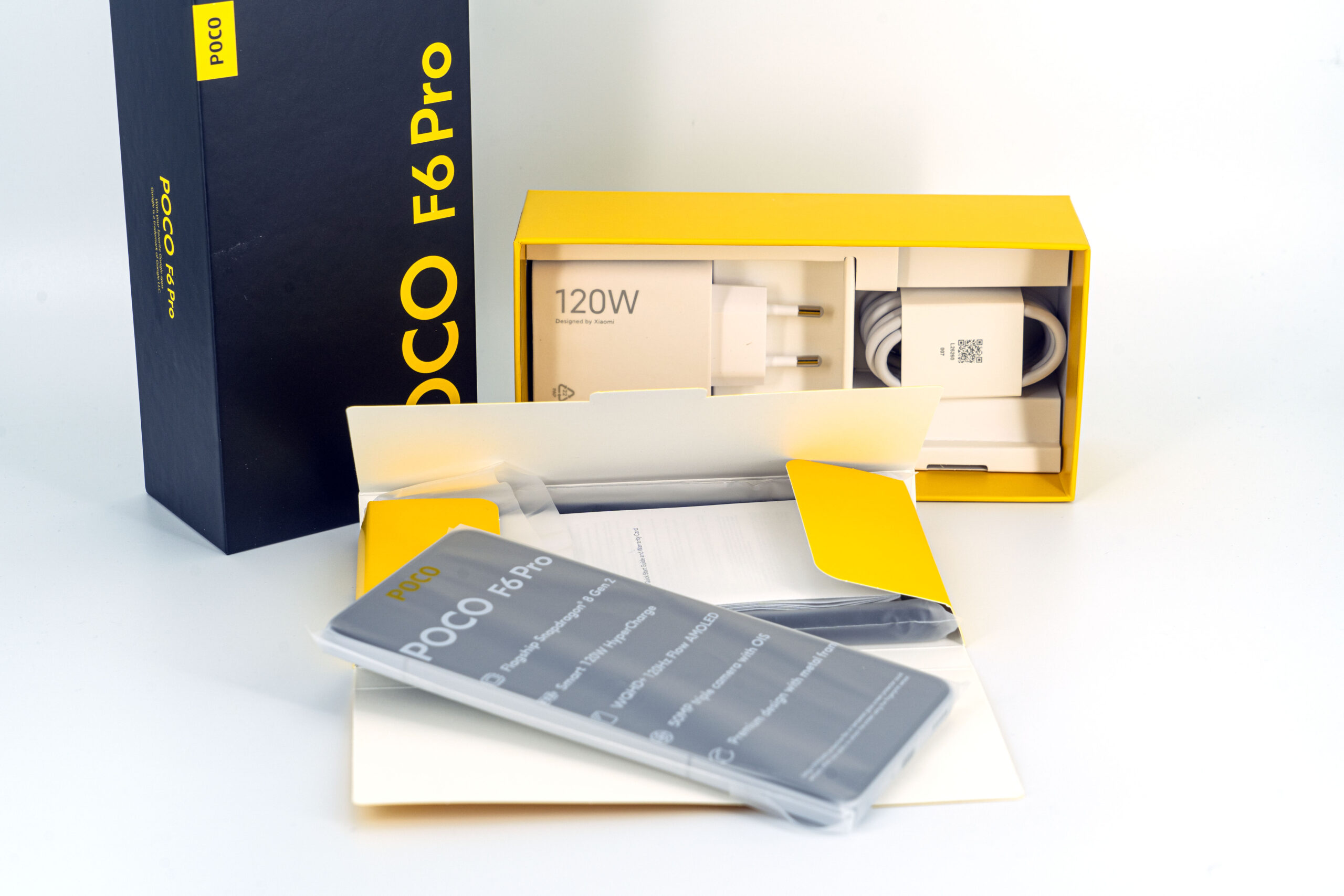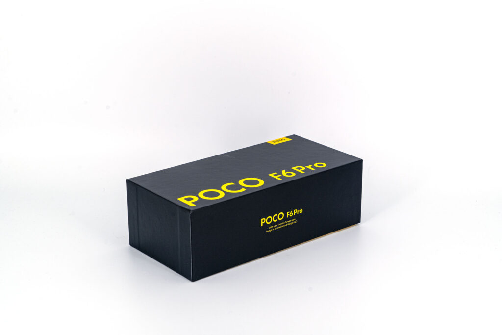 La boite du POCO F6 Pro est en tout point similaire à celle utilisée pour les autres modèles avec son lettrage jaune sur fond noir. Le contenu est également assez classique avec sa coque en silicone mou, son chargeur (120 watts!) et son cable USB.