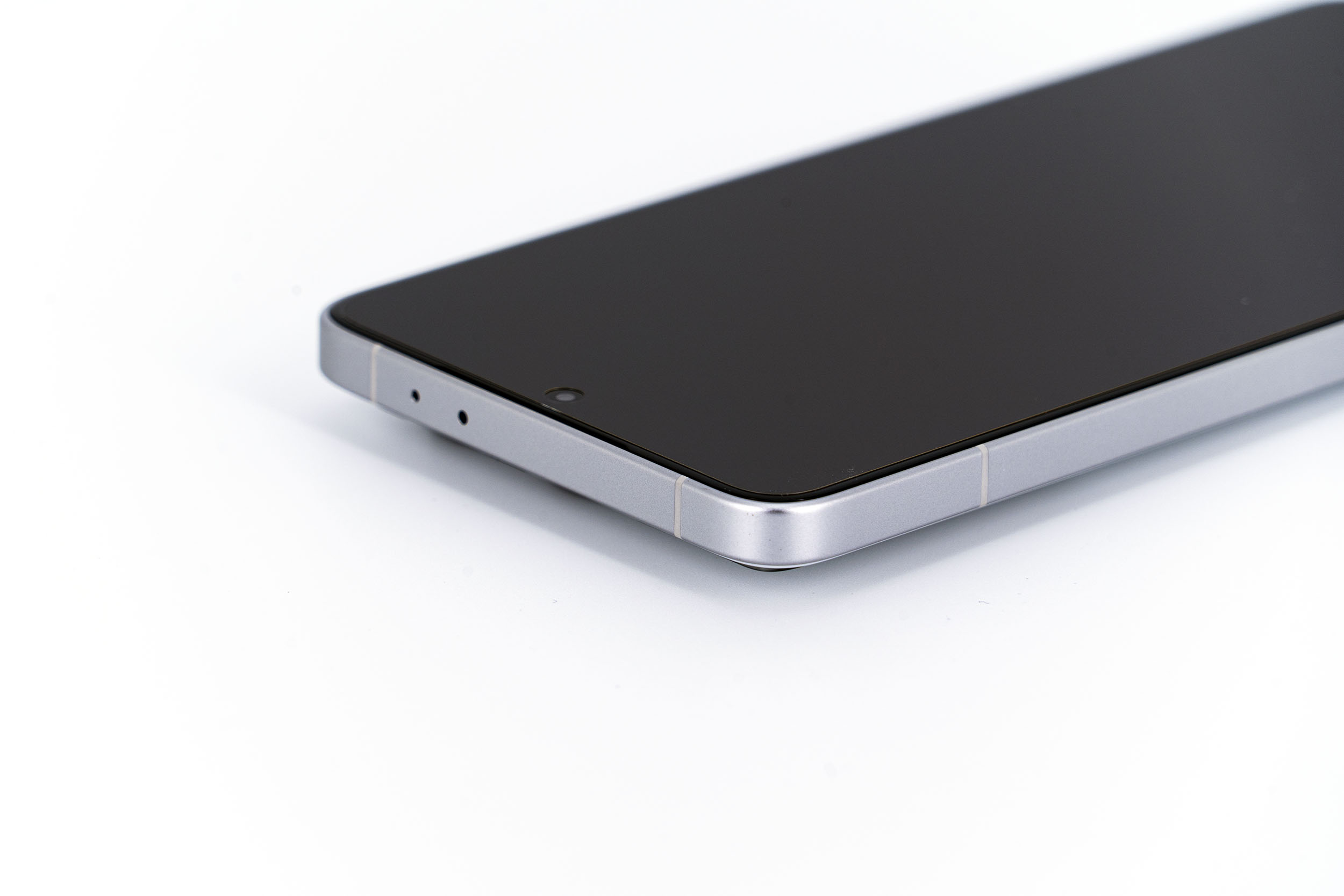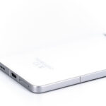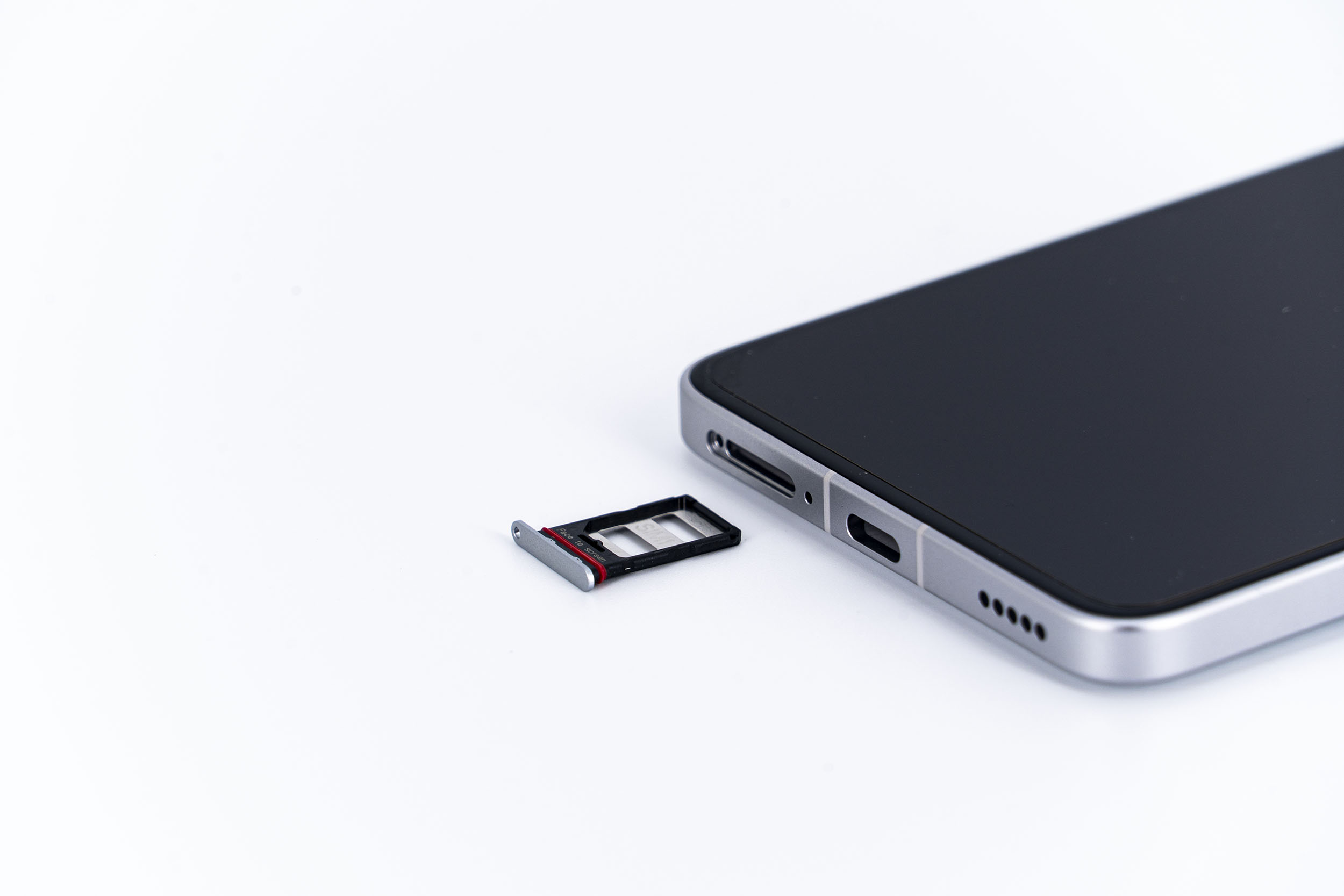 Sur la tranche supérieure on retrouve un capteur de son et un émetteur infrarouge, en dessous il y a un tiroir sim pouvant contenir 2 cartes sim, une sortie audio et un connecteur USB C.