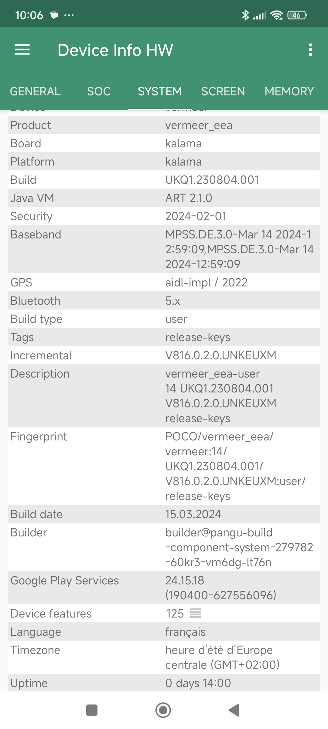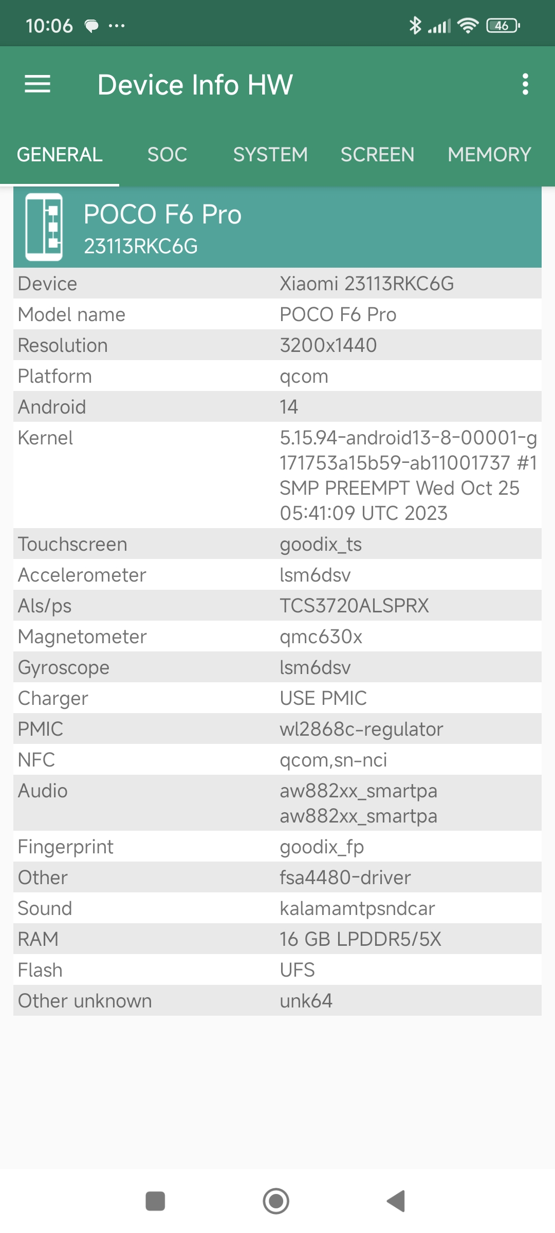 Les informations ci-dessous proviennent de l'application Device Info HW. L'application fournit des informations techniques détaillées sur le téléphone testé.J'ai testé la version 16Gb de RAM en LPDDR5/5X avec 1 Tb de stockage de ce POCO F6 Pro, je ne sais pas si d'autres versions seront commercialisées par la suite, mais c'est clairement un des téléphones les plus généreux en matière de mémoire parmi ceux que j'ai testés. Le Samsung Galaxy S24 Ultra ne fait pas mieux avec ses 12 Gb de mémoire.