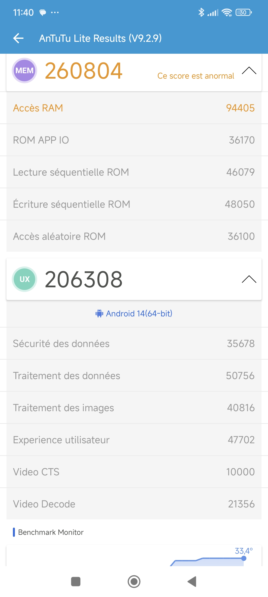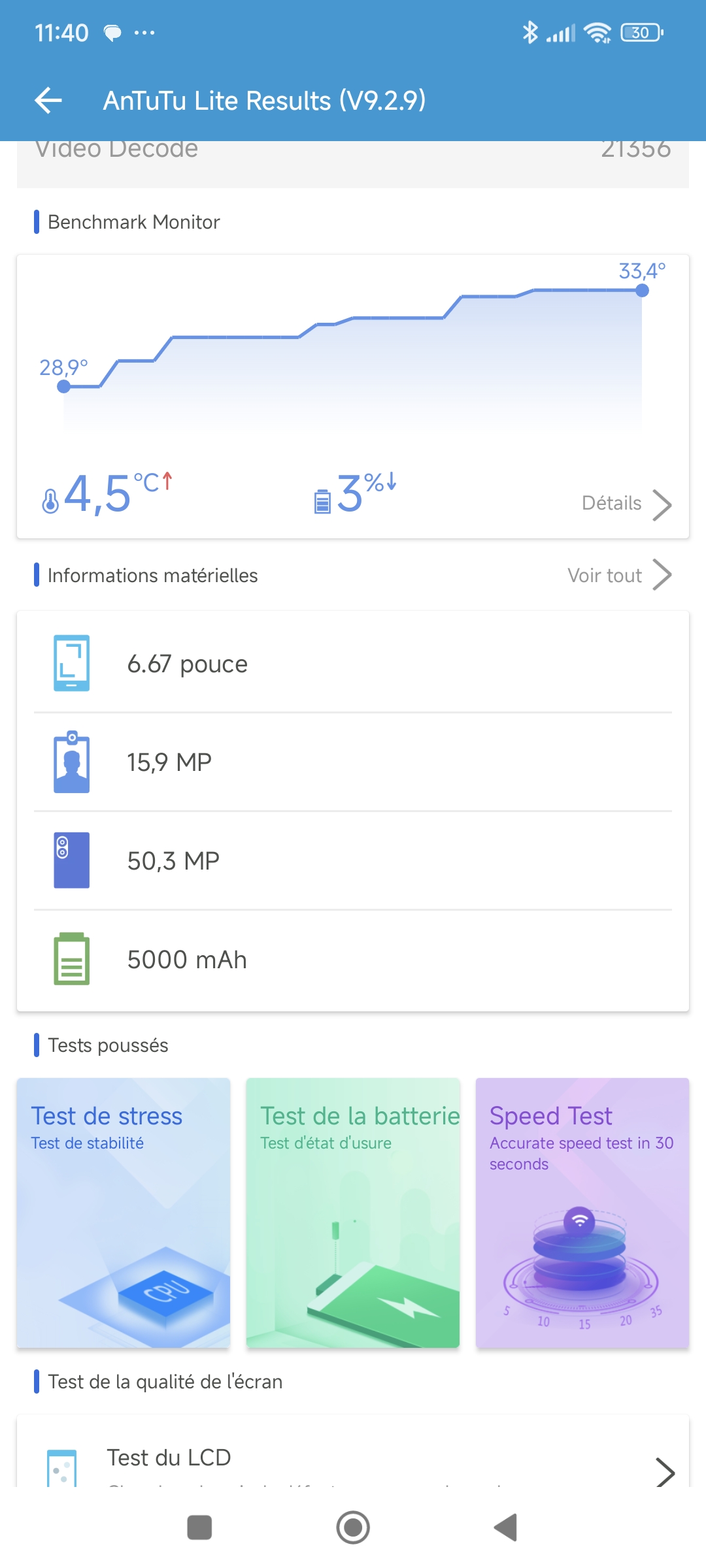 La température du téléphone est passée de 28.9°C à 33.4°C pendant le test, c'est une augmentation assez modérée qui semble indiquer que le refroidissement sera plus efficace que la génération précédente, mais c'est le test de charge (plus loin dans ce test) qui montrera si c'est bien le cas.