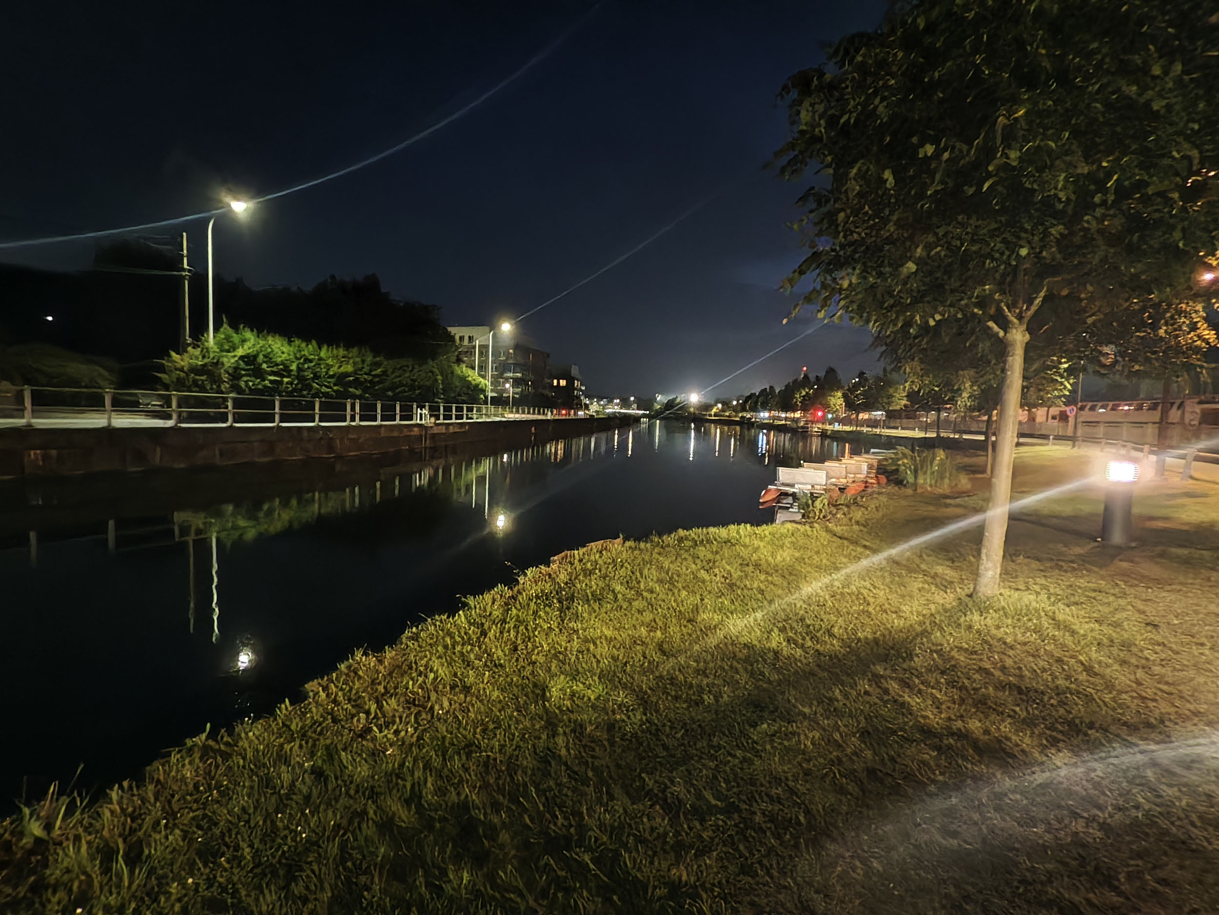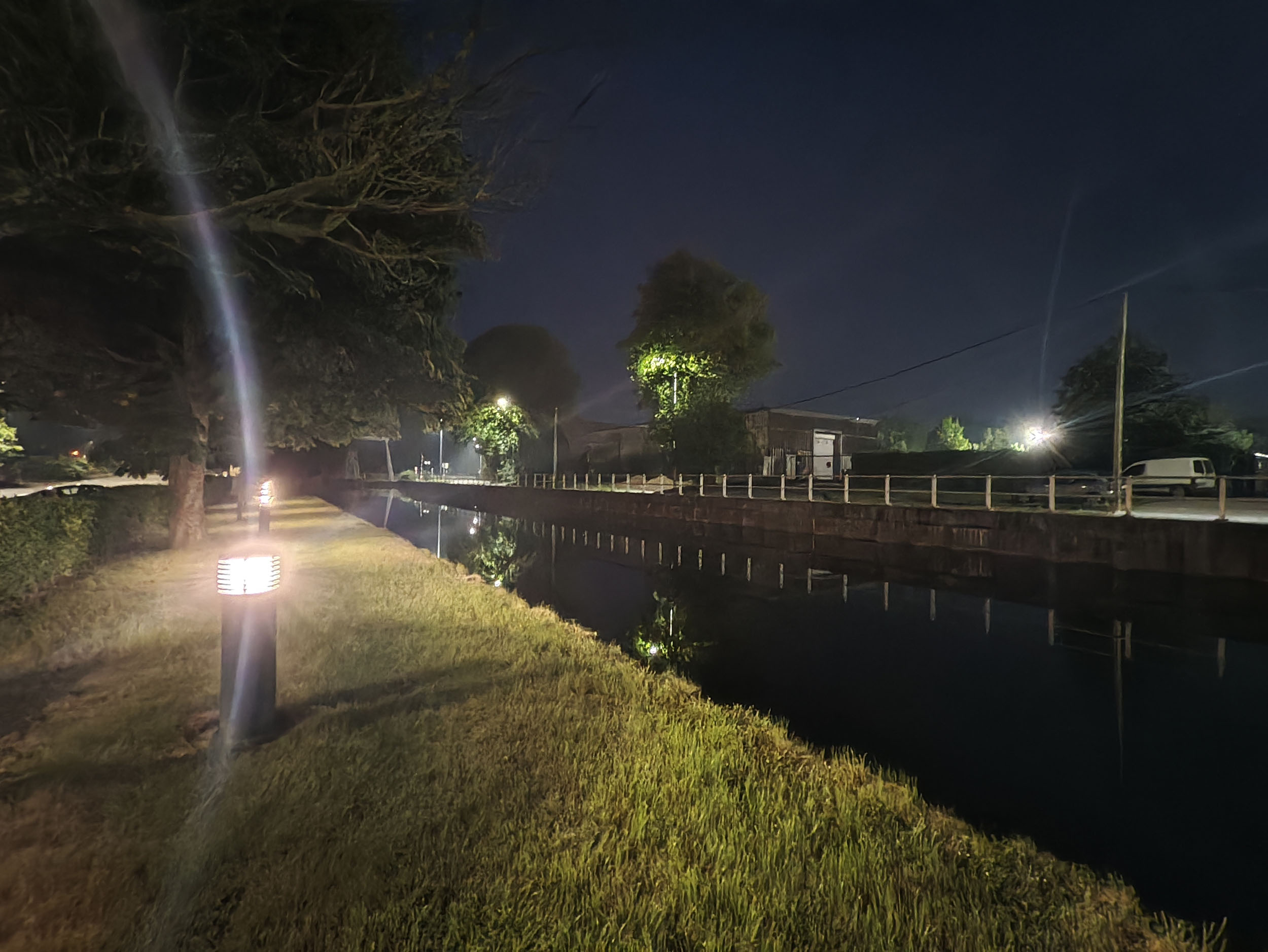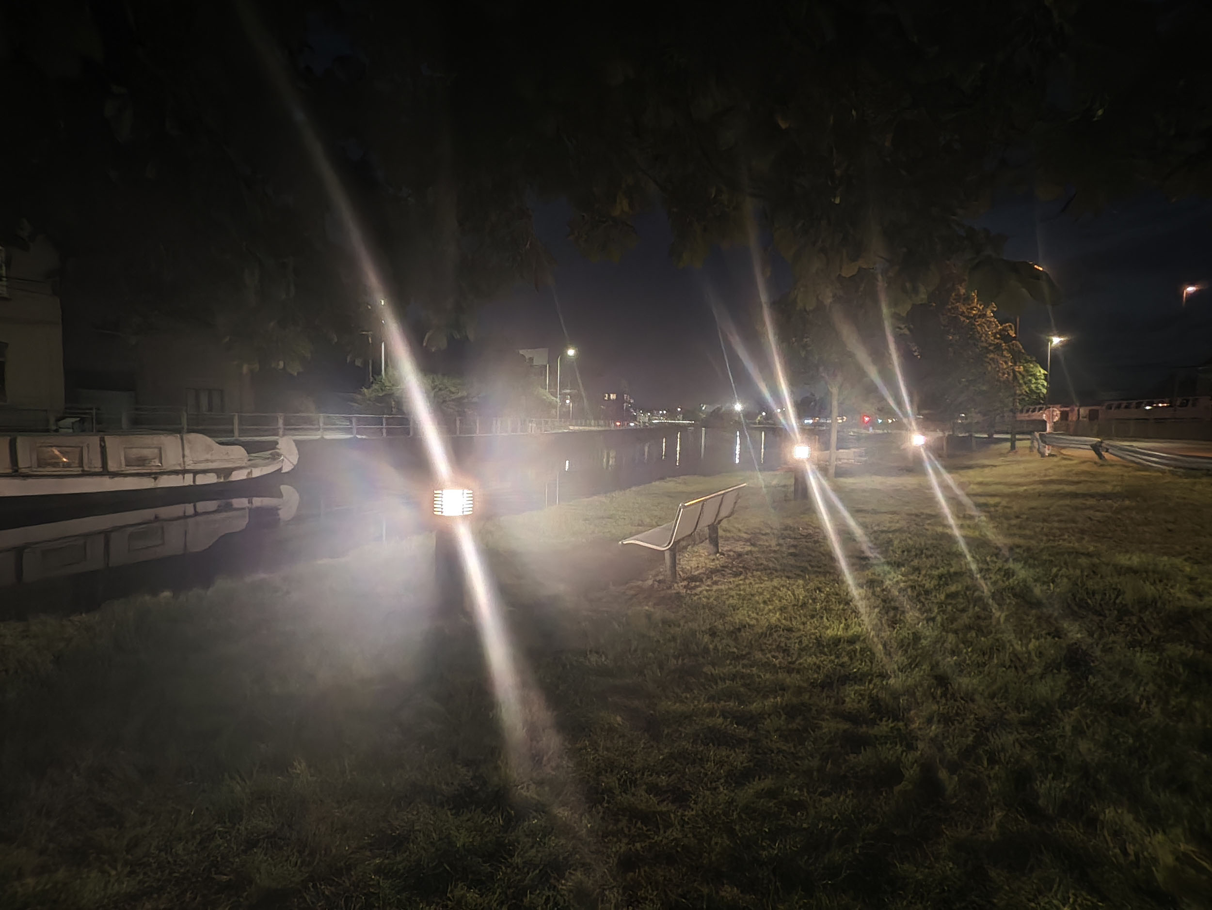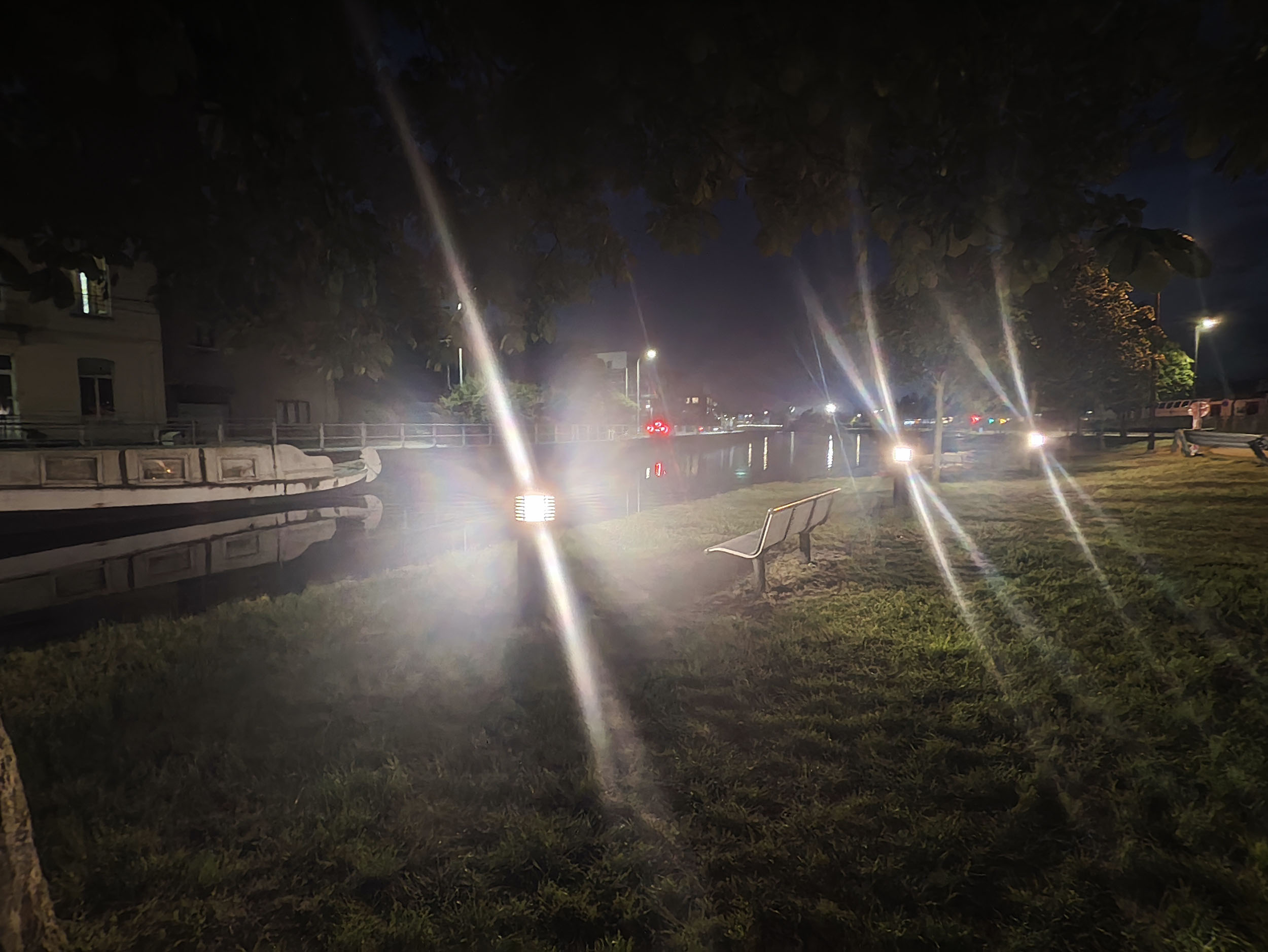 Les capteurs de ce type sont très rarement à l'aise avec la photo de nuit et celui-ci n'échappe pas à la règle mais plutôt pour une raison inhabituelle. Contrairement aux autres capteurs, le temps d'exposition est assez correct mais les sources de lumière se transforment en rayons traversant toute la photo. Il y a un effet de réflexion qui suit la courbure de la lentille et celui-ci n'est visible que pour les photos de nuit.