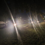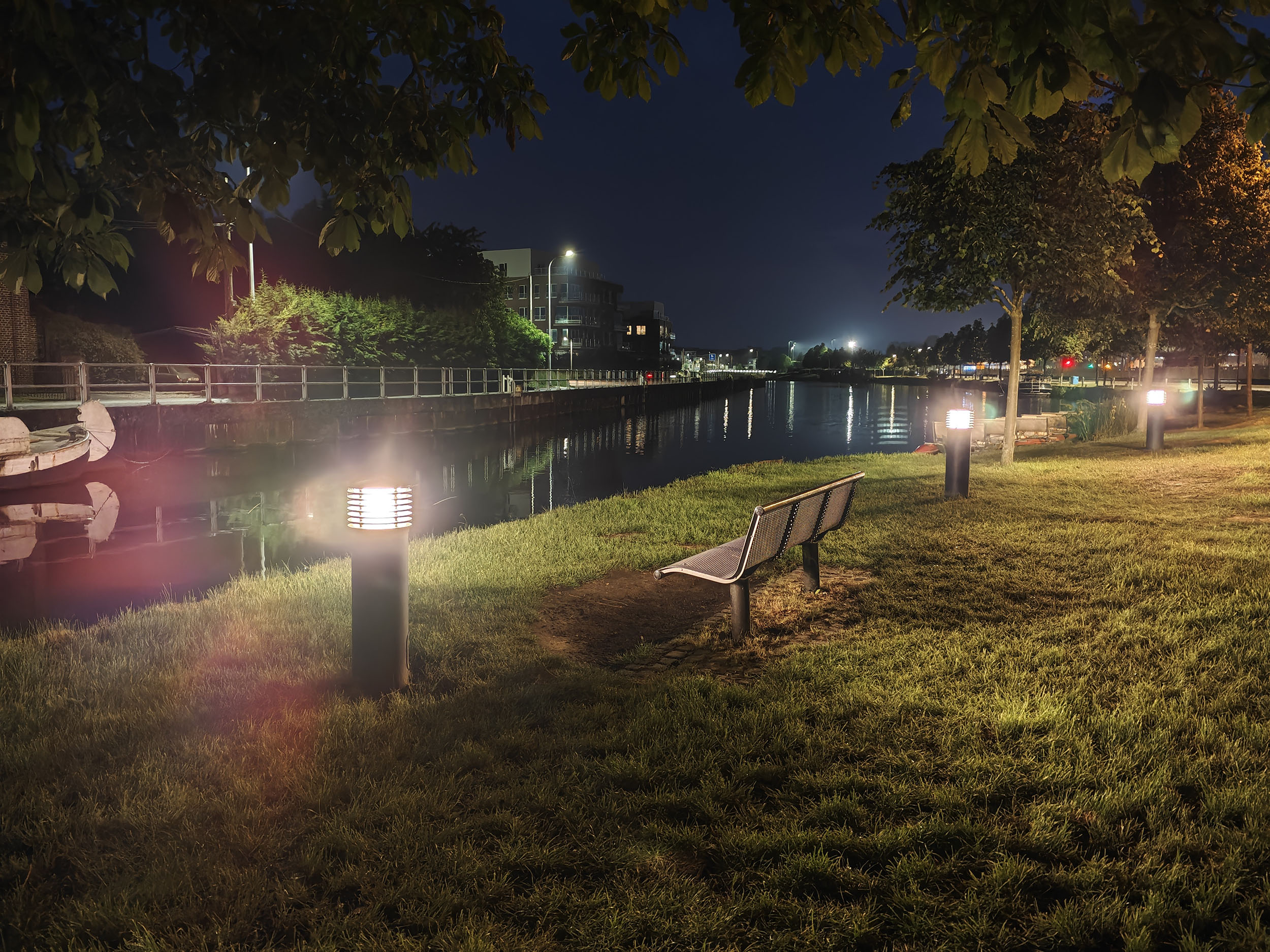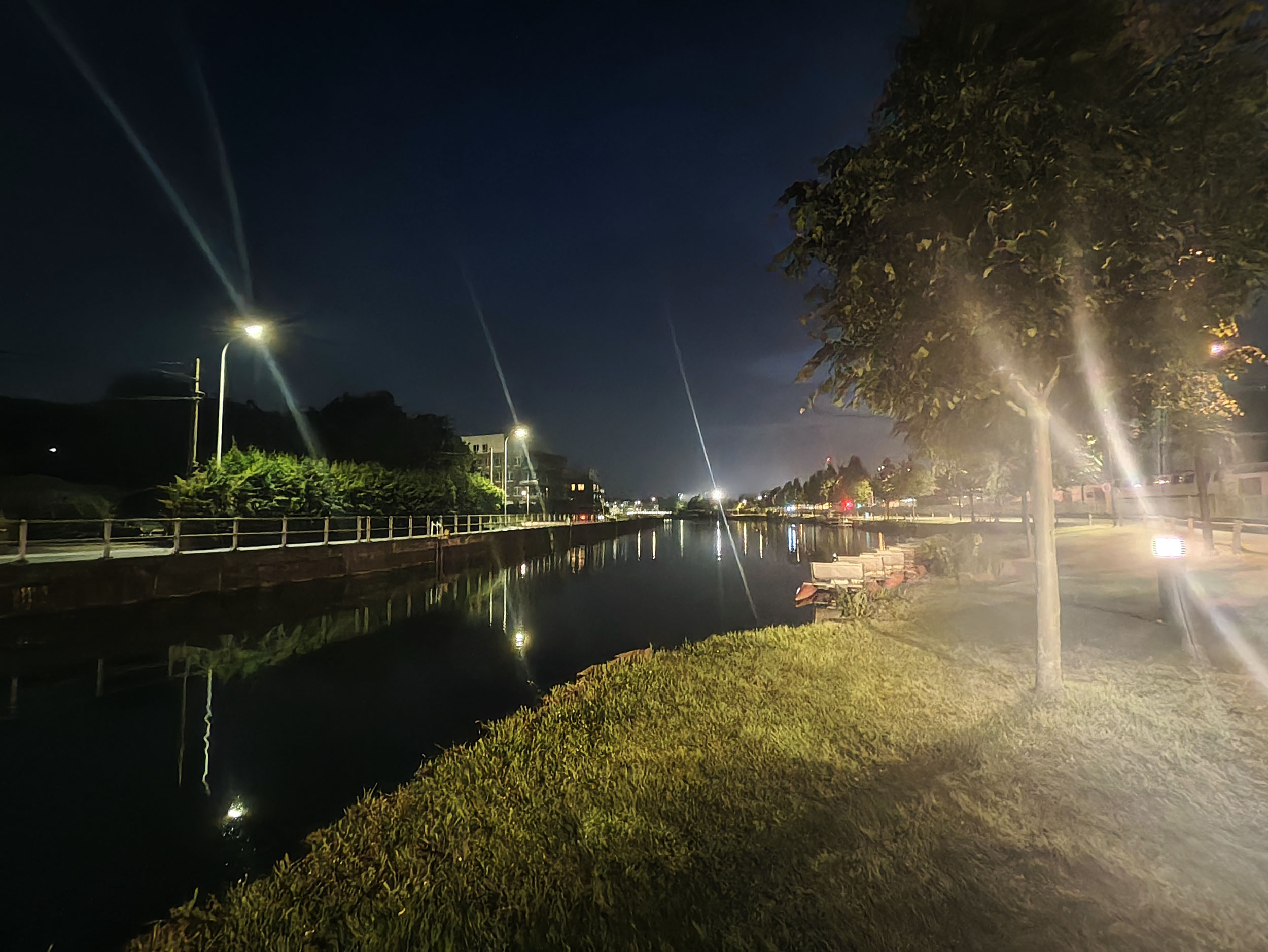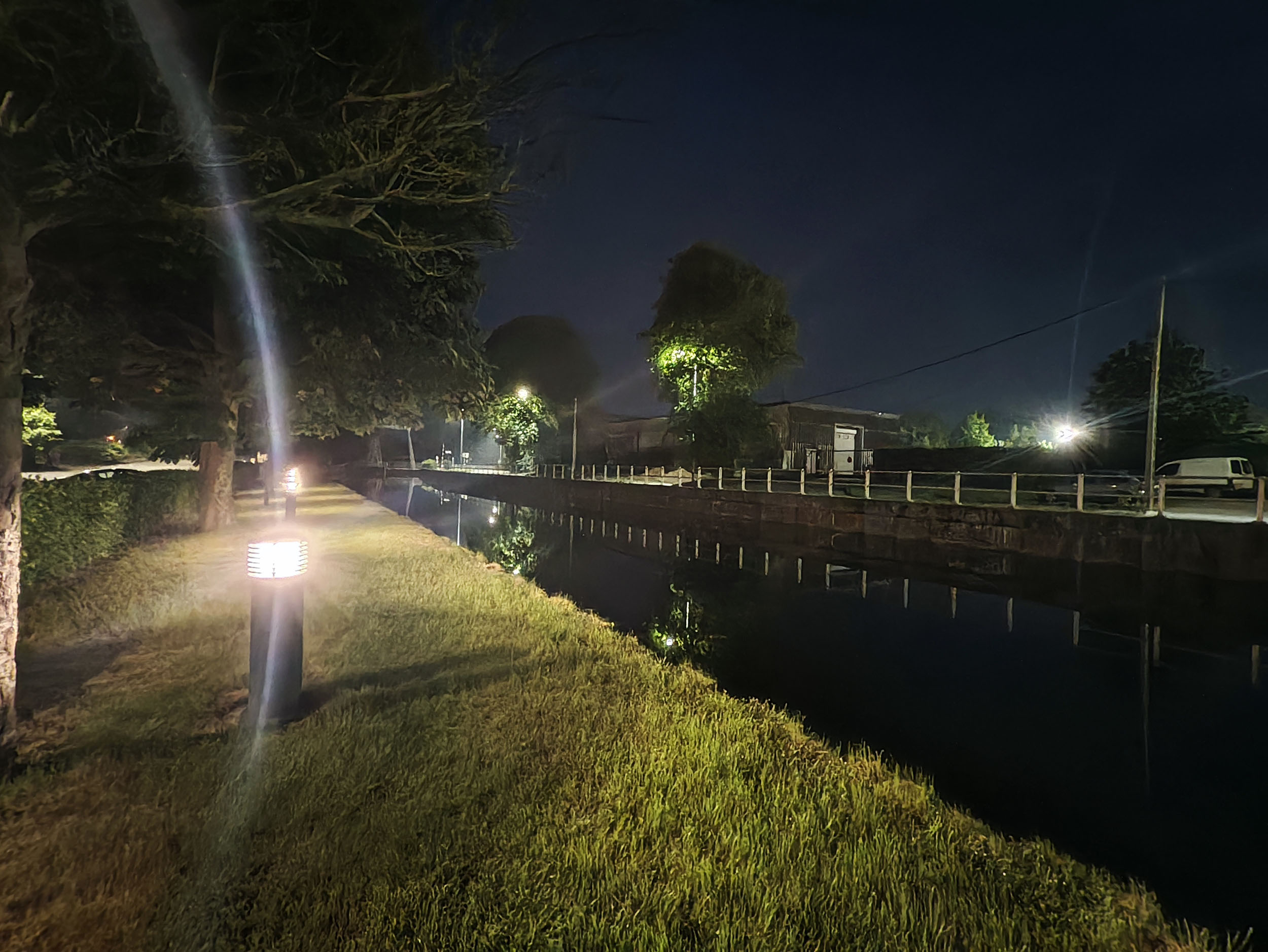 Les capteurs de ce type sont très rarement à l'aise avec la photo de nuit et celui-ci n'échappe pas à la règle mais plutôt pour une raison inhabituelle. Contrairement aux autres capteurs, le temps d'exposition est assez correct mais les sources de lumière se transforment en rayons traversant toute la photo. Il y a un effet de réflexion qui suit la courbure de la lentille et celui-ci n'est visible que pour les photos de nuit.