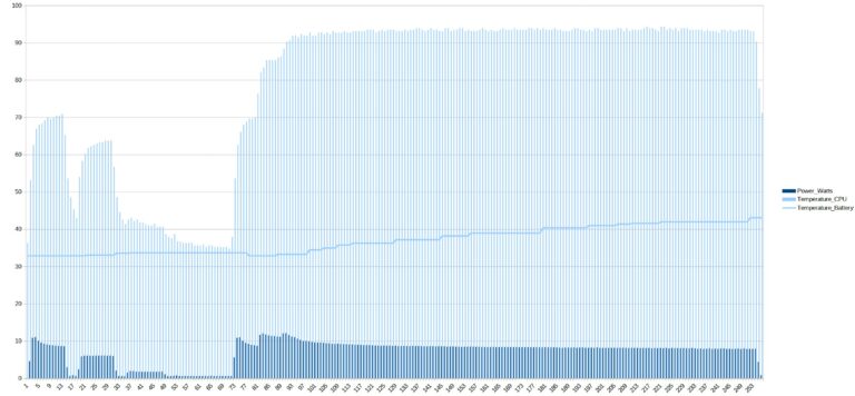 Pour mesurer la performance brute et la consommation d’énergie je pousse successivement tous les composants au maximum pendant plusieurs minutes. Sur ce graphe vous pouvez voir l’évolution du test avec d’abord le CPU, suivi du GPU et ensuite le FPU. Je pousse ensuite tout à fond pendant plusieurs minutes pour mesurer la consommation et la température.