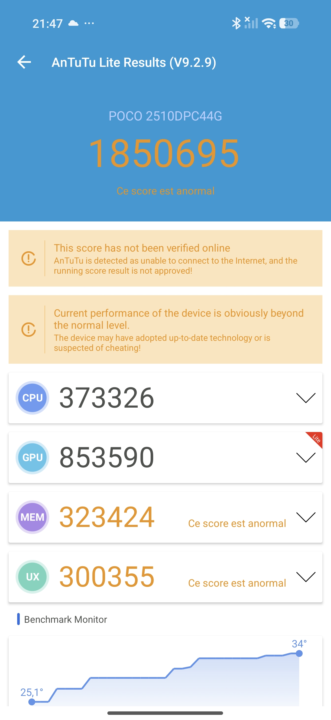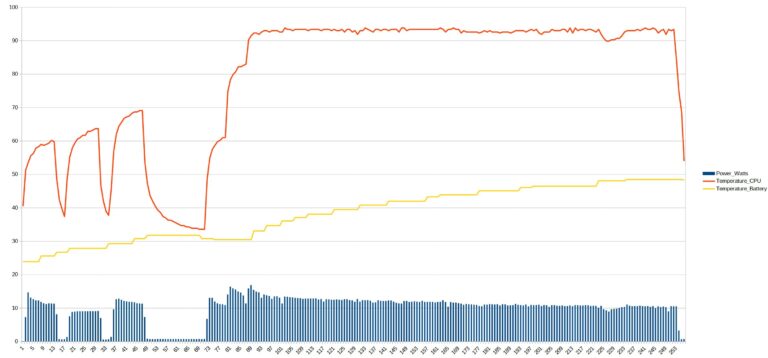 Si je me penche maintenant sur la température, on voit les courbes monter et descendre en fonction de la charge des composants avec une température comprise entre 38 et 69°C. Le téléphone a le temps de respirer et refroidir entre chaque mesure mais quand je pousse tout à fond, je ne lui laisse plus le temps de se reposer. La température du CPU monte en flèche et vient se stabiliser à 94°C. La montée en température affecte aussi la batterie qui va se stabiliser un peu en dessous de 50°C. Ces valeurs peuvent paraitre importantes, mais ce sont des valeurs tout à fait normales pour ce genre de situation. Le POCO gère assez bien le refroidissement, il est plus chaud au contact mais pas au point de ne plus pouvoir le tenir en main.