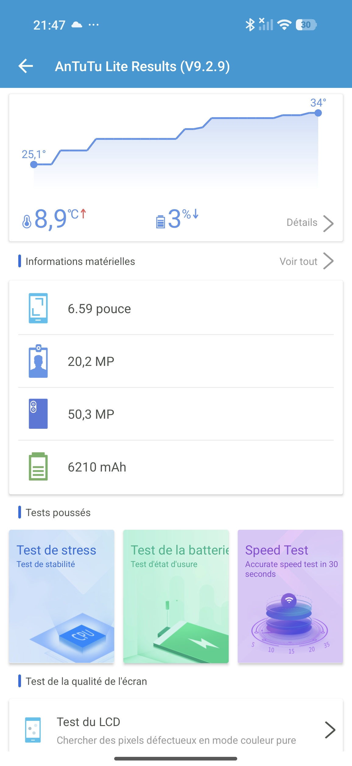 - il y a de nombreux capteurs de température dans le téléphone, ça me permettra de mesurer la montée en température lorsque le téléphone est poussé au maximum