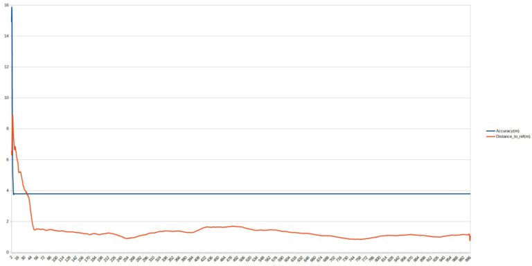 La courbe bleue est la courbe théorique fournie par le téléphone et on voit qu'elle s'établit rapidement un peu en dessous de 4 mètres. C'est un résultat assez standard pour les puces Qualcomm. Si je mesure la distance à partir des coordonnées, j'obtiens une image assez différentes. Le signal GPS prend plus de temps à se stabiliser, et c'est normal, mais ensuite il va se stabiliser à un niveau beaucoup plus réaliste. J'obtiens ici un niveau de précision d'environ 1m40, c'est un très bon résultat et même si les mesures fluctuent un peu, le niveau de précision reste bon sur l'ensemble des mesures.