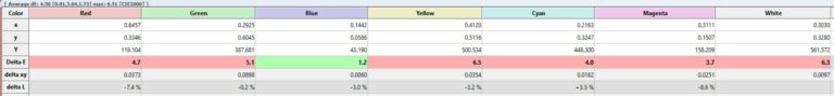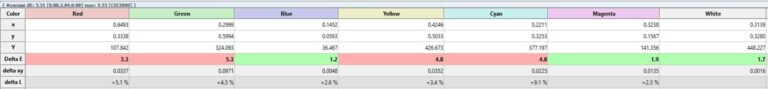 Le delta E s'établit à 3.5 avec un blanc parfait et la plupart des autres couleurs qui rentrent dans les rangs.