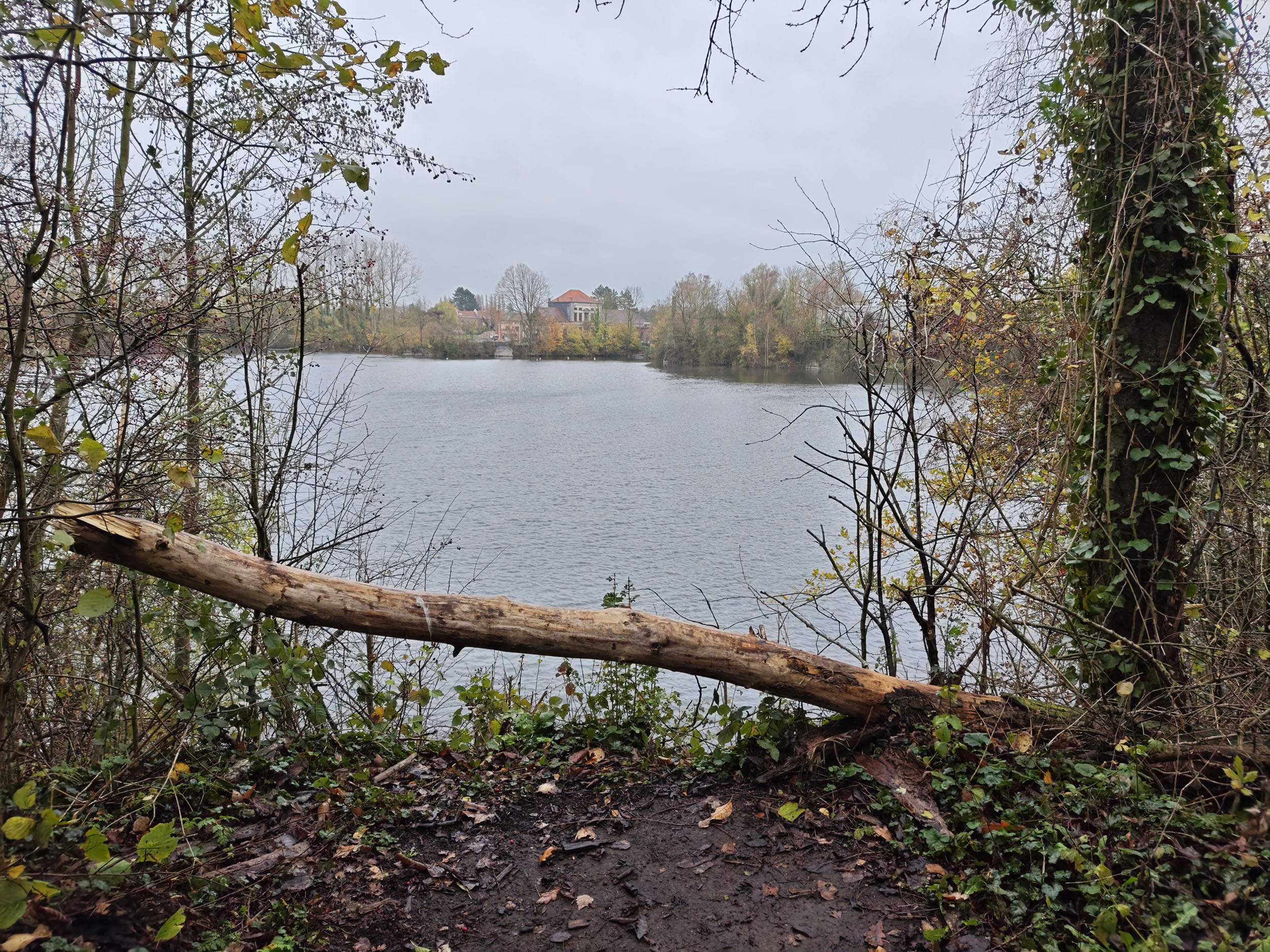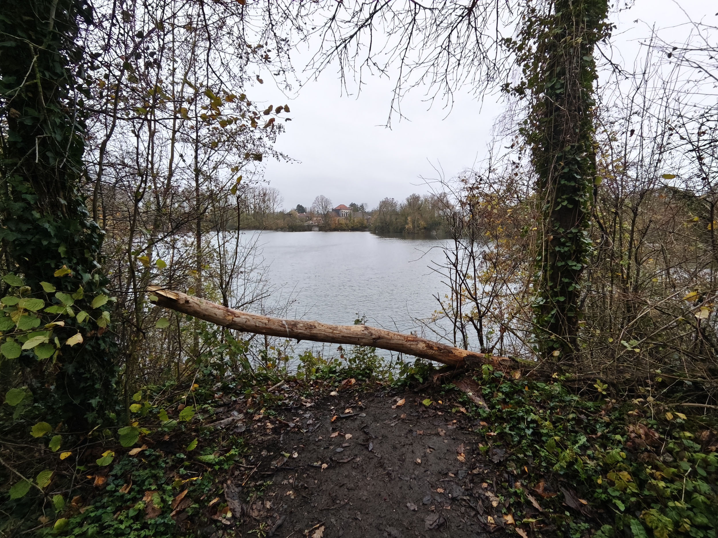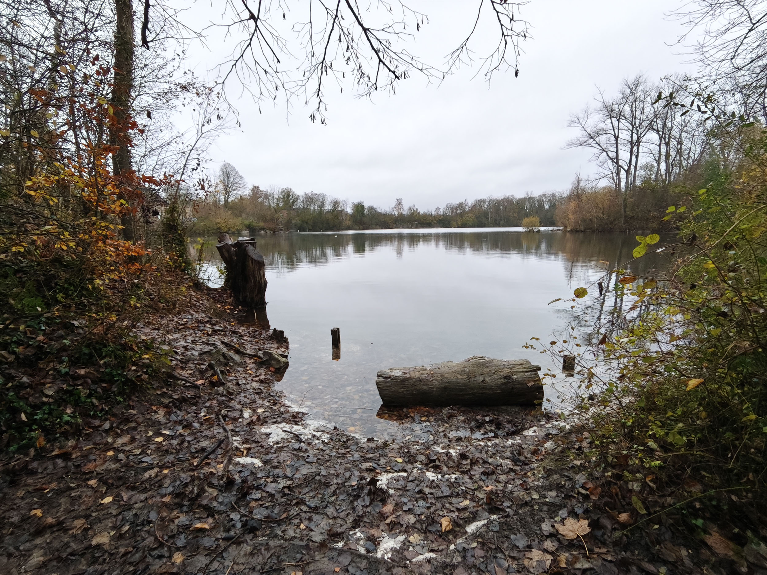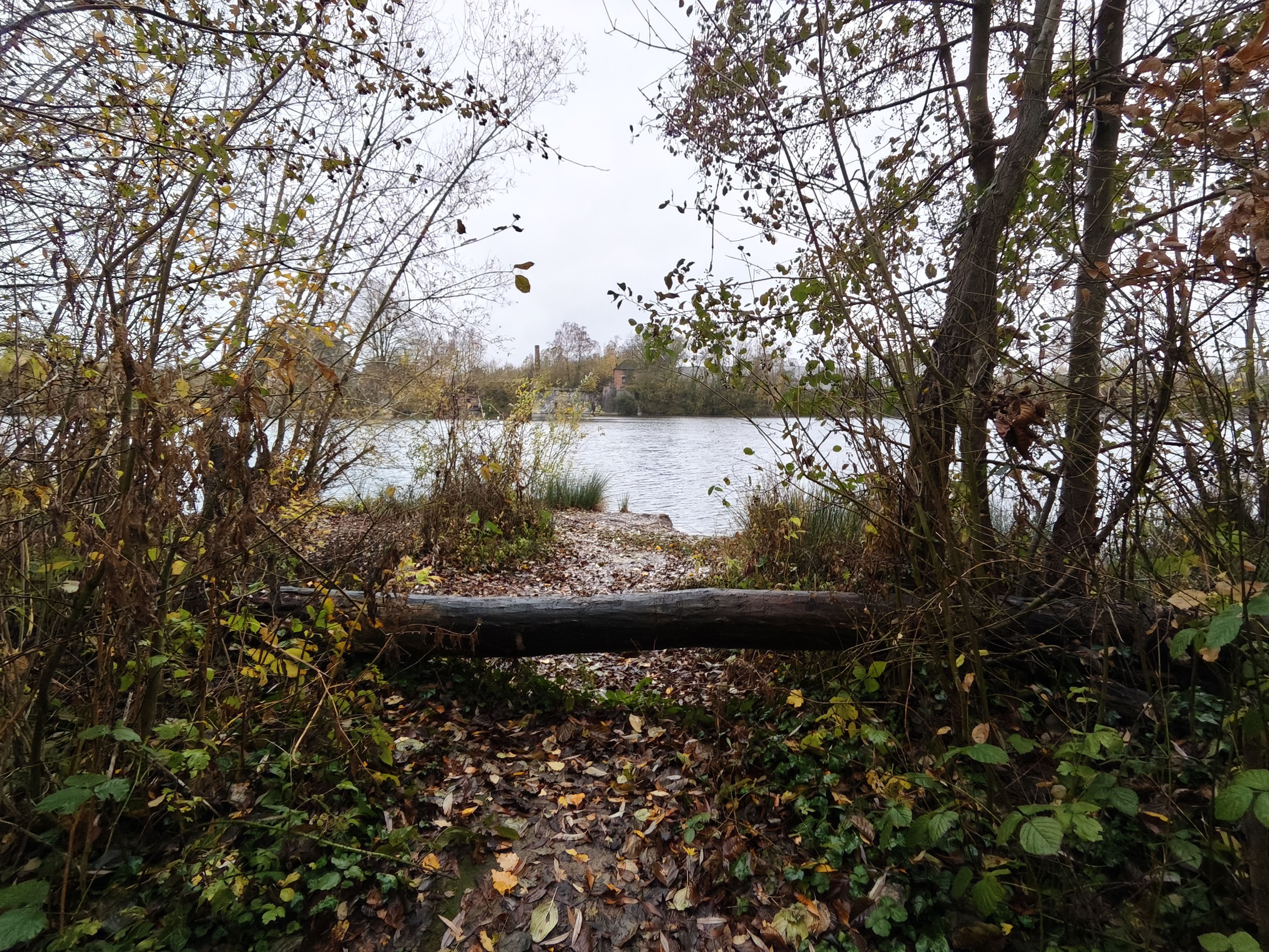 Le ciel était très nuageux quand j'ai pris cette photo, il pleuvait un peu et tous les chemins étaient imbibés d'eau. La photo est donc assez sombre mais elle reflète assez bien la réalité. Les capteurs de smartphone sont souvent mis en difficulté par ce genre de scène parce qu'ils doivent s'accrocher à quelque chose pour optimiser l'image. S'ils prennent le ciel comme référence, la photo sera trop sombre. S'ils prennent le sol comme référence, le ciel sera complètement brulé. Ici il y a une sorte d'équilibre, j'aperçois encore des détails dans le ciel et le feuillage n'est pas trop sombre. Les couleurs d'automne sont bien restituées même si l'exposition aurait pu être un peu plus marquée. La température des couleurs est correcte là où les smartphones produisent souvent des images soit trop chaudes soit trop froides.