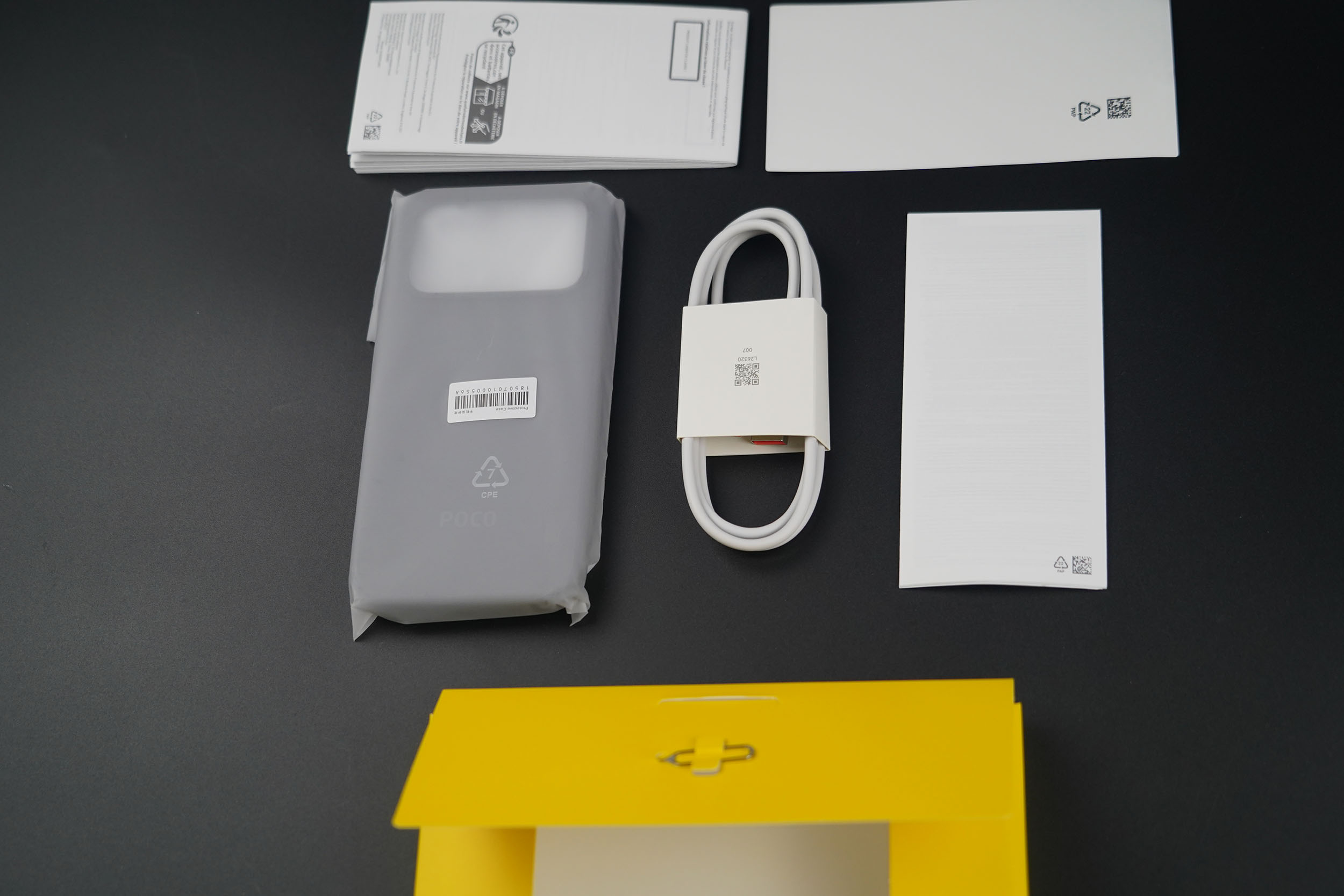 Les boites POCO sont presque les mêmes depuis quelques années maintenant, elles sont facilement reconnaissables à leurs couleurs. Ce qui a changé c'est l'absence d'un chargeur, j'avais un chargeur de 90 watts avec la boite du POCO F7 Pro, maintenant il n'y a plus de chargeur.
