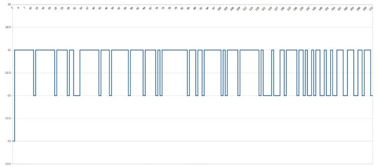 On voit ici que le signal wifi est très stable sur l'ensemble des mesures avec une fluctuation entre -13 et -11 dBm. Non seulement le signal est resté très stable, mais en plus, il est très bon. J'ai rarement obtenu un signal d'une telle qualité sur l'ensemble des mesures. J'obtiens une moyenne de -11.45 dBm ce qui va classer ce téléphone parmi ceux qui ont le meilleur signal wifi.