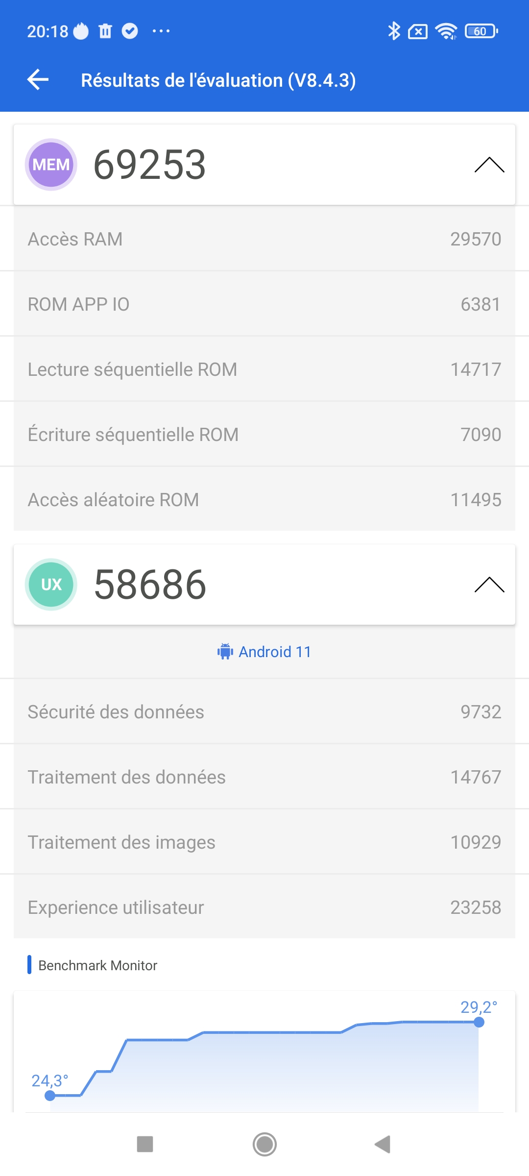 Je n'ai pas eu la possibilité de faire autant de mesures que d'habitude pour évaluer la performance réseau de ce téléphone mais j'ai quand même réussi à faire 570 mesures et j'ai obtenu un signal moyen de -96.78 dBm. Avec ma sonde j'ai obtenu un signal moyen de -93.71 dBm, il y a donc un écart d'environ 3 dBm, ce n'est pas un écart très important. Le Poco a donc une bonne sensibilité au réseau, il se situe dans la moyenne haute.