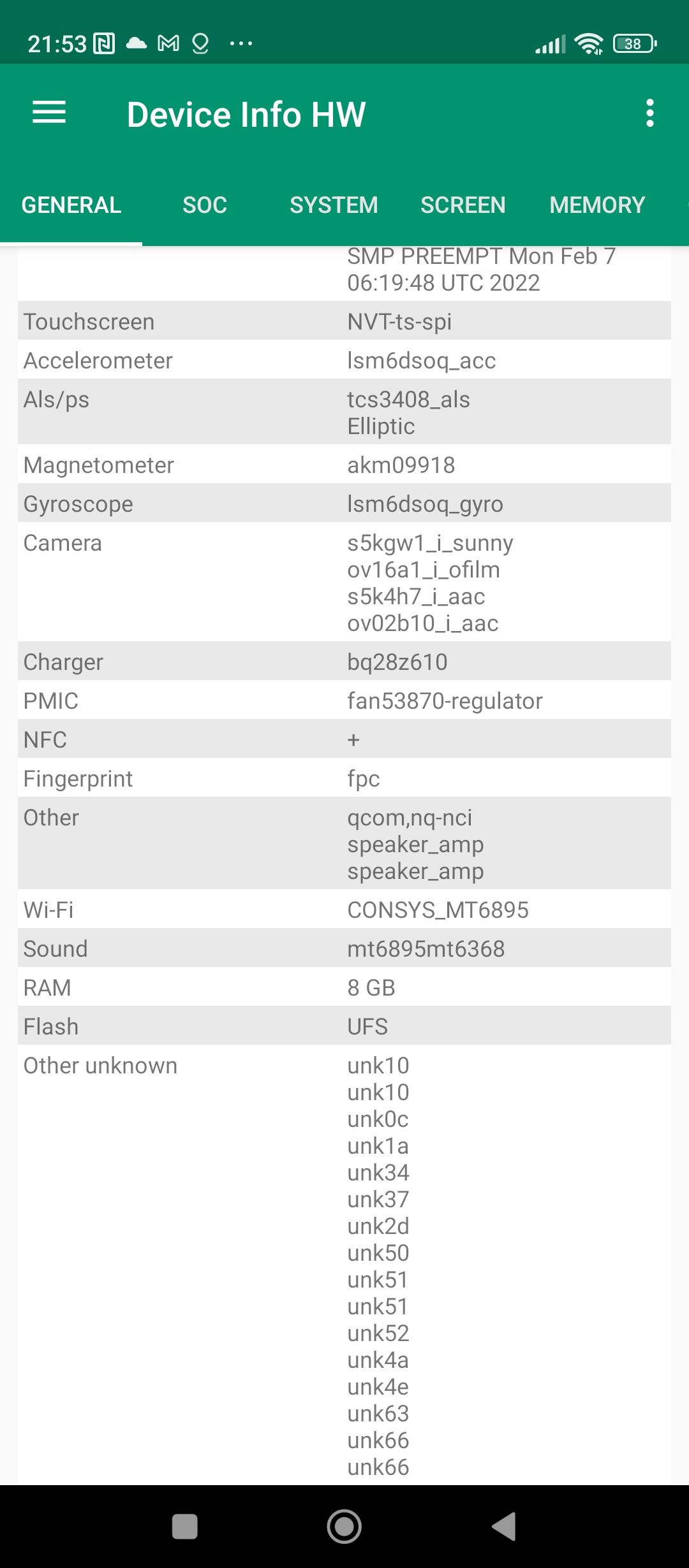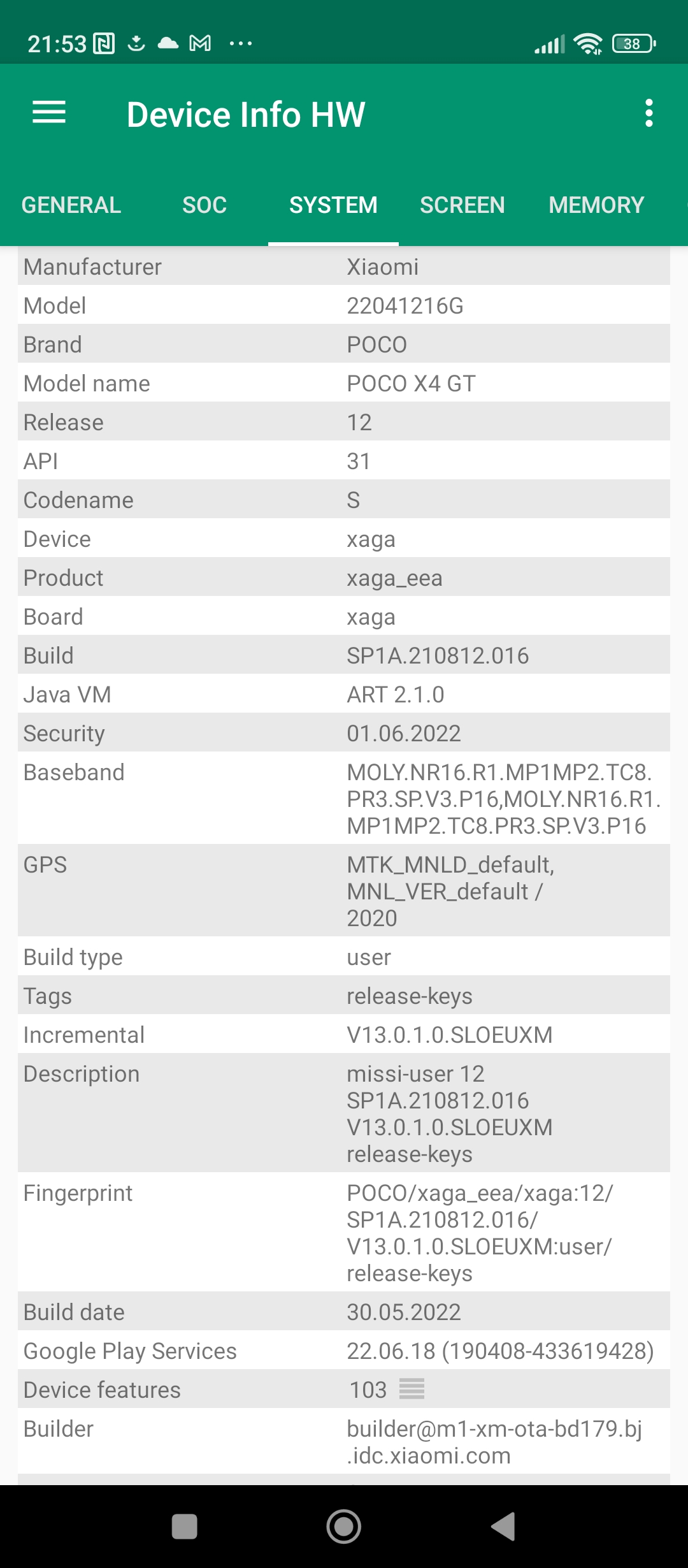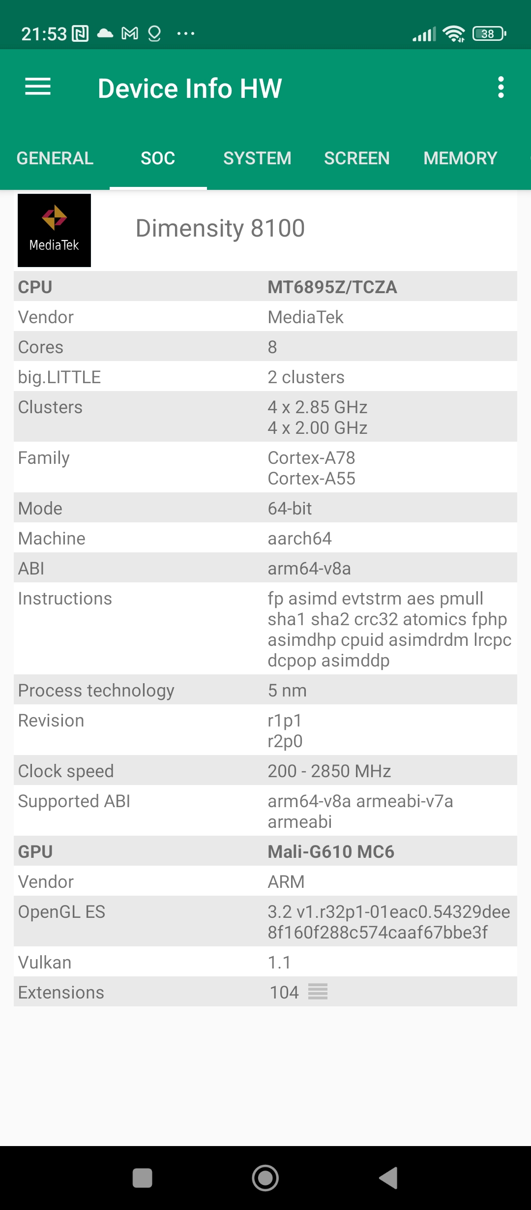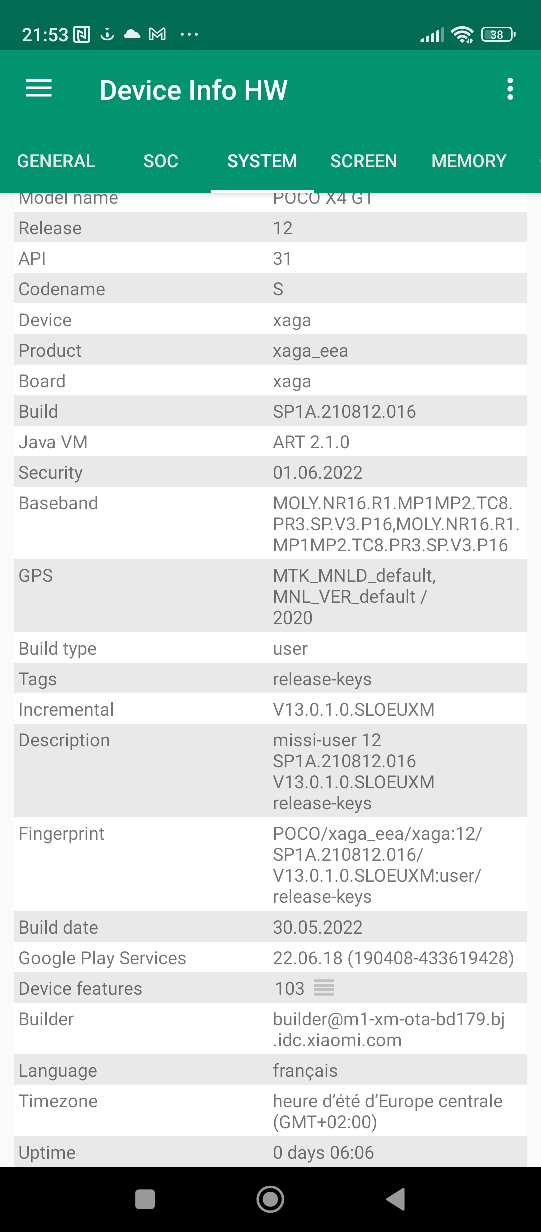 Les informations ci-dessous proviennent de l'application Device Info HW. L'application fournit des informations techniques détaillées sur le téléphone testé.Le Poco X4 GT tourne sur une architecture que je n'ai pas encore testée, c'est donc une vraie nouveauté là où Poco/Xiaomi ont pris l'habitude de ré-utiliser toujours le même matériel en changeant juste quelques détails. Je reviens sur la partie CPU/GPU dans le paragraphe suivant mais je vois aussi d'autres choses intéressantes: