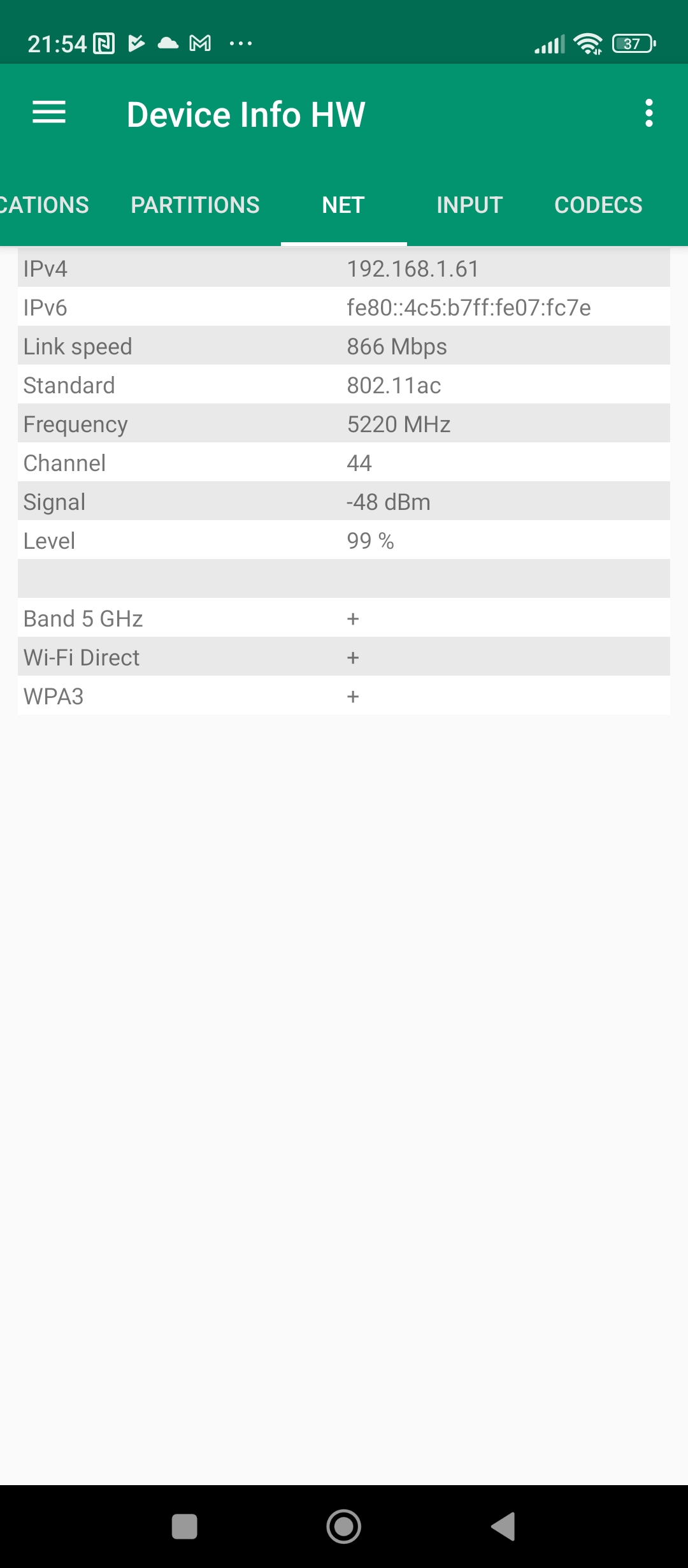 Le Poco X4 GT utilise un chipset wifi Mediatek MT6895 qui est directement liée aux CPU de type Dimensity 8000. Cette puce offre un bon niveau de sensibilité en wifi car j'ai obtenu un signal de -16 dBm à proximité du routeur et -60 dBm à distance.