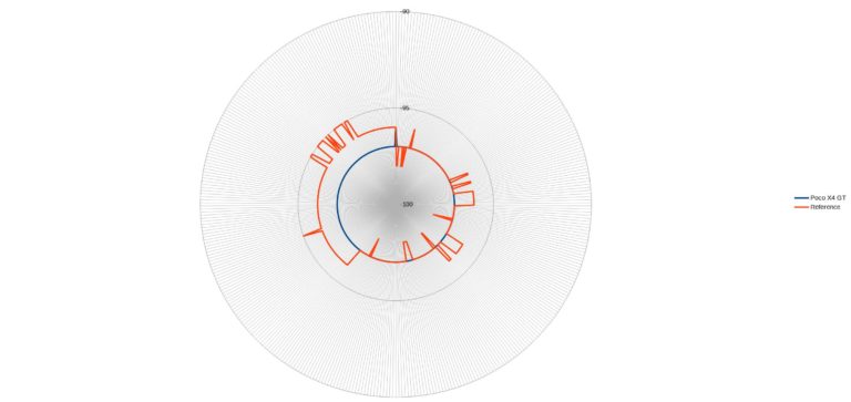 J'ai constaté une petite dégradation de la fidélité du son sur les derniers Poco et je retrouve cette dégradation sur ce modèle. Le graphe ci-dessous montre que le Poco X4 GT est capable de reproduire toutes les fréquences mais avec un écart de quelques décibels sur certaines fréquences. J'ai ici comparé le Poco X4 Pro avec le Poco X4 GT et je vois que le Poco X4 GT favorise les fréquences basses et perd un peu sur les fréquences élevées. L'irrégularité du signal est moins importante que le Poco X4 Pro mais elle existe. Il est peut être possible d'égaliser le signal avec les paramètres audio mais je teste tous les téléphones avec les paramètres d'usine sinon la comparaison n'est plus correcte.