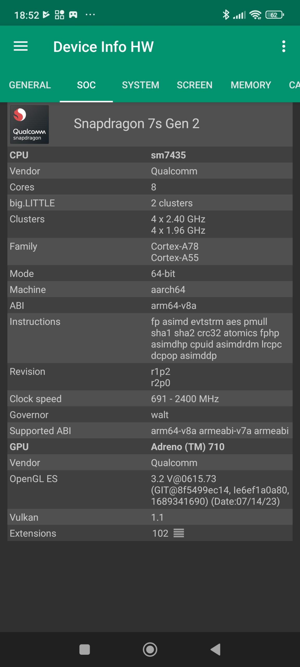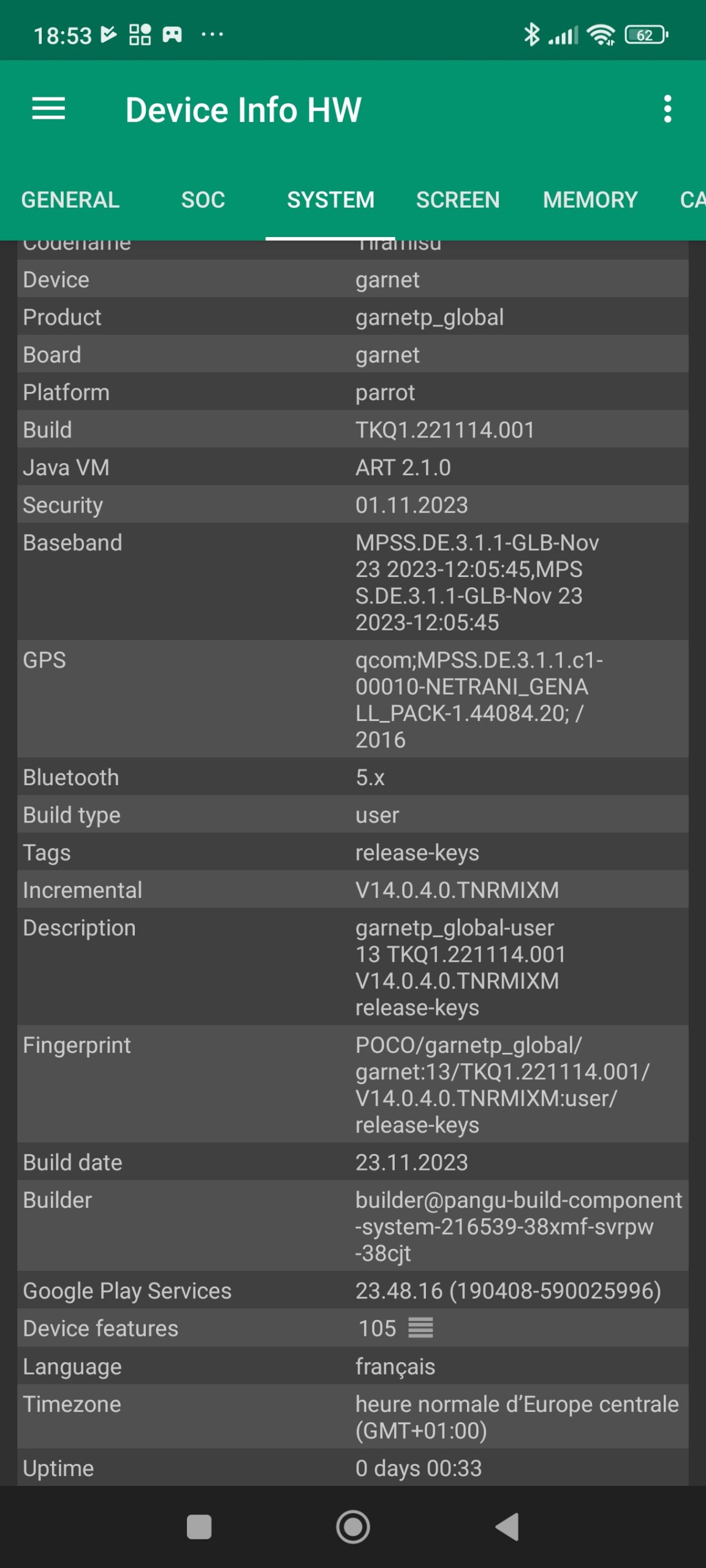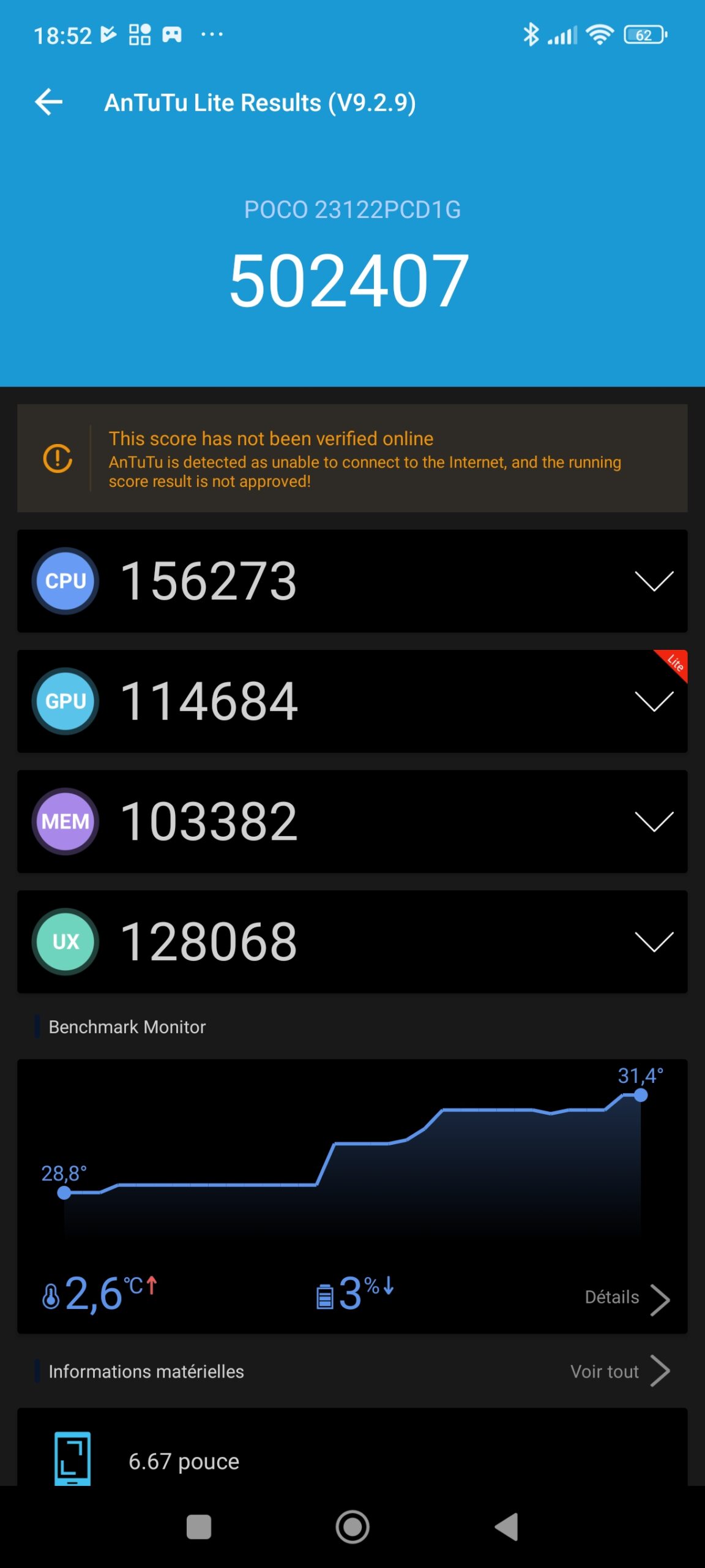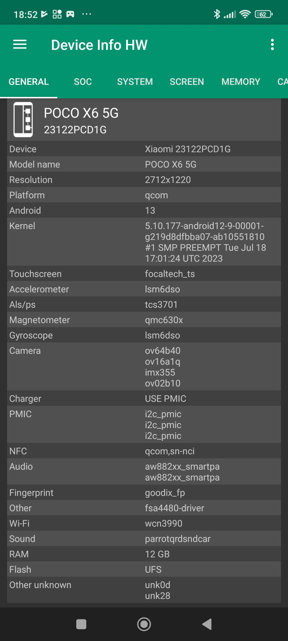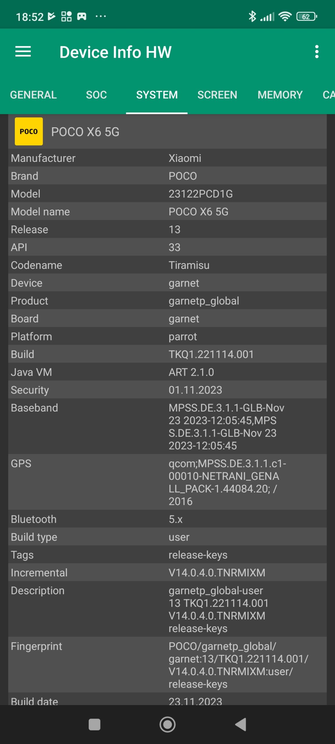 Les informations ci-dessous proviennent de l'application Device Info HW. L'application fournit des informations techniques détaillées sur le téléphone testé.Comme je le mentionnais déjà en introduction de ce test, le POCO X6 tourne sur une nouvelle architecture Snapdragon qui aura un impact sur le CPU, GPU, GPS, Bluetooth, wifi et le modem. Tous les téléphones utilisant la même architecture offriront donc le même type de performance que ce POCO X6.