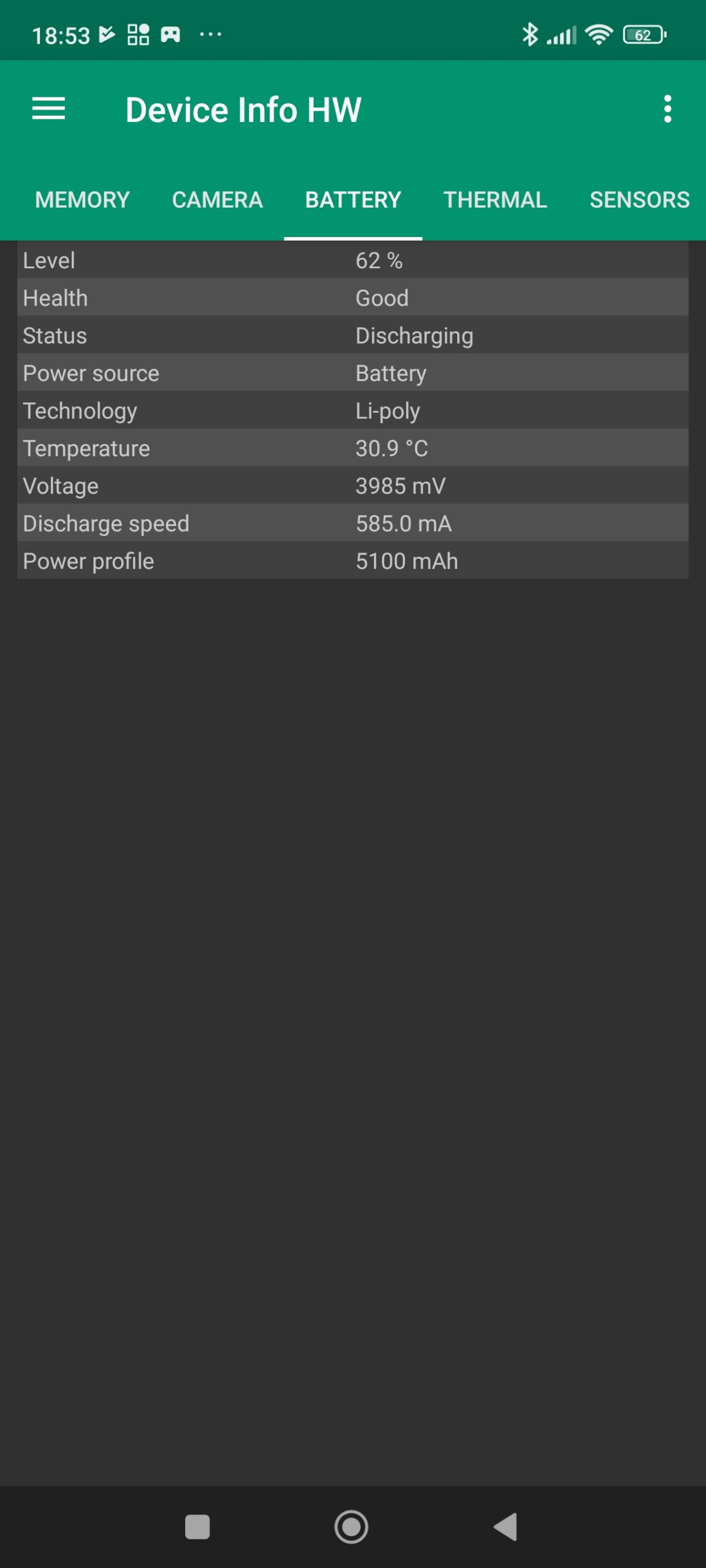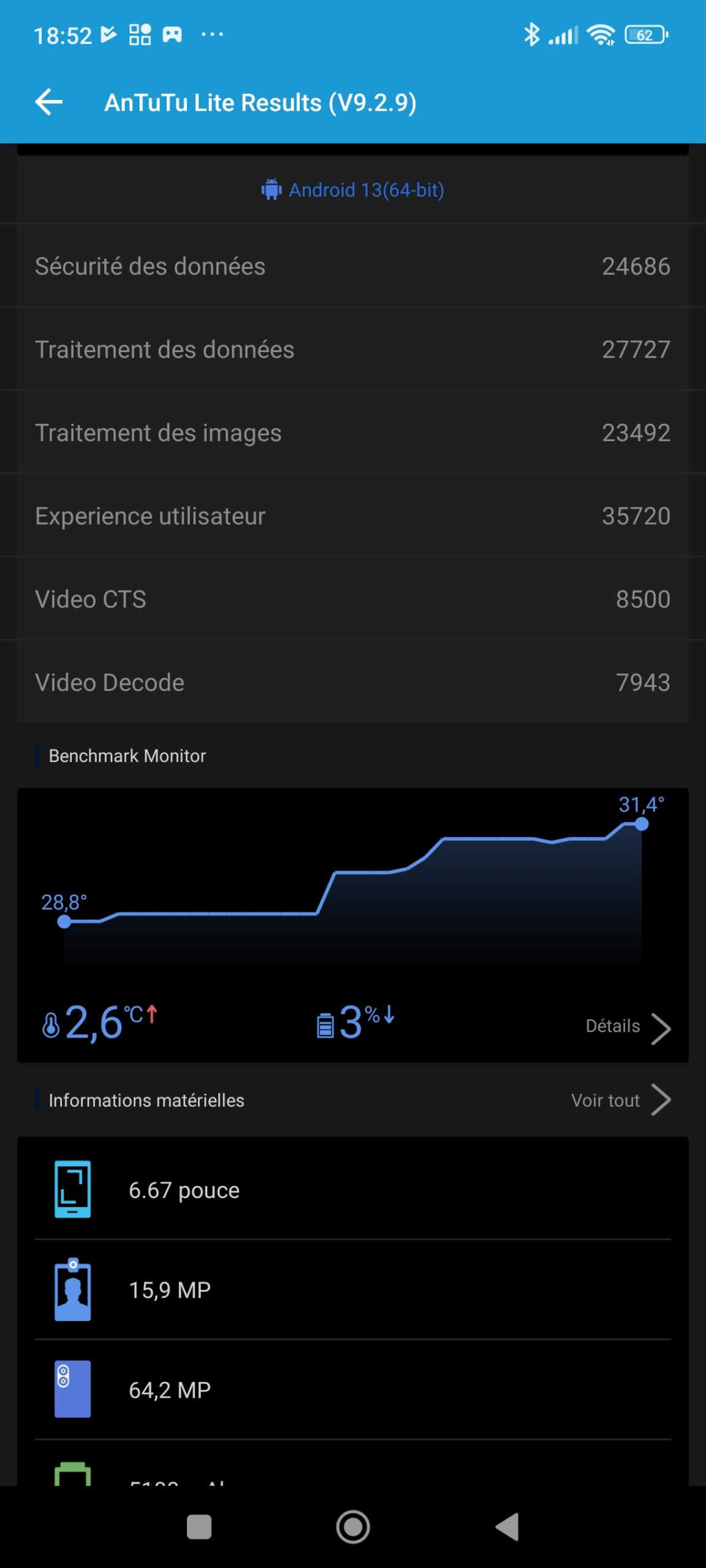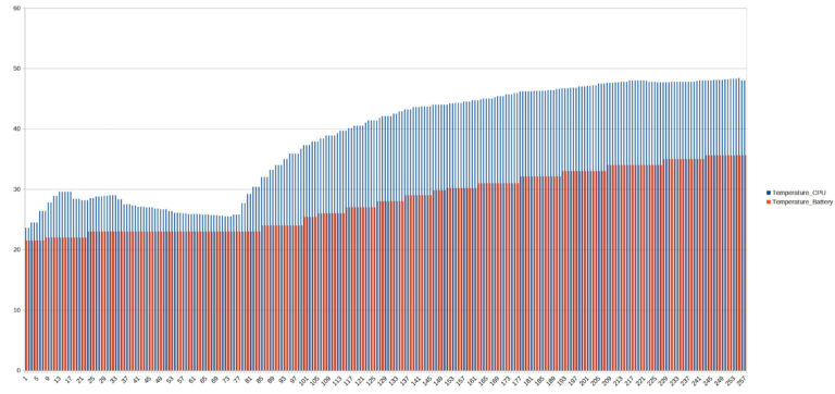 La température est directement liée à la charge et on voit qu'elle évolue de façon constate pour le CPU pour dépasser les 40°C (jusque presque 50°C) après 7 minutes mais à aucun moment je n'ai ressenti une forme de réchauffement sur le téléphone, la chaleur est bien dissipée. La batterie monte elle aussi mais de façon plus modérée pour atteindre environ 35°C après plus de 7 minutes de charge.