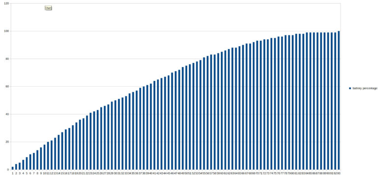 Pour tester l'autonomie des batteries j'ai développé une application qui mesure le niveau de batterie minute par minute jusqu'à ce que la batterie soit vide. Cette application consomme environ une dizaine de pourcent des ressources du téléphone et je fais un test avec une luminosité d'écran à 100% et un autre avec une luminosité à 50%. Ce test vise à reproduire une utilisation contemplative d'un téléphone (ex: surfer sur internet, lire des articles, passer du temps sur les réseaux sociaux). Ces résultats ne sont pas valables pour une utilisation intensive type gaming/streaming. [battery] Charge de la batterie