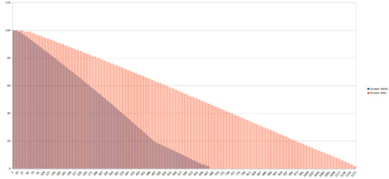 J'ai obtenu une autonomie de 673 minutes avec la luminosité à 100% et 1170 minutes avec la luminosité à 50%, c'est un bon score indiquant que le téléphone n'est pas trop gourmand et que l'écran a une consommation linéaire (Luminosité à 100% = la moitié de l'autonomie). Pour le test avec la luminosité à 100% je vois que le téléphone a pris la décision tout seul de se mettre en mode économie de batterie car la courbe s'aplatit sur les 20 derniers pourcents.