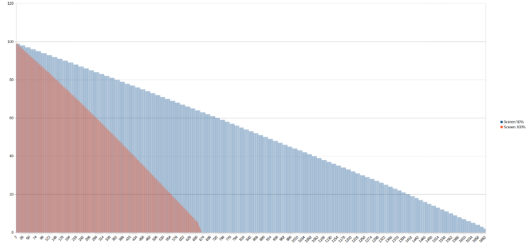 J'ai obtenu une autonomie de 664 minutes avec la luminosité de l'écran à 100% et 1684 minutes avec la luminosité à 50%. L'efficacité énergétique du téléphone à 100% est dans la moyenne, l'autonomie est donc bonne et vous offrira 2 à 3 jours d'autonomie en usage normal si vous trouvez votre équilibre entre 50 et 100% de luminosité. L'écran n'est pas excessivement lumineux à 100% mais l'autonomie 2.5x meilleure à 50%, vous devrez donc trouver l'équilibre qui vous convient le mieux.