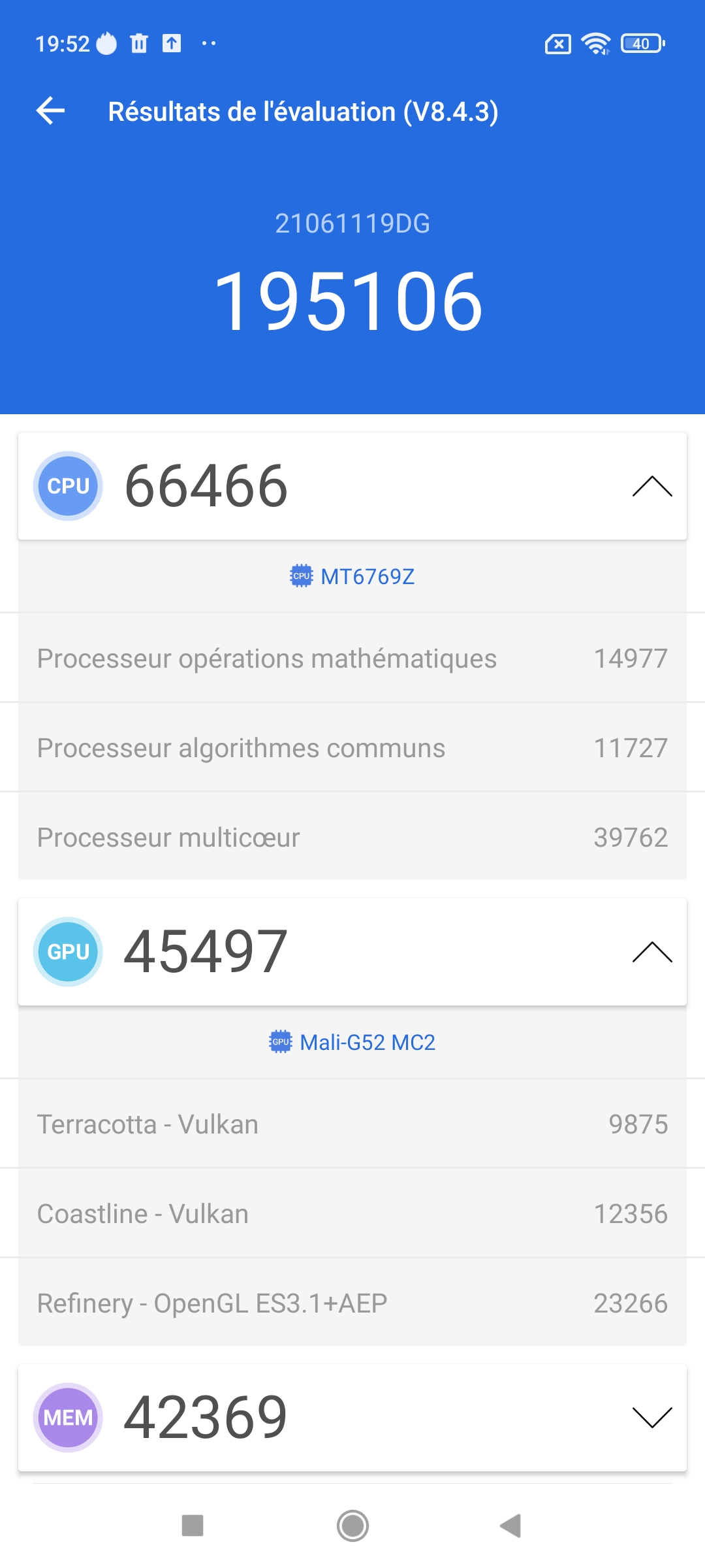 Le Redmi 10 s'appuie sur un CPU Mediatek Helio G85, c'est un processeur d'entrée de gamme qui va offrir des performances à un Poco M3 ou un Redmi Note 9. Pour la partie graphique il s'appuie sur le GPU Mali G52, c'est un GPU que l'on retrouve dans de nombreux téléphones d'entrée de gamme. Ce n'est pas un GPU pour gamers mais vous pourrez sans problèmes jouer aux jeux simples.
