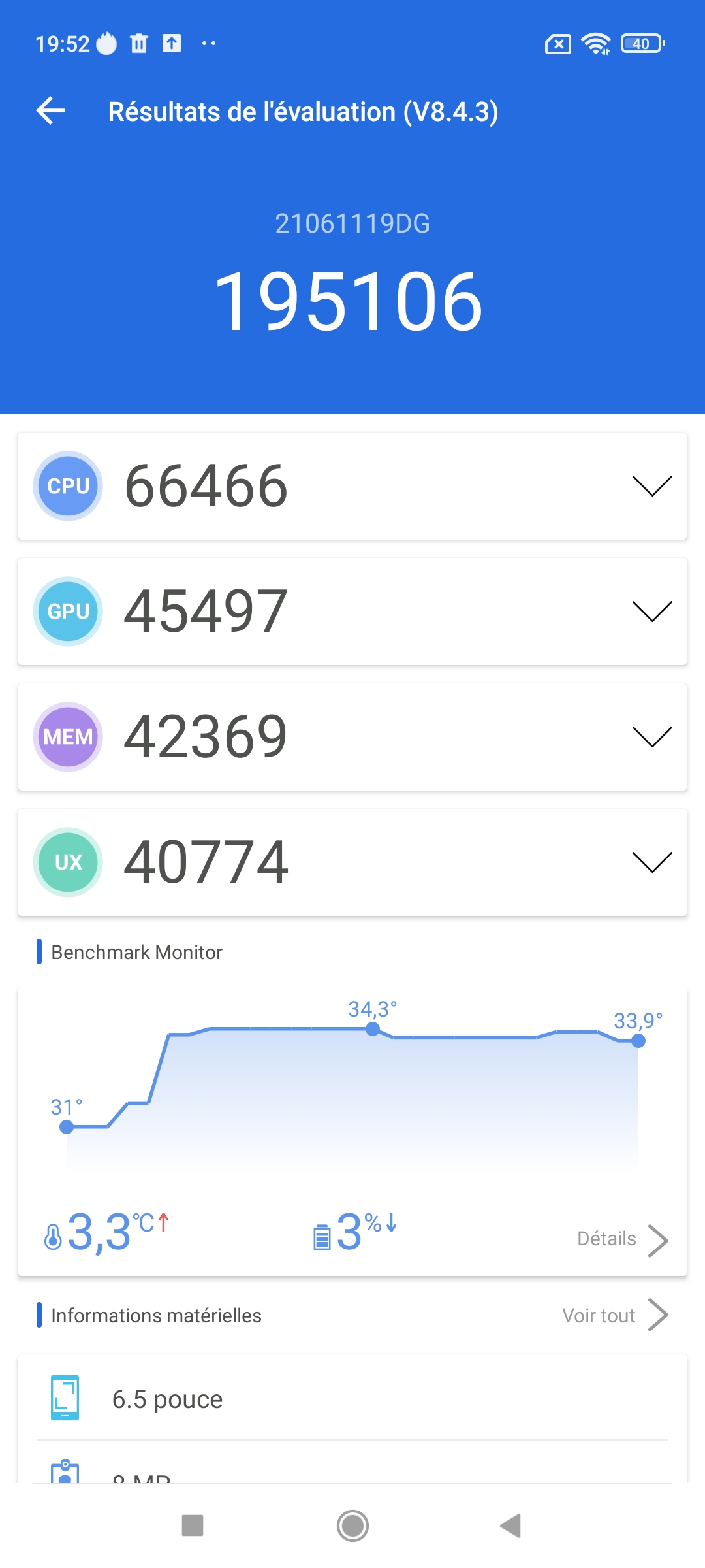 Le Redmi 10 n'a pas pour vocation d'obtenir un très gros score sur Antutu, j'ai obtenu un peu moins de 200 000 points et cela situe ce téléphone au niveau du Redmi Note 9. Avec ce niveau de performance, vous avez un téléphone suffisamment réactif pour toutes les taches du quotidien. Si vous devez lancer de grosses applications ou si vous voulez jouer à de gros jeux, le téléphone sera moins rapide et moins réactif.Gaming