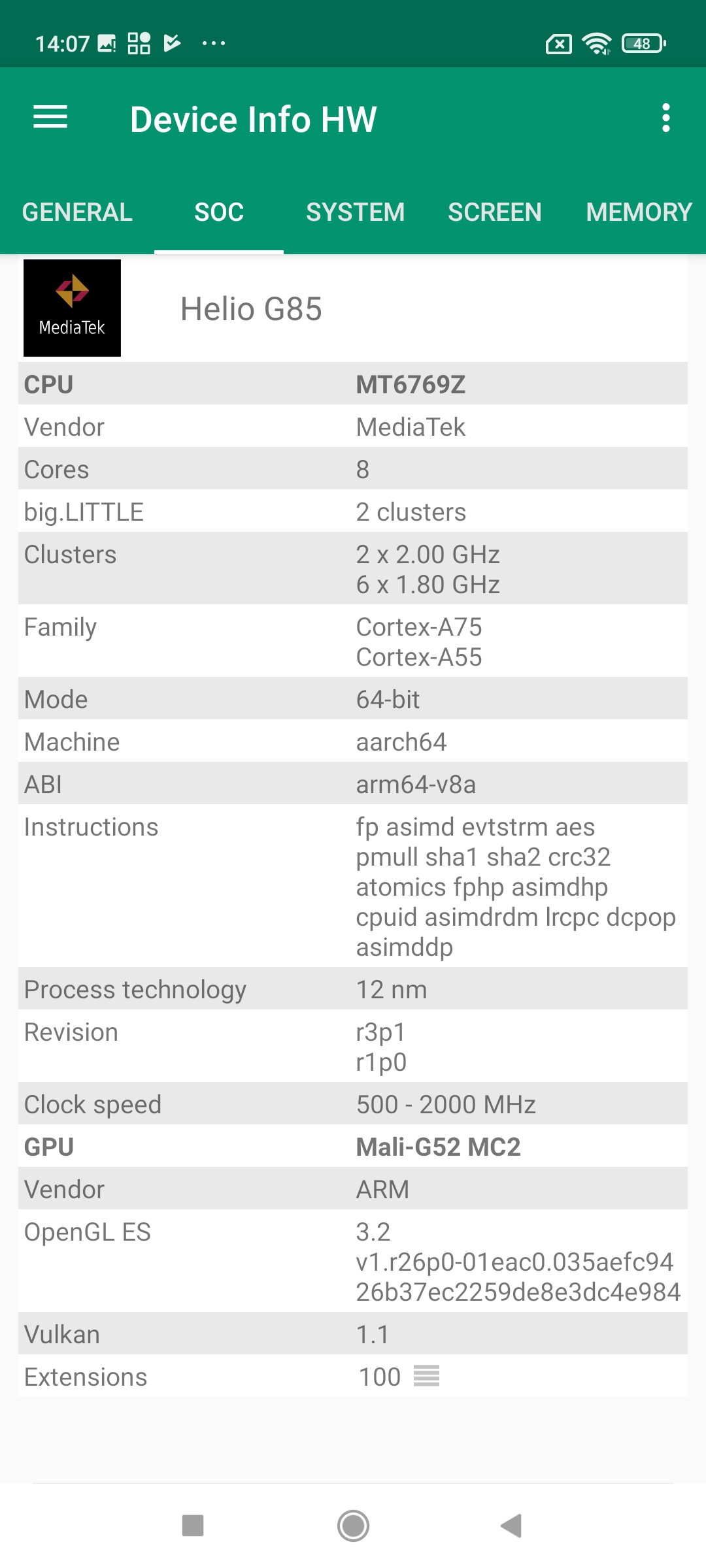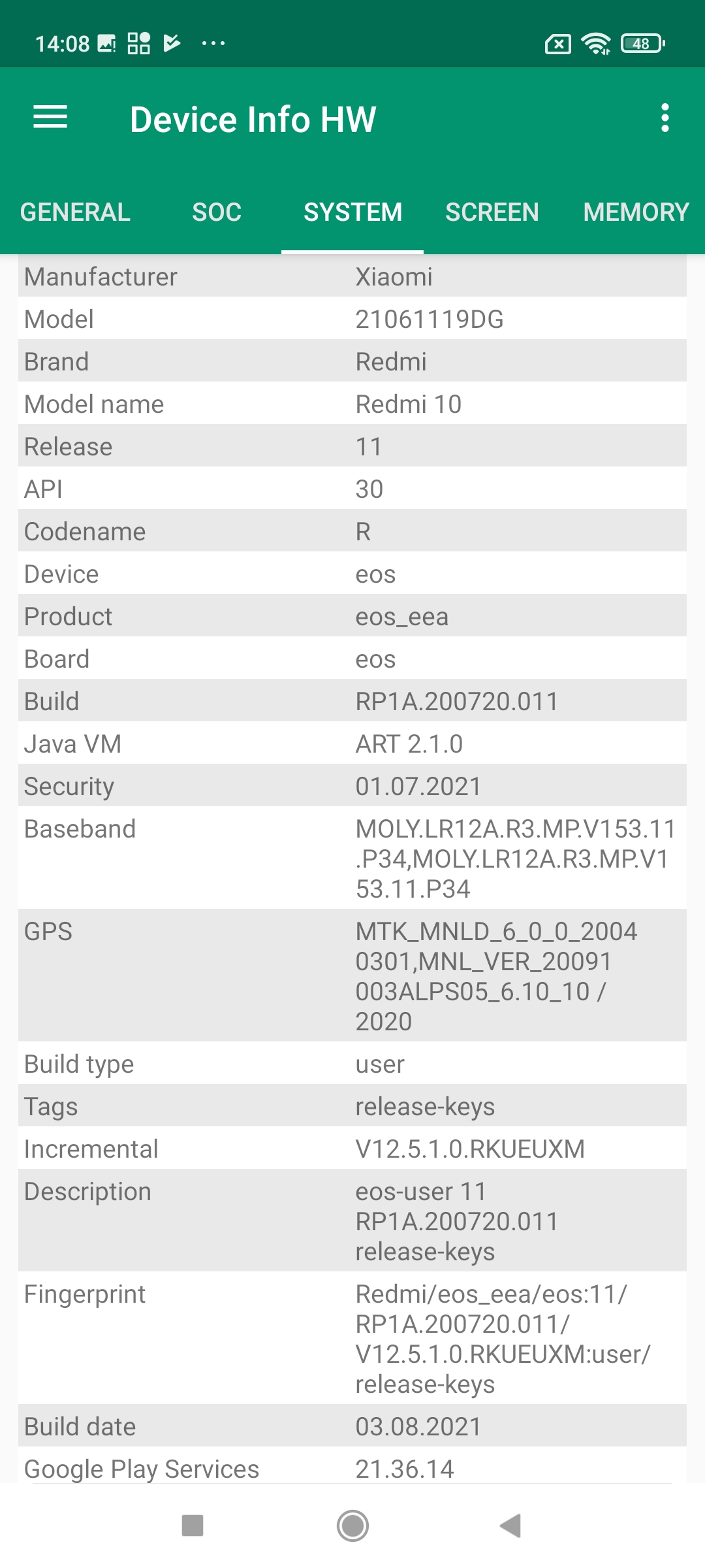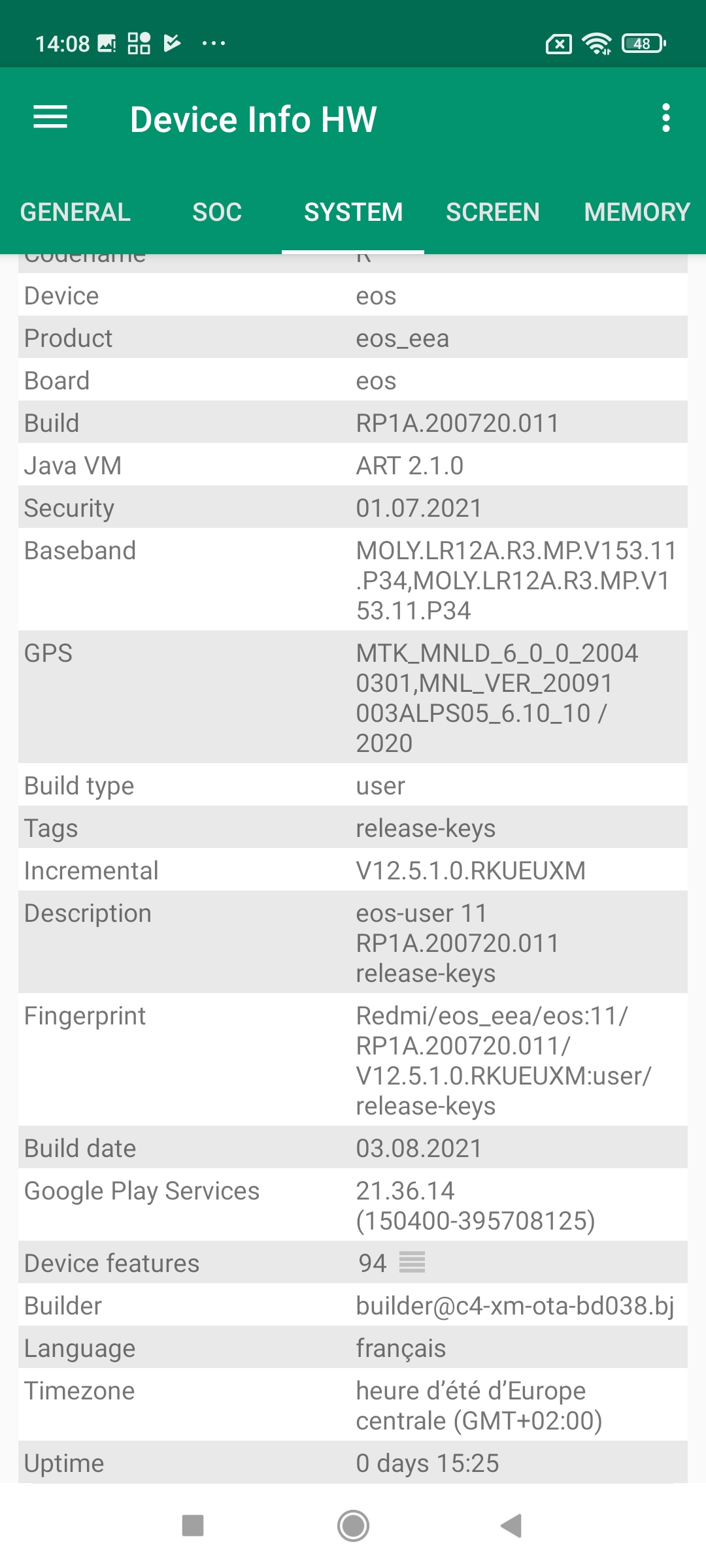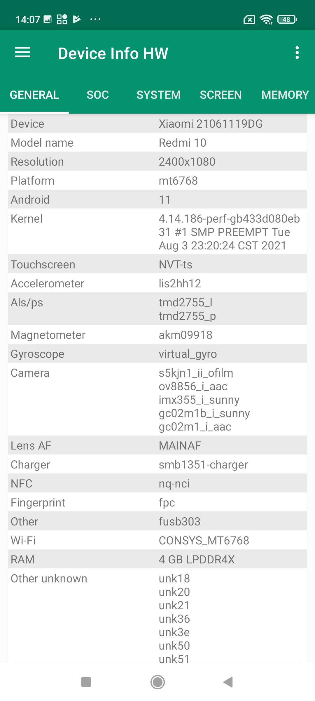 Les informations ci-dessous proviennent de l'application Device Info HW. L'application fournit des informations techniques détaillées sur le téléphone testé.J'ai acheté le Redmi 10 dans sa version 4Gb / 64 Gb (version blanche), vous retrouverez les caractéristiques techniques dans les captures d'écran suivantes.