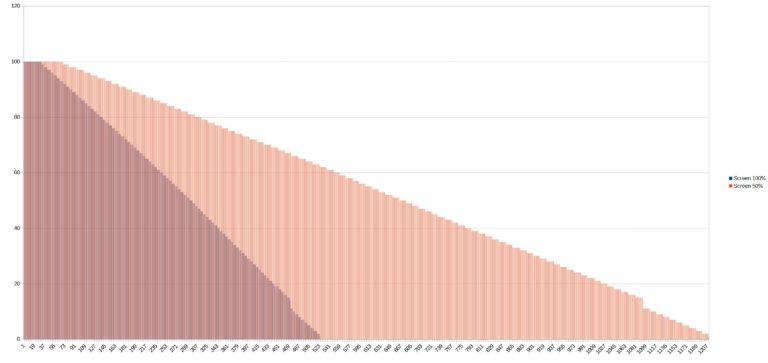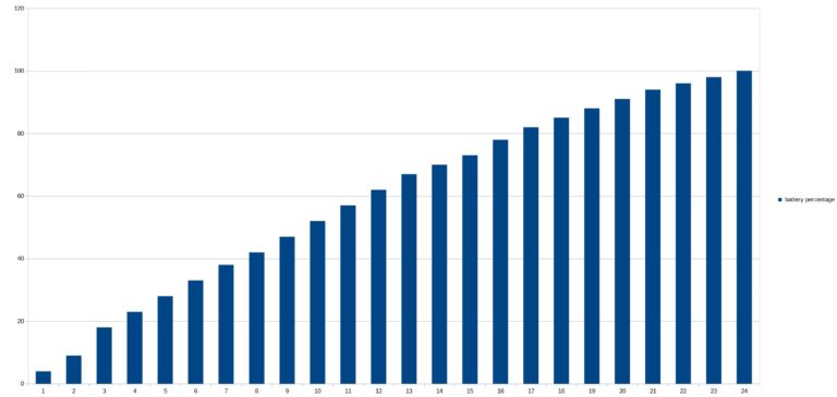 Pour tester l'autonomie des batteries j'ai développé une application qui mesure le niveau de batterie minute par minute jusqu'à ce que la batterie soit vide. Cette application consomme environ une dizaine de pourcent des ressources du téléphone et je fais un test avec une luminosité d'écran à 100% et un autre avec une luminosité à 50%. Ce test vise à reproduire une utilisation contemplative d'un téléphone (ex: surfer sur internet, lire des articles, passer du temps sur les réseaux sociaux). Ces résultats ne sont pas valables pour une utilisation intensive type gaming/streaming. [battery] Ce téléphone est compatible avec la charge rapide 120W comme le Black Shark 4 Pro, il ne lui faut qu'une vingtaine de minutes pour être chargé complètement et la charge va tellement vite que mon application pour mesurer l'évolution de la charge n'arrive pas à suivre la cadence. La charge est presque linéaire, elle ralentit un peu à la fin mais cela ne se voit pas tellement la charge est rapide.