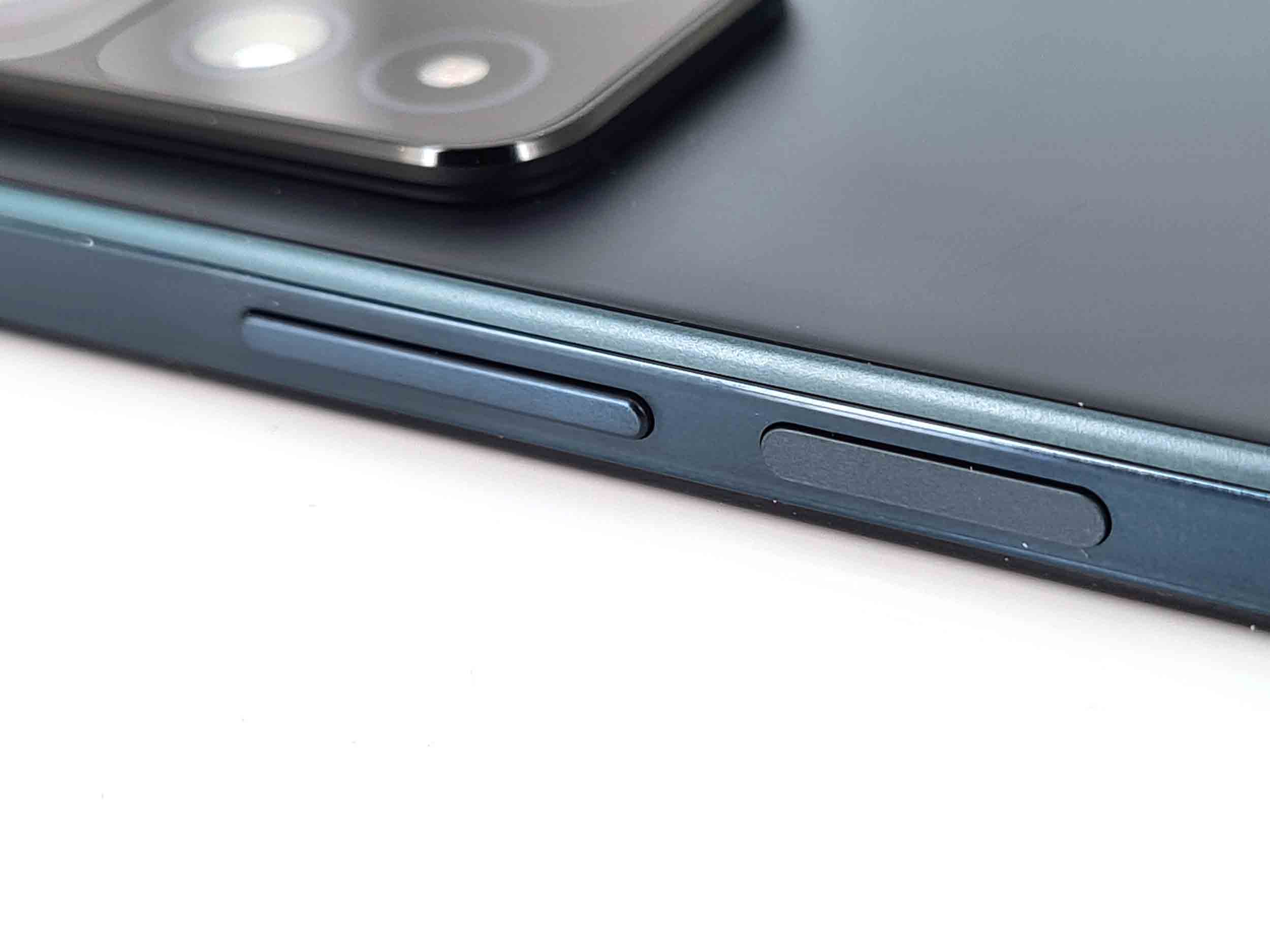 Sur le côté, on retrouve les habituels boutons de volume et d'allumage, ces boutons sont très fins et très bien intégrés dans le téléphone. Le bouton d'allumage intègre également un capteur d'empreinte.