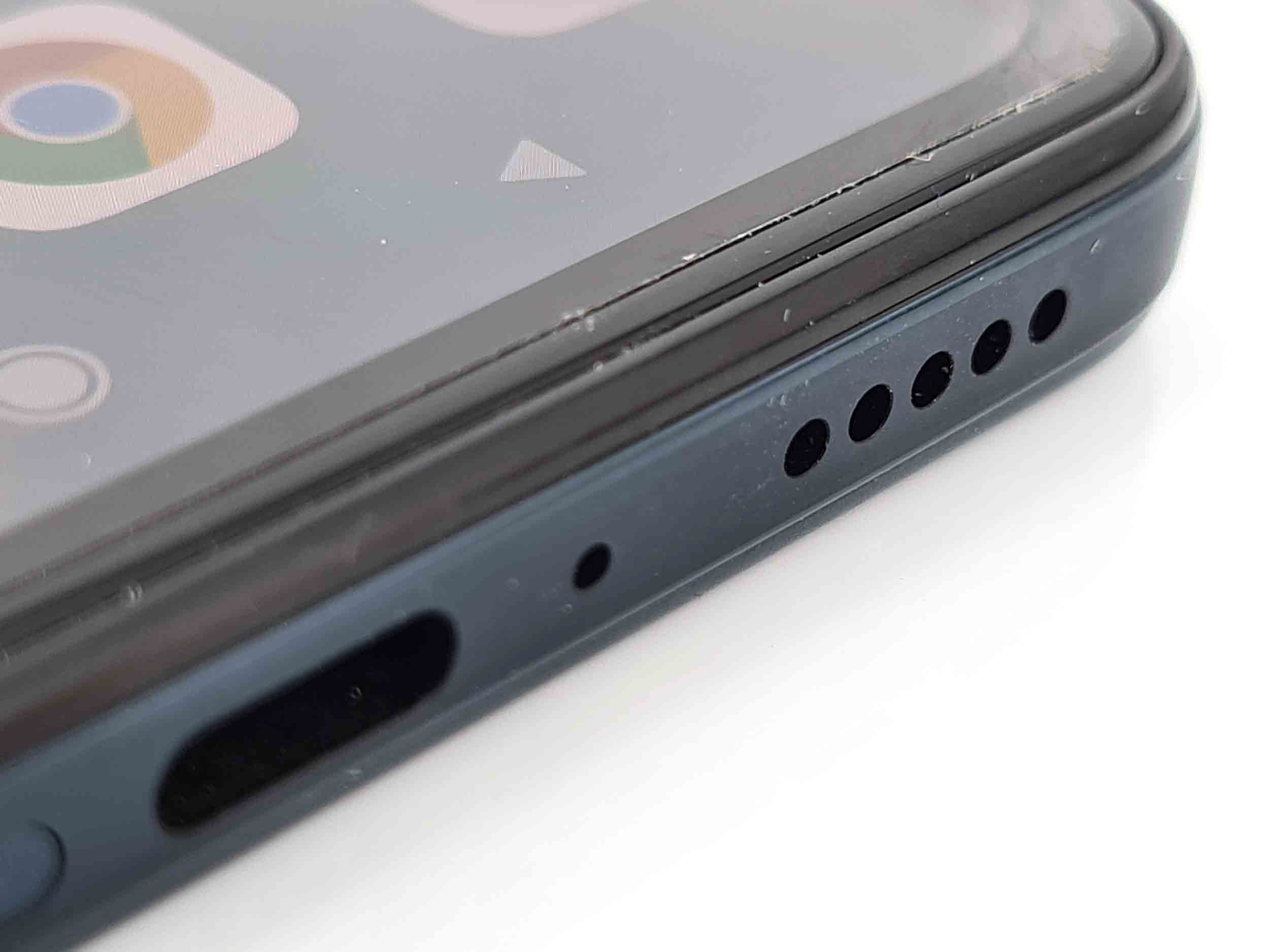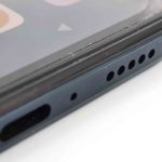 En dessous on retrouve le tiroir sim qui peut contenir 2 cartes sim en mode recto/verso ou une carte sim et une carte mémoire. On y retrouve également un des deux haut-parleurs, un capteur de son et le port USB-C.
